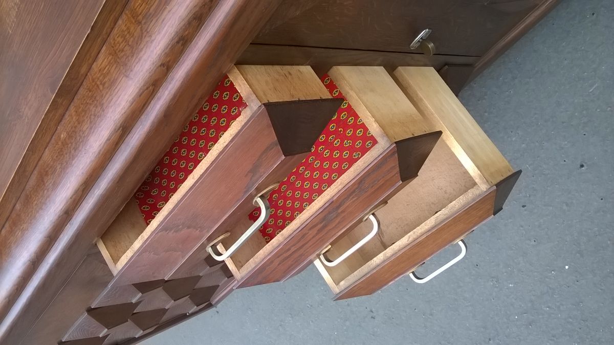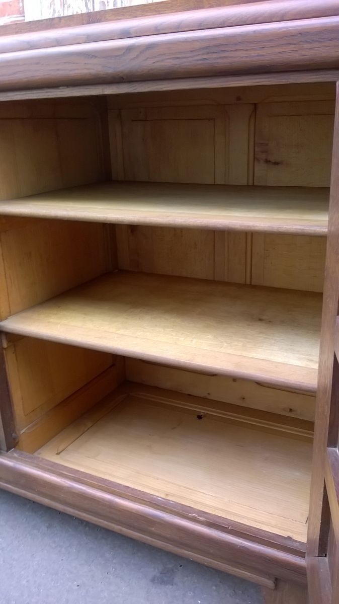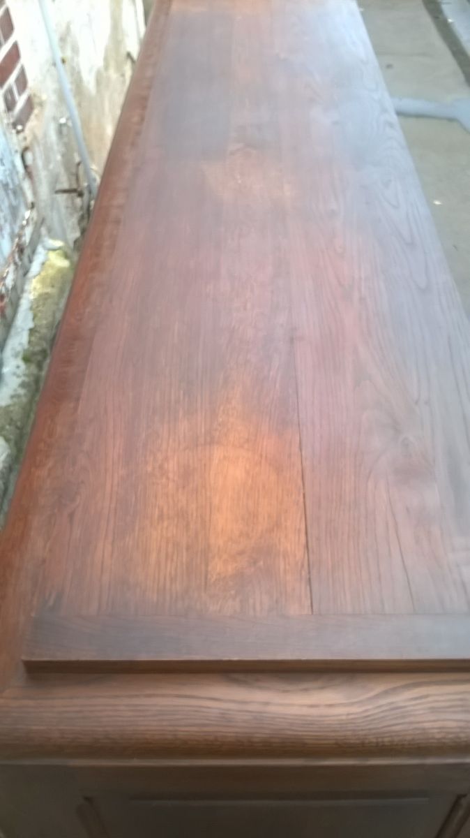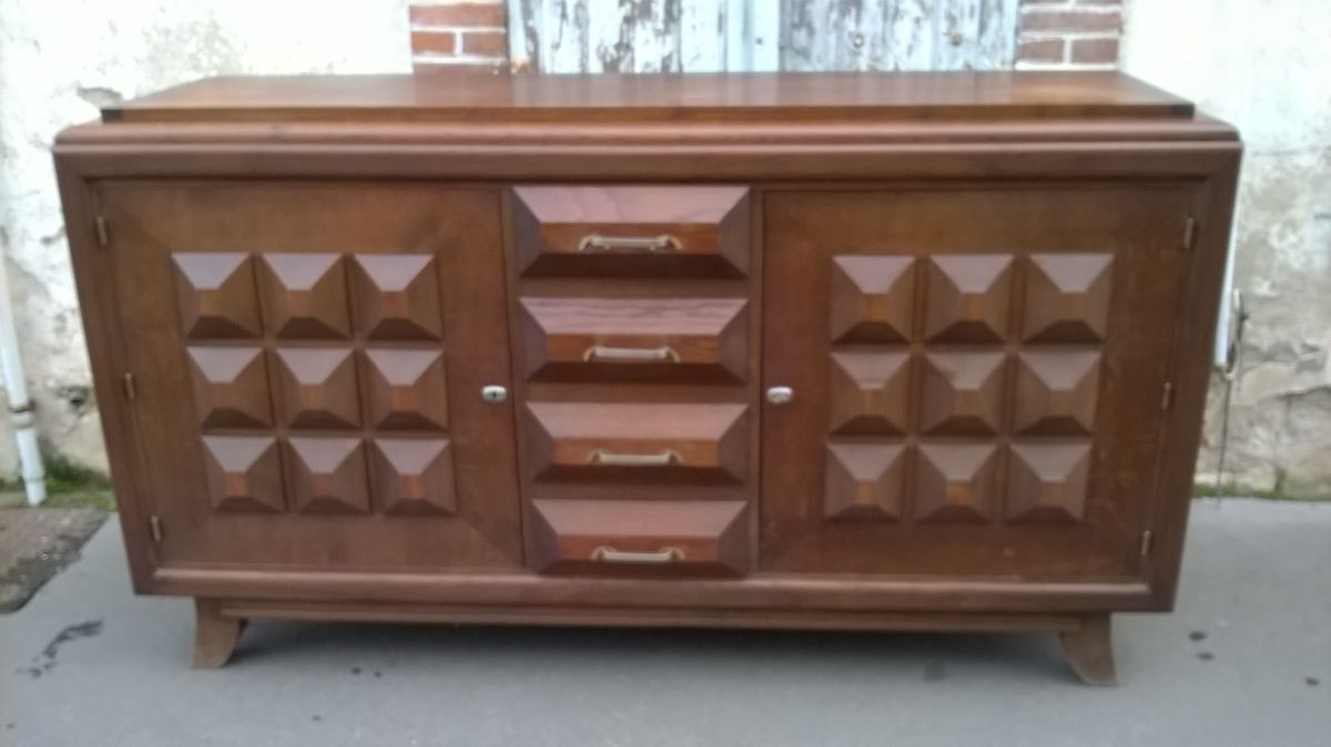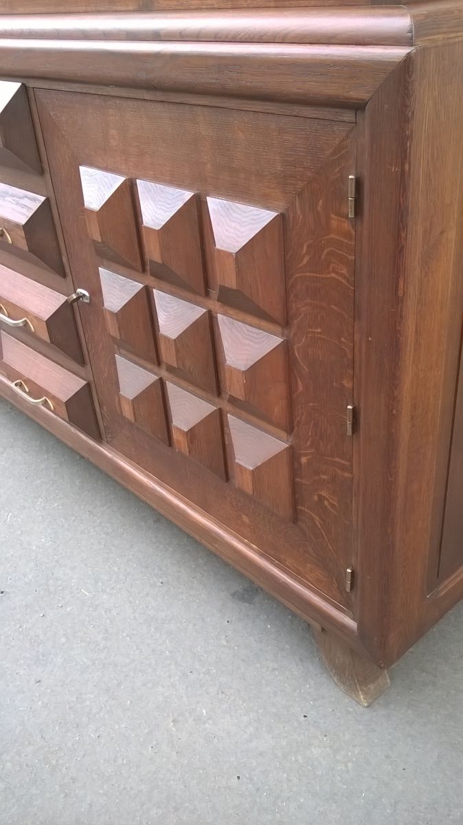 Enfilade en chêne massif brutaliste art déco. Dans le style Charles Dudouyt. Année de fabrication entre 1930 et 1940. Quelque trace de tasse sur le plateau. Le reste est en bon état de conservation. Les serrures sont fonctionnelles. Longueur totale 187 cm. Profondeur 50 cm. Hauteur 107 cm.
