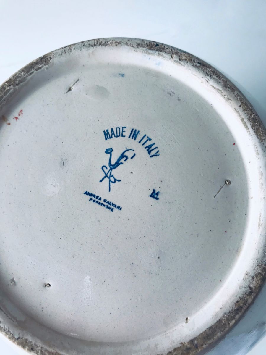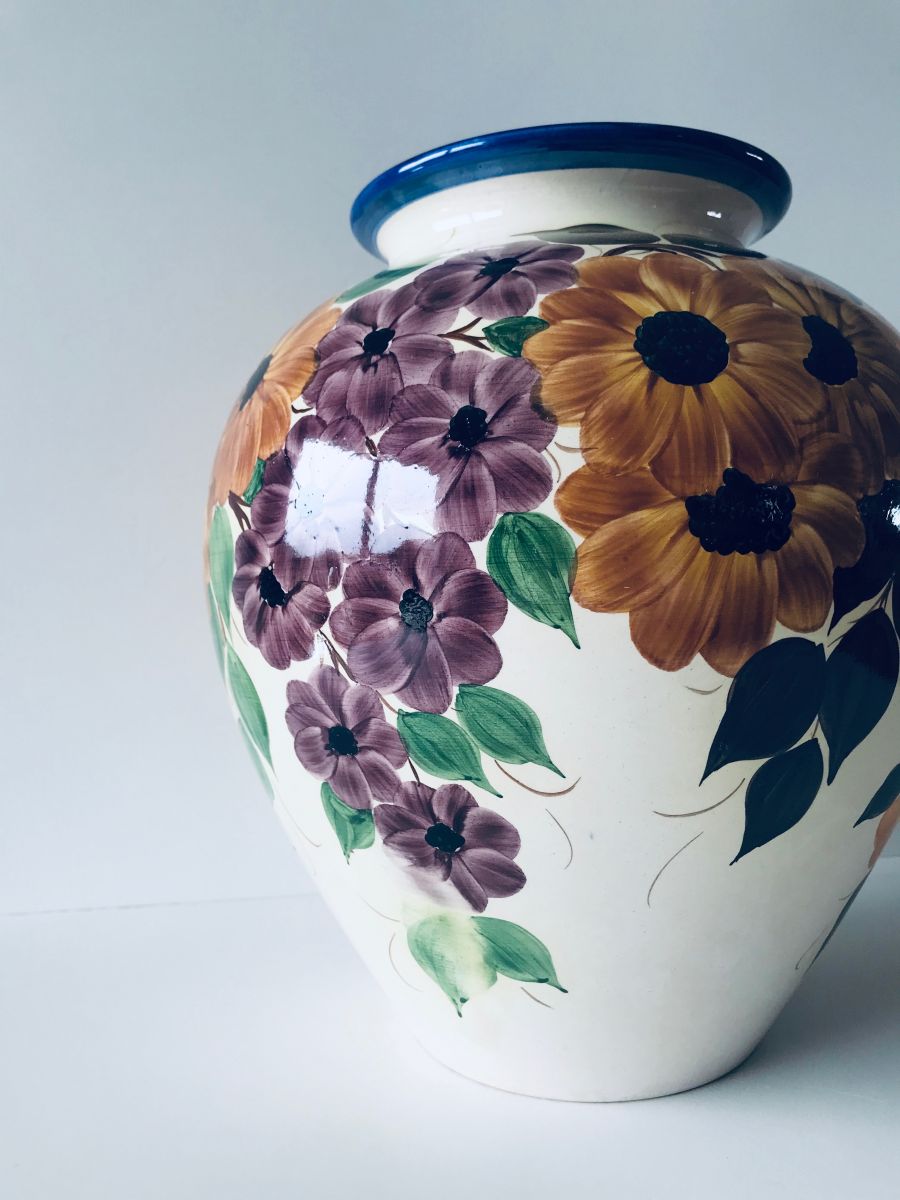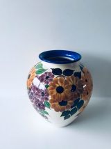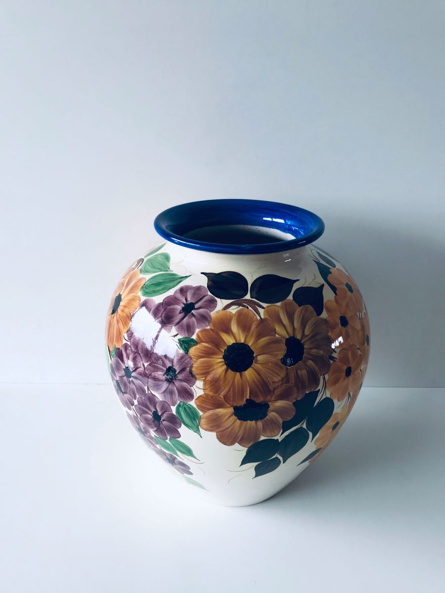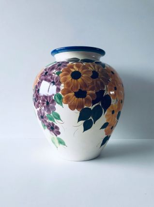 Somptueux et grand vase Italien des années 30 signé Andrea Galvani, Pordenone. Ce superbe et rare vase a énormément de charme. Le décor représente des grosses fleurs peinte à la main dans des couleurs orange, marron et parme. On aime sa forme généreuse qui lui permet d’accueillir les grands bouquets.
