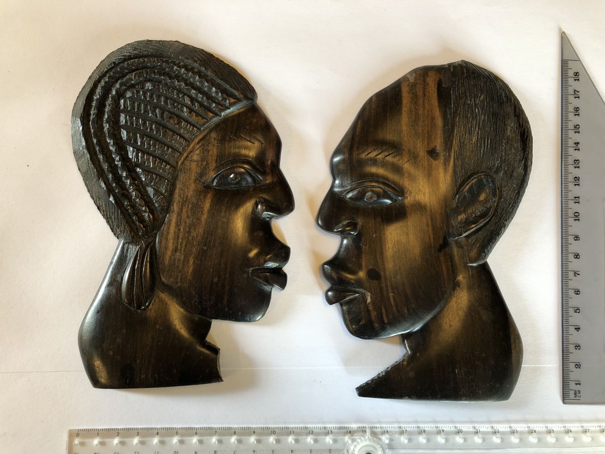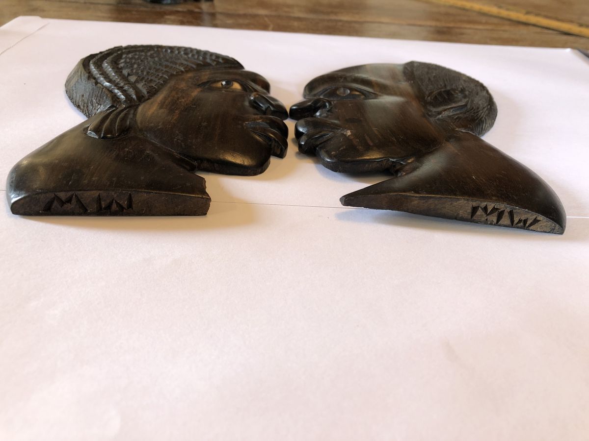 Les têtes sculptées plates sont signées en dessous.
