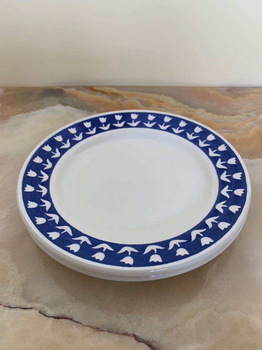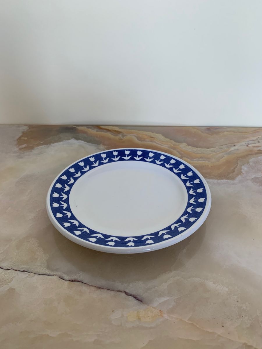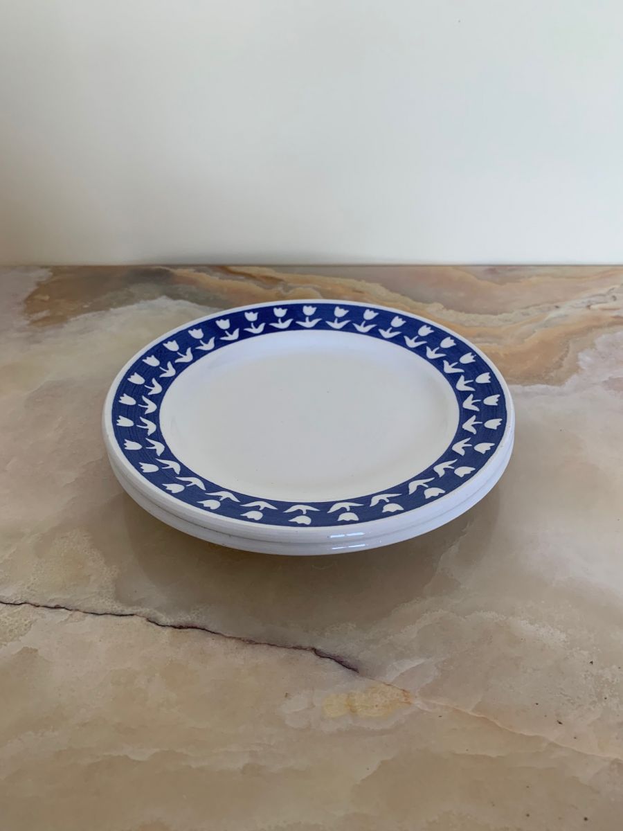 Deux petites assiettes à dessert avec un motif tulipes sur tout le tour.