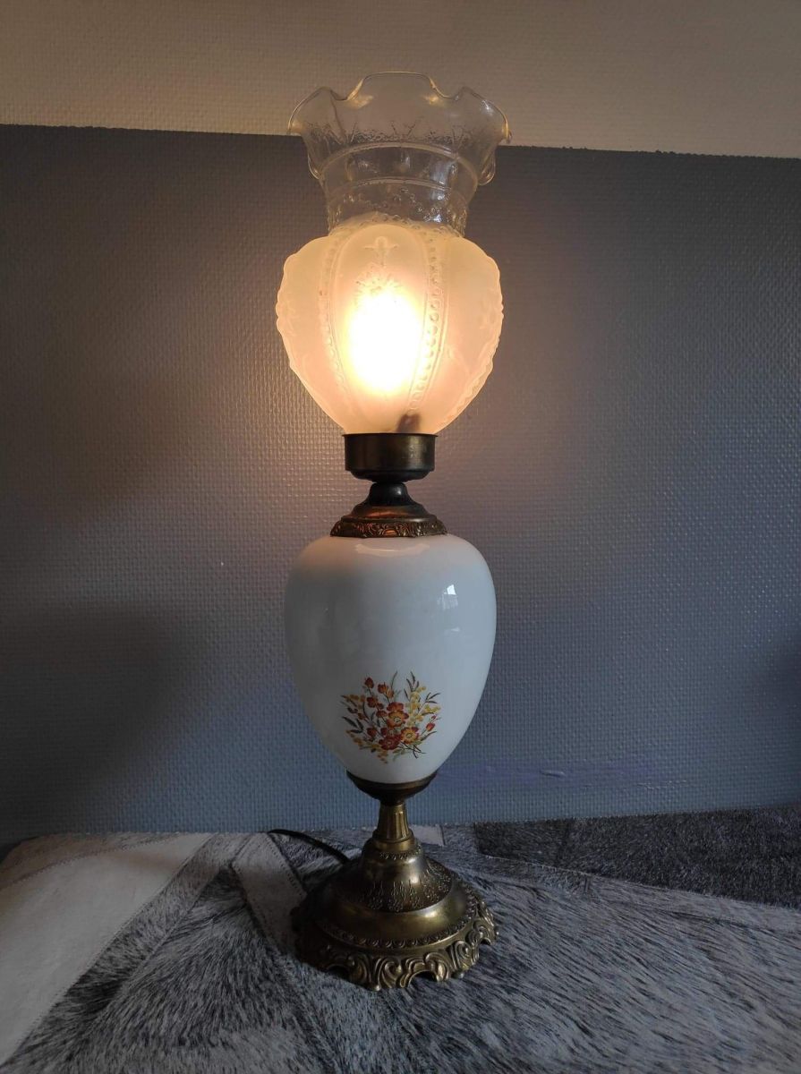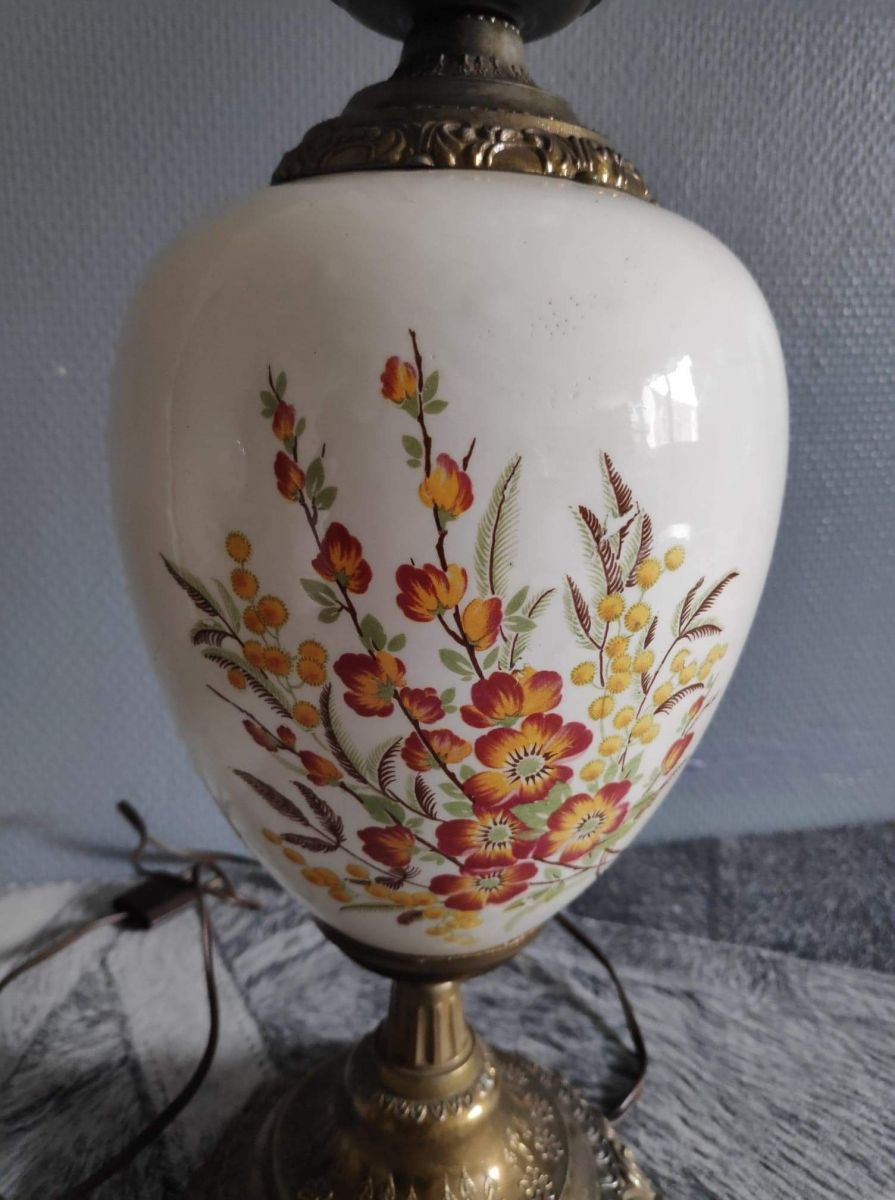 lampe ancienne, pied céramique blanche avec fleurs et laiton