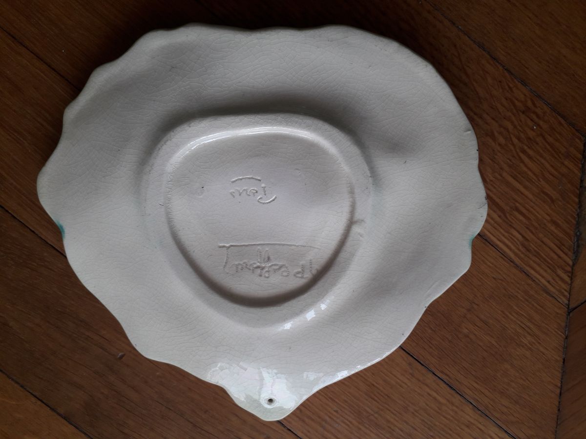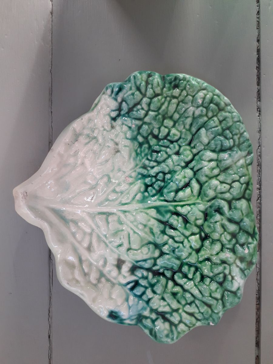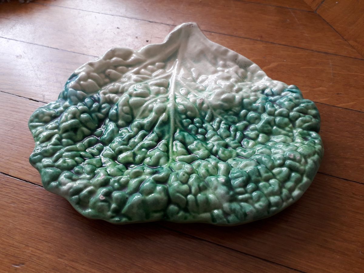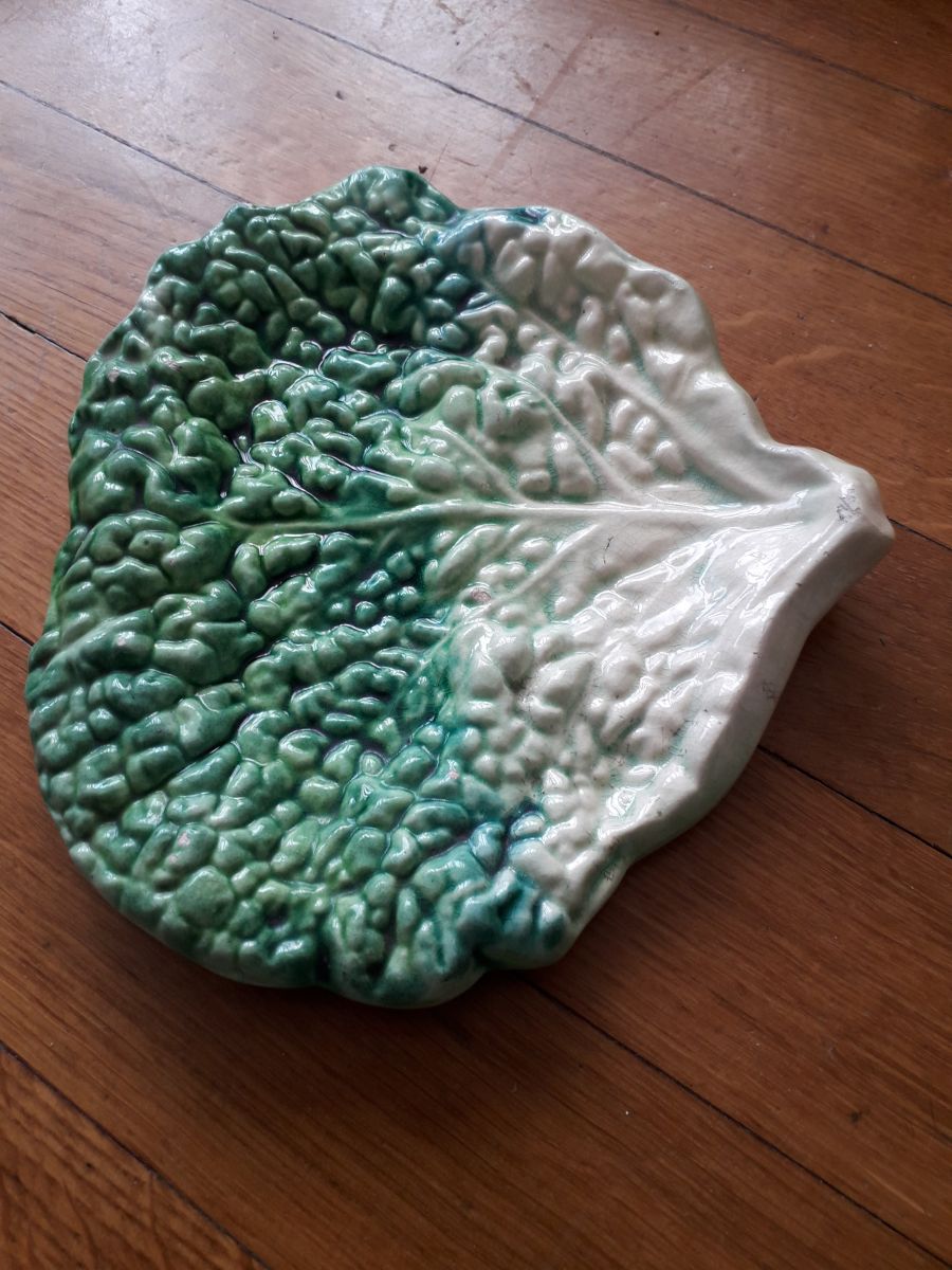 Vide poche vintage en céramique en forme de feuille de choux. La céramique est signée.