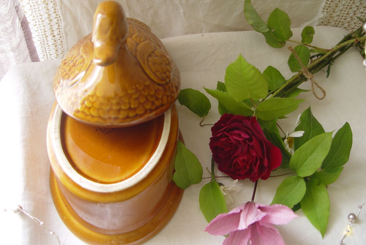 Jolie petite terrine au couvercle en forme de canard en céramique brun moutarde.