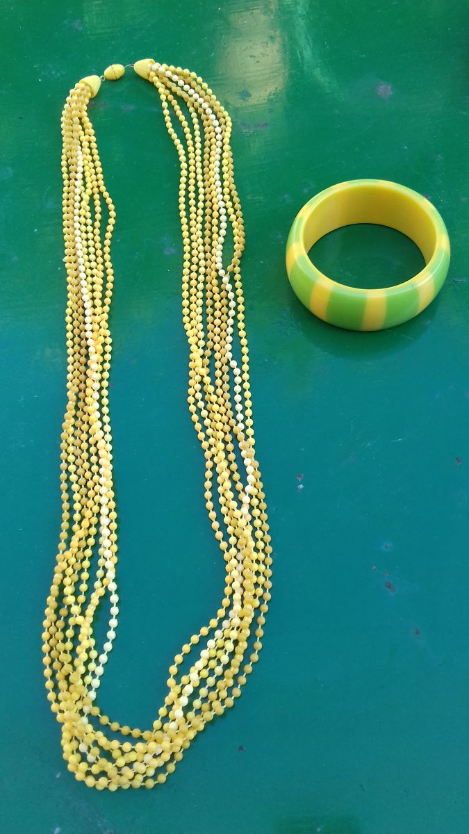 Mélanger les époques!!! Collier différents jaune 8 rangs, années 70. Et bracelet résine années 90 jaune et vert. Vintage et bohème!