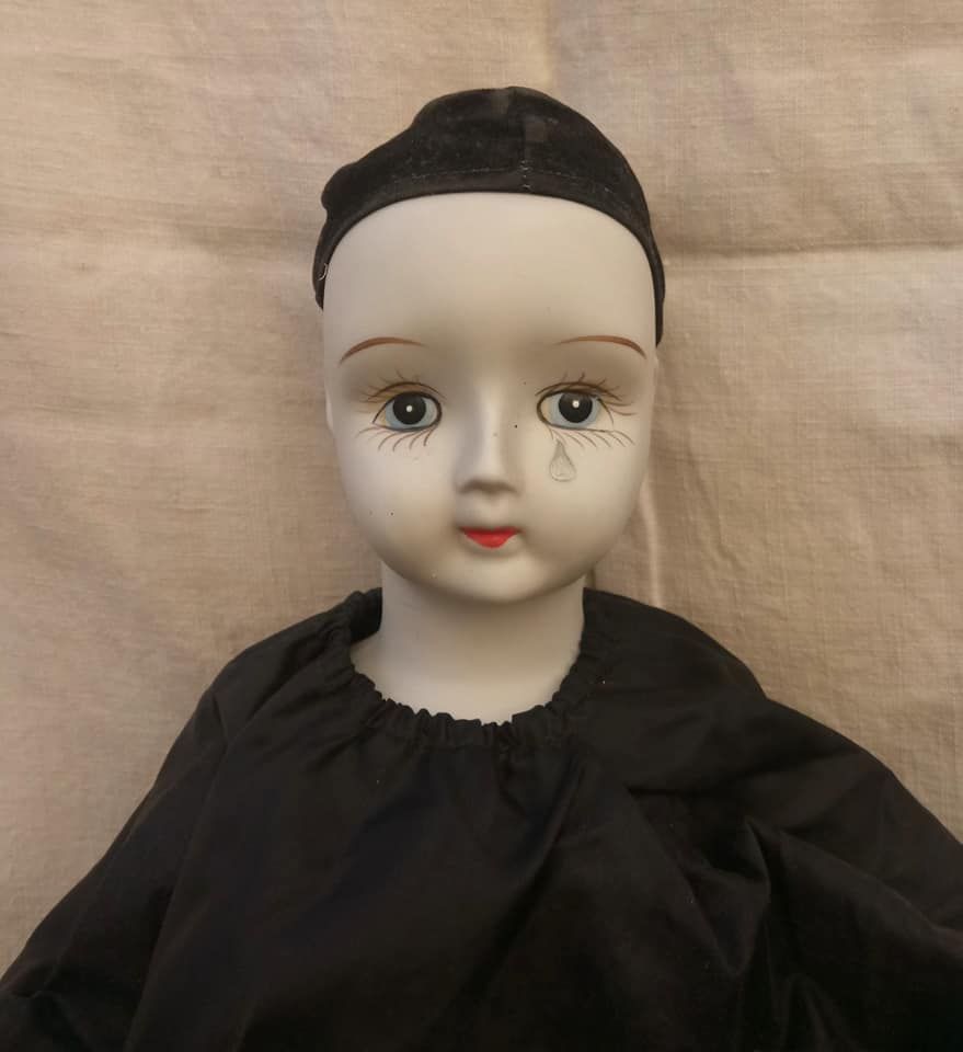Ancienne poupée de Pierrot en céramique et en tissu