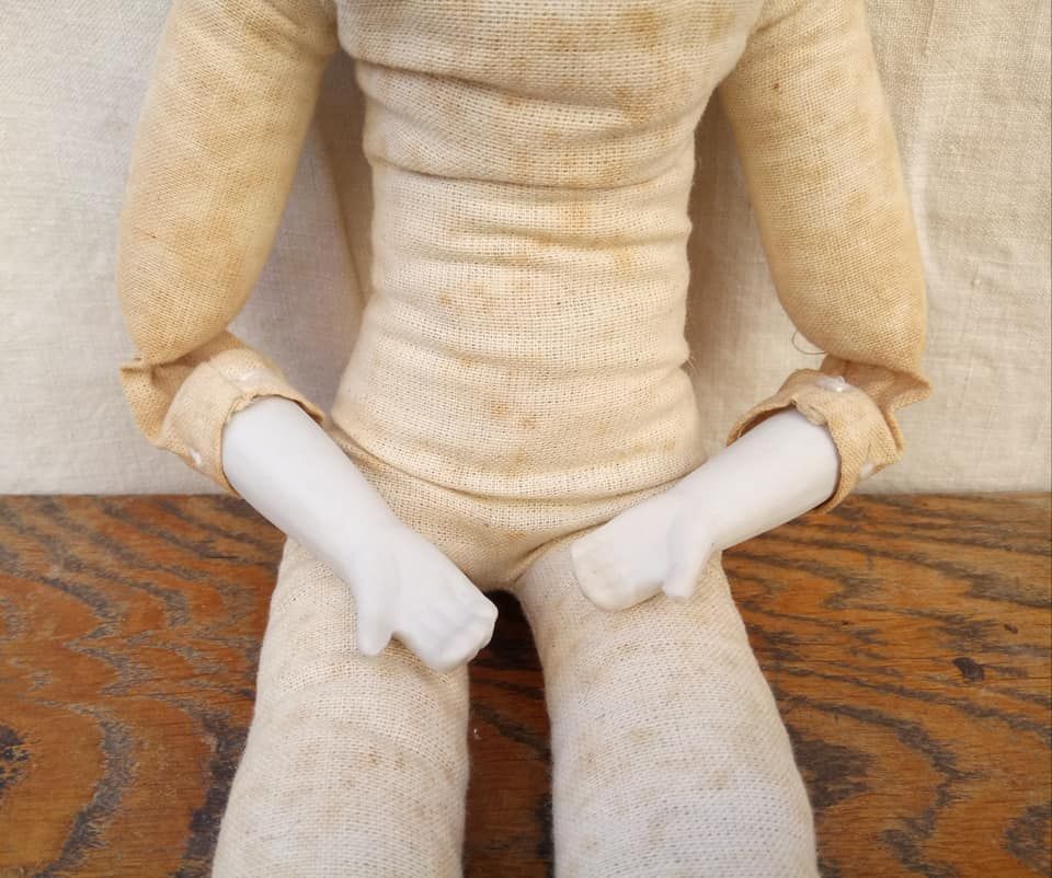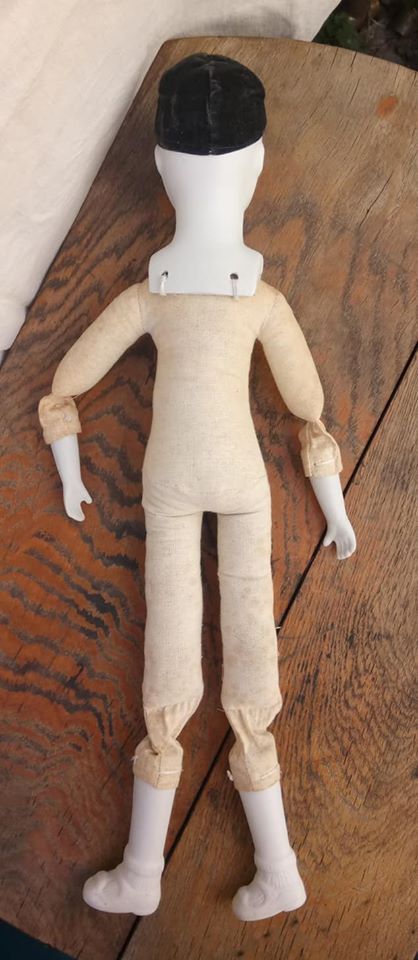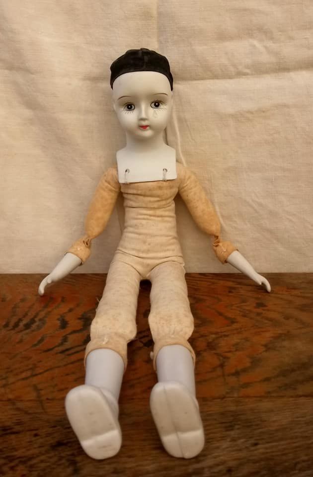 Ancienne poupée de Pierrot en céramique (tête, avant bras et bas de jambes) et tissu