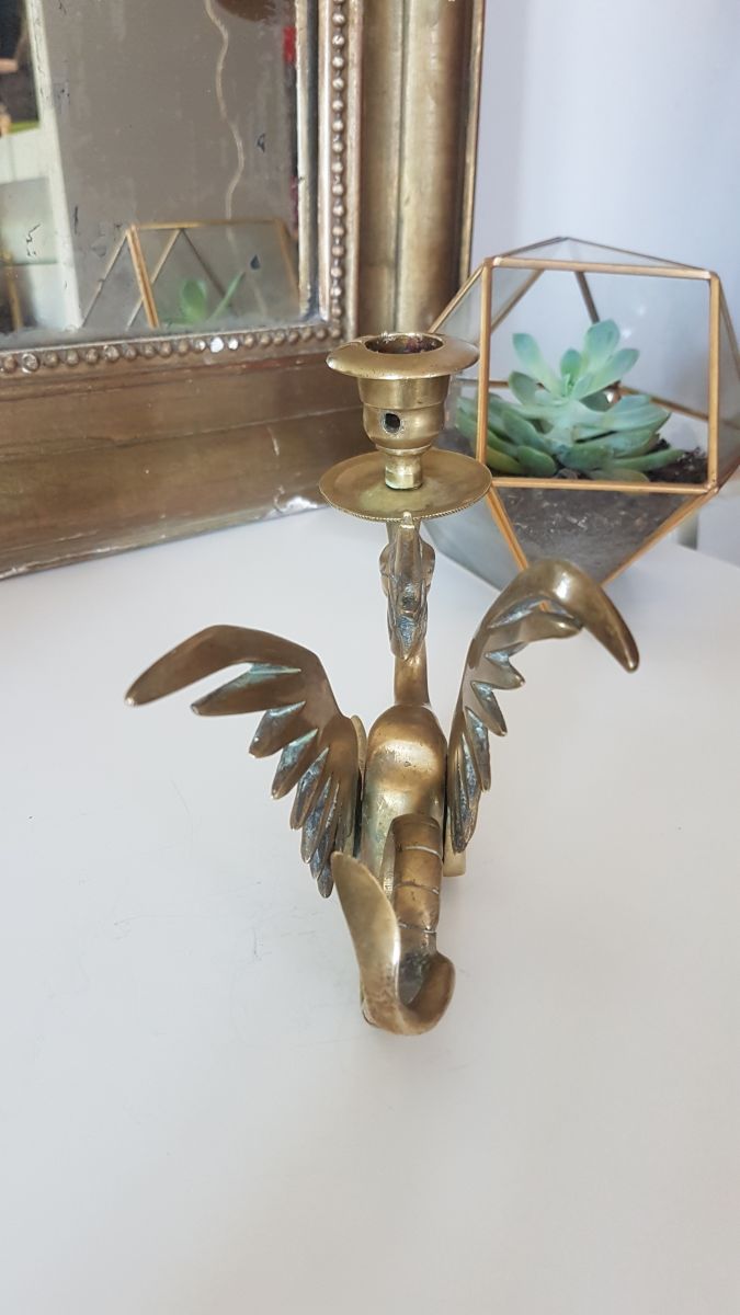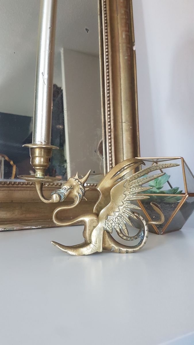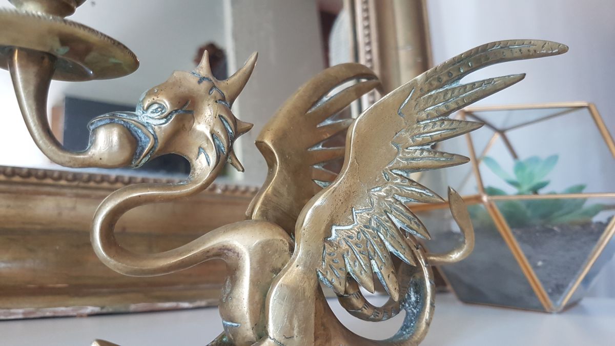 Bougeoirs en métal doré ( laiton) représentant un griffon/Dragon : créature mythique ailée au corps de lion. La tête et les griffes d’un aigle.