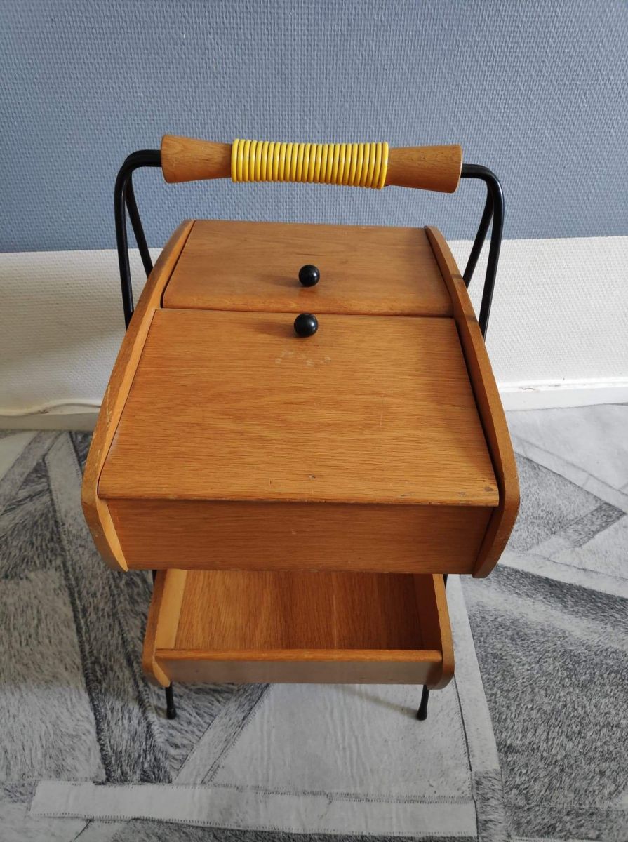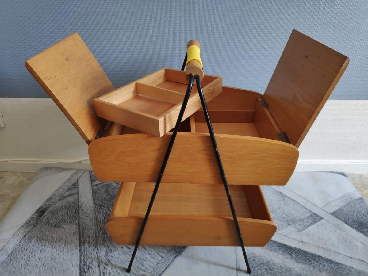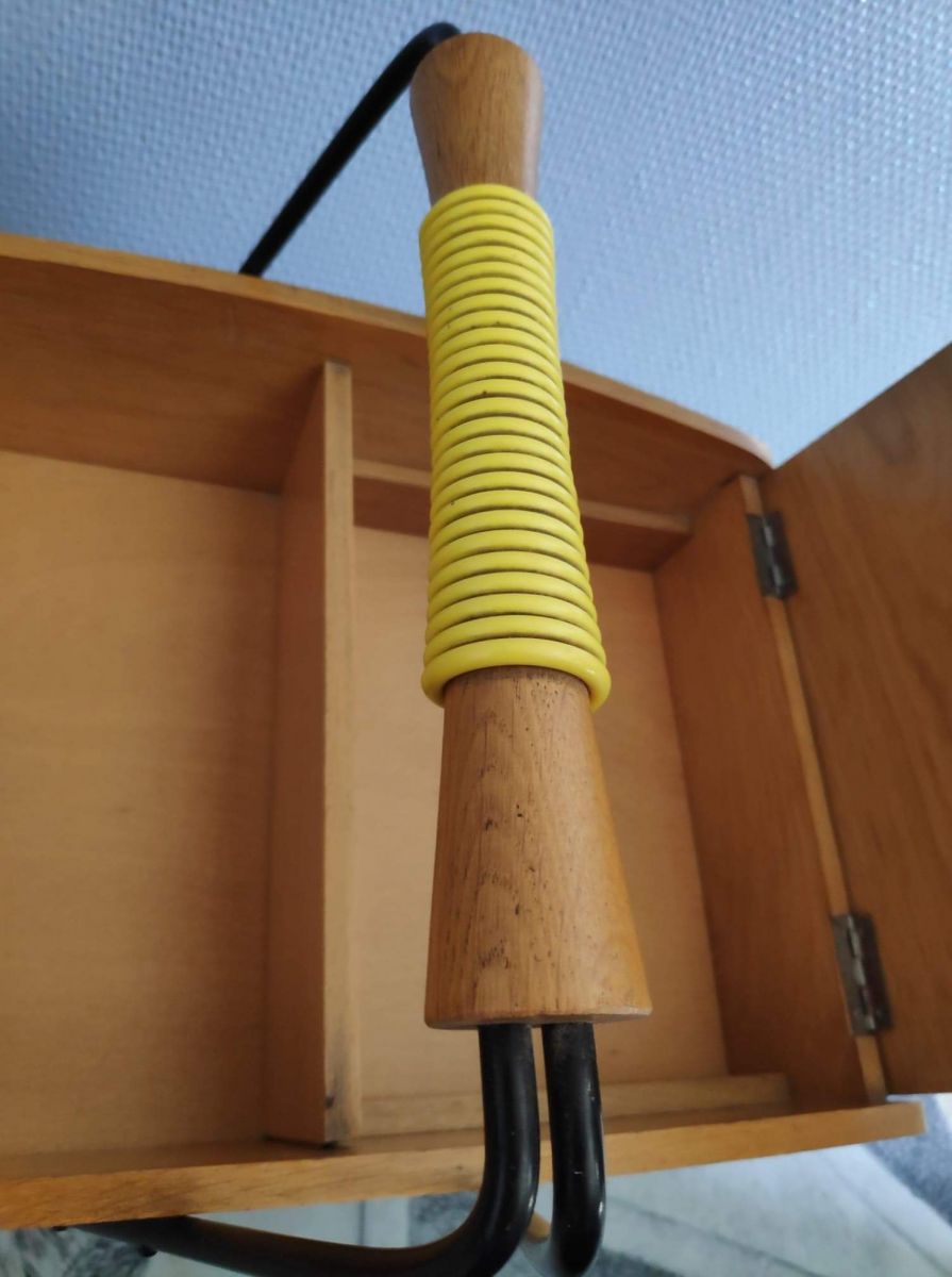 structure en métal noir avec poignée en bois et scoubidou jaune