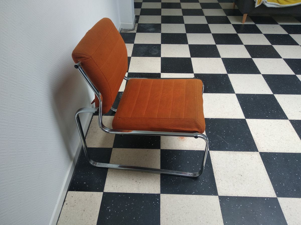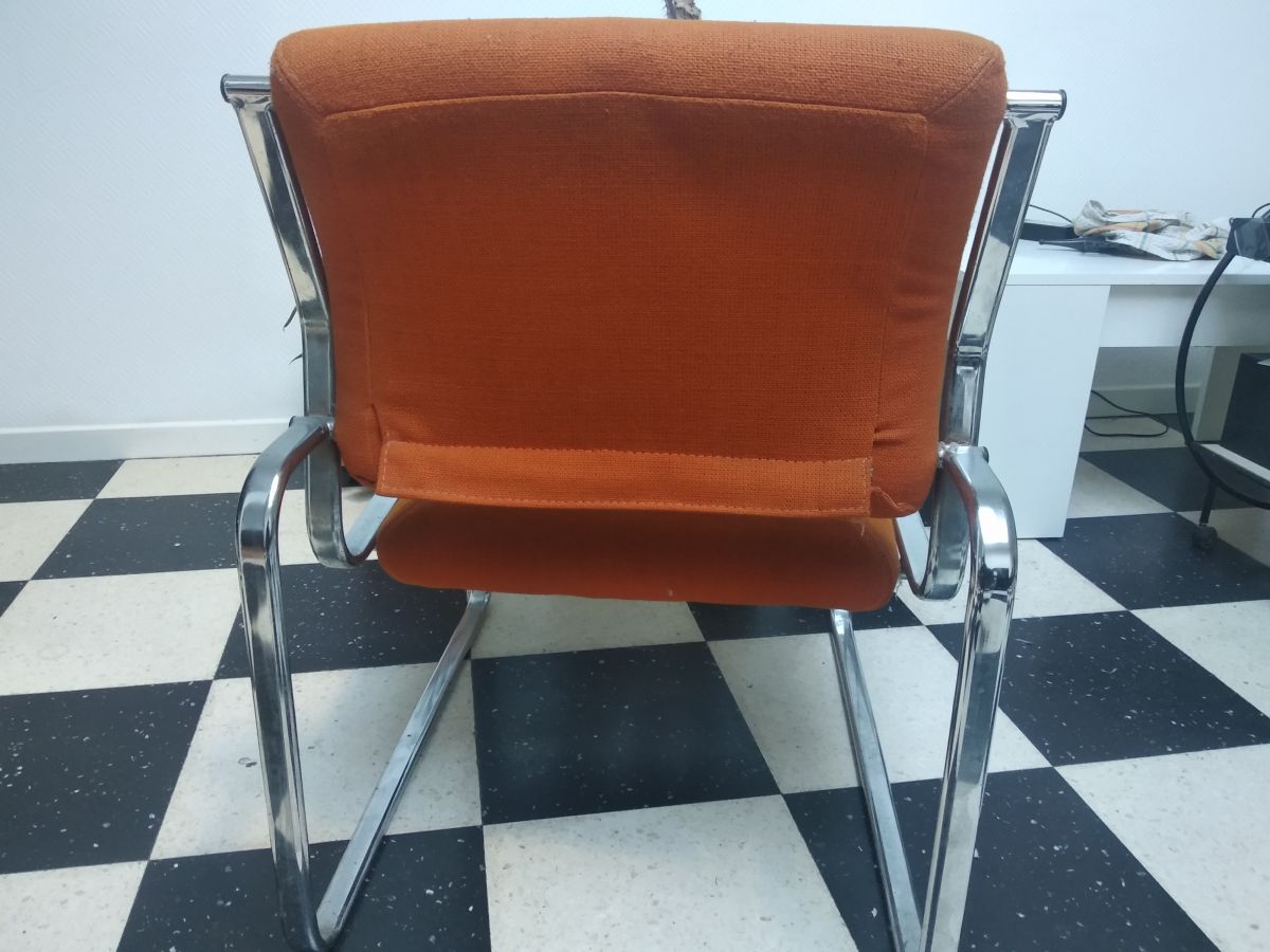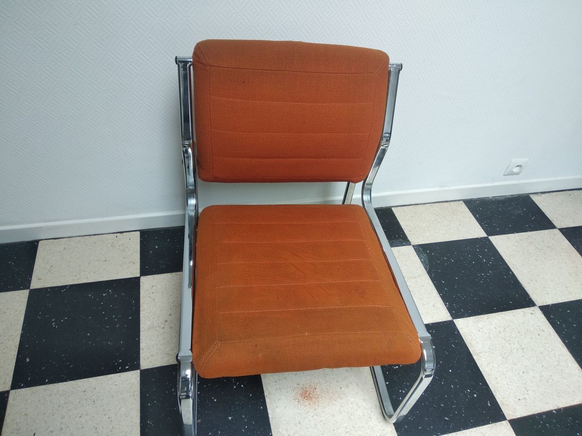 Un fauteuil authentiquement vintage. Le tissus est orange, encore vif. Le cadre est chromé en excellent état. L'assise et le dossier sont fermes et confortables. Pour la livraison je peux gracieusement le faire sur la métropole lilloise. Au delà frais en sus