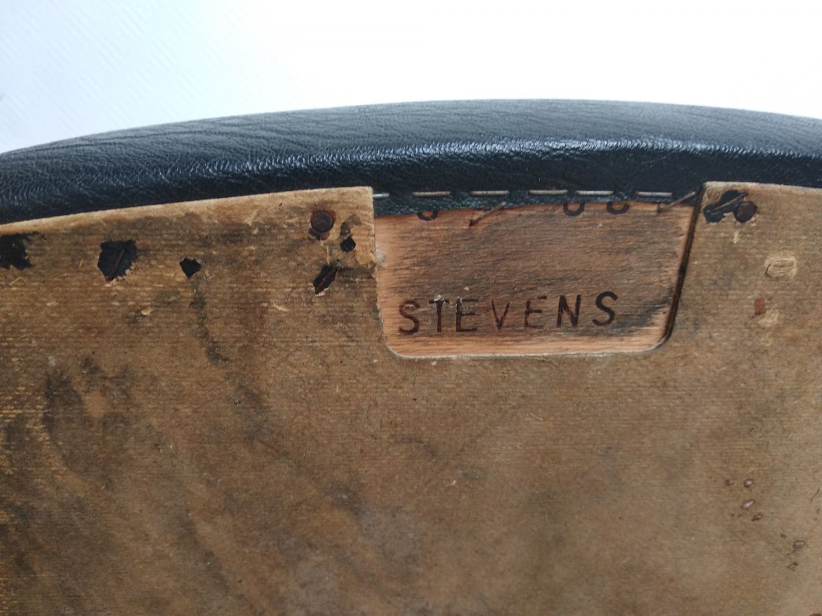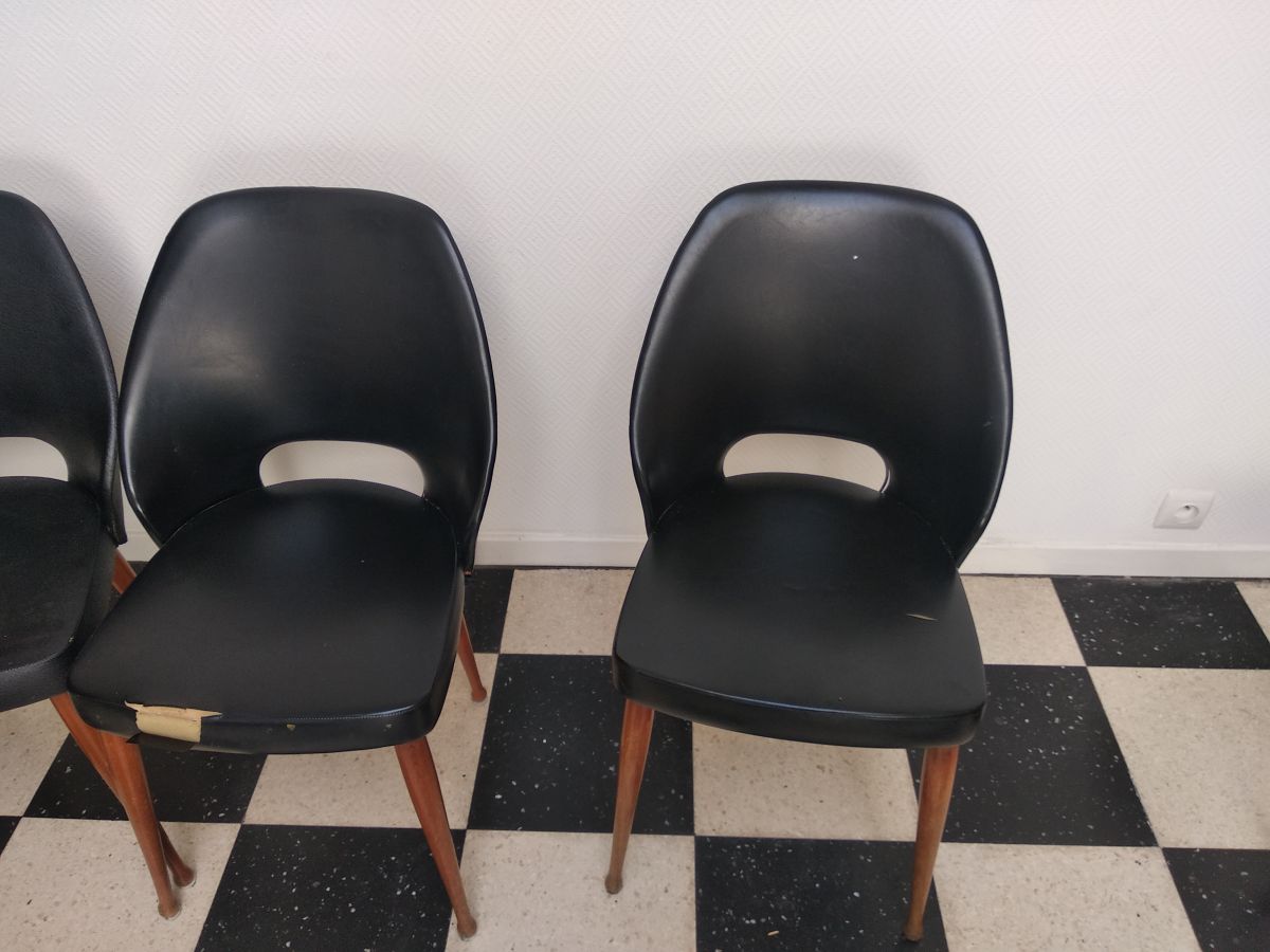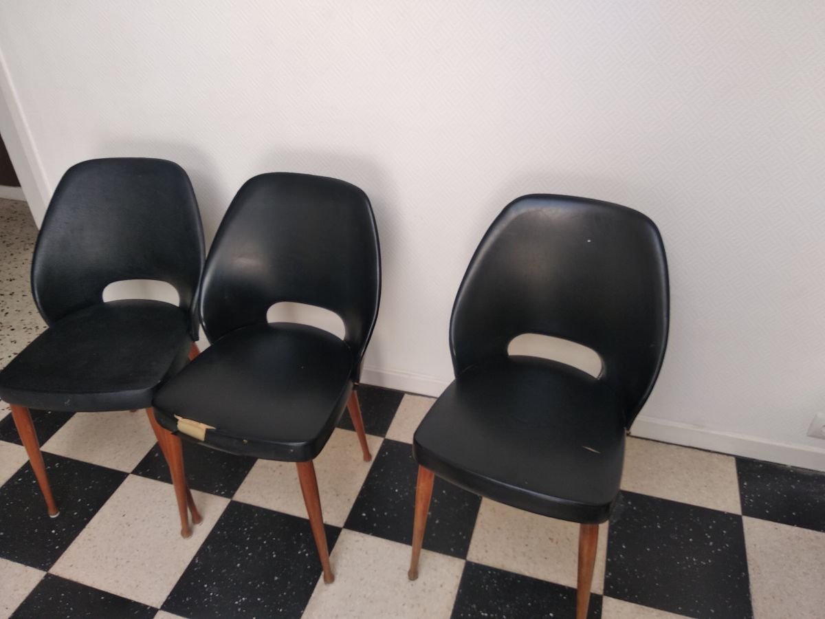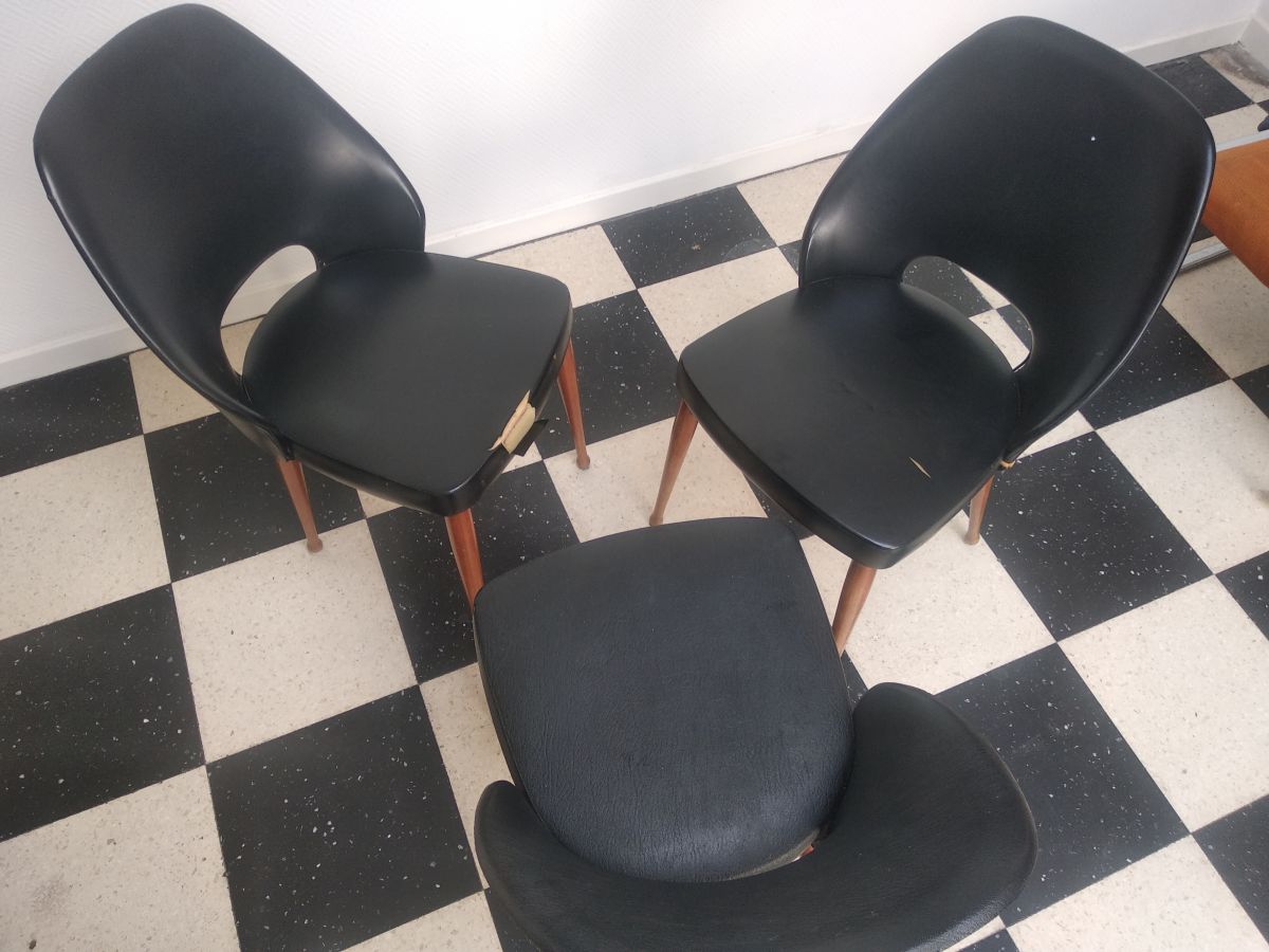 Un lot de 3 chaises vintage style scandinave Pays Bas sérigraphié "Stevens" sur chaque chaises. Pieds compas en bois, assise et dossier en PU noir ( similicuir). Cf photos. État général moyen mais encore robuste et fonctionnel.