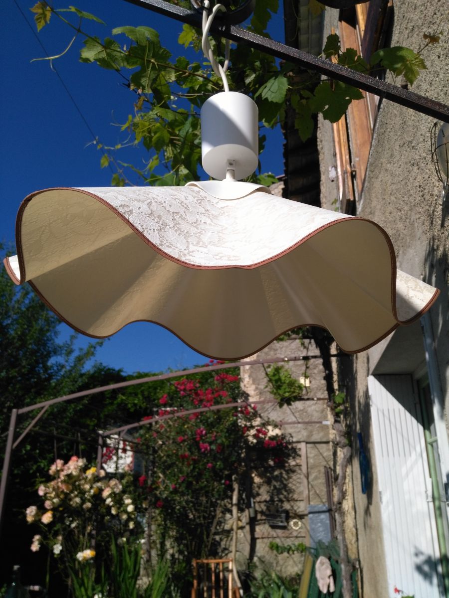 Esprit bohème pour cette chouette suspension en plastique blanc et dessus dentelle, à la lumière de dessous on devine bien les fins dessins