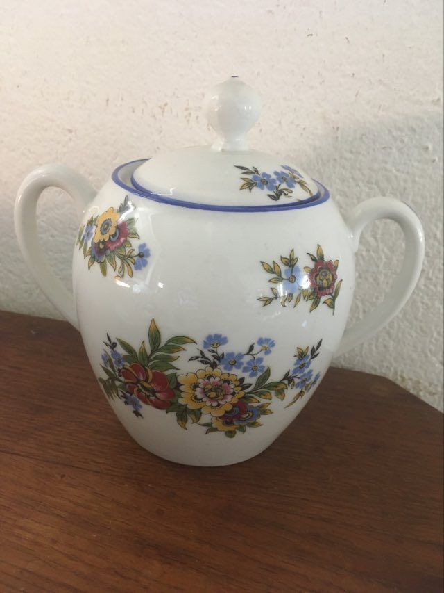 Grand sucrier en porcelaine fine à fleurs à la bordure bleue .