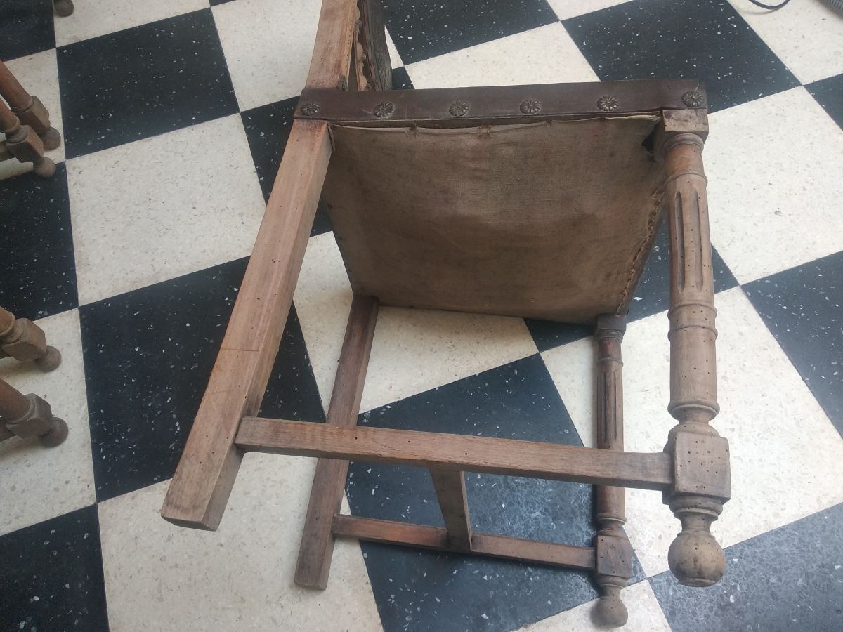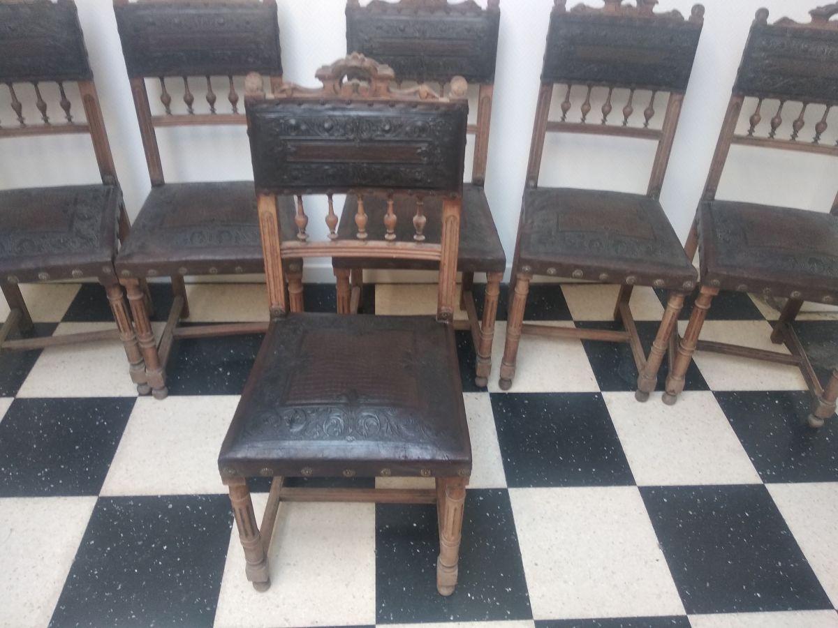 Un lot de 6 chaises authentique henri II en cuir gaufré/repoussé ( où cuir de cordoue) en motif "feuilles d'acanthe" et bois sculpté. Ce style henri II typique du XIX siècle. Le cuir est maintenu par des clous stylisés. Le tout est en très bon état vu son époque. Présence de trou de mites ( une garantie d'authenticité). Toutes les chaises ont une toile de jute sous l'assise (sauf une). Une des chaise a le flanc légèrement abîmé (bois) mais je le laisse pour ce côté authentique. Je peux (moyennant finance) vous nettoyer et assouplir le cuir pour une meilleure conservation. Le modèle de présentation est restauré par mes soins.