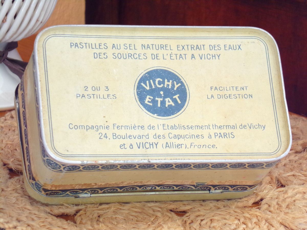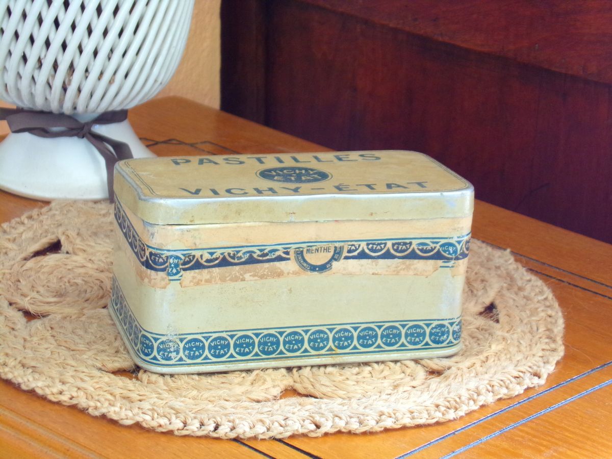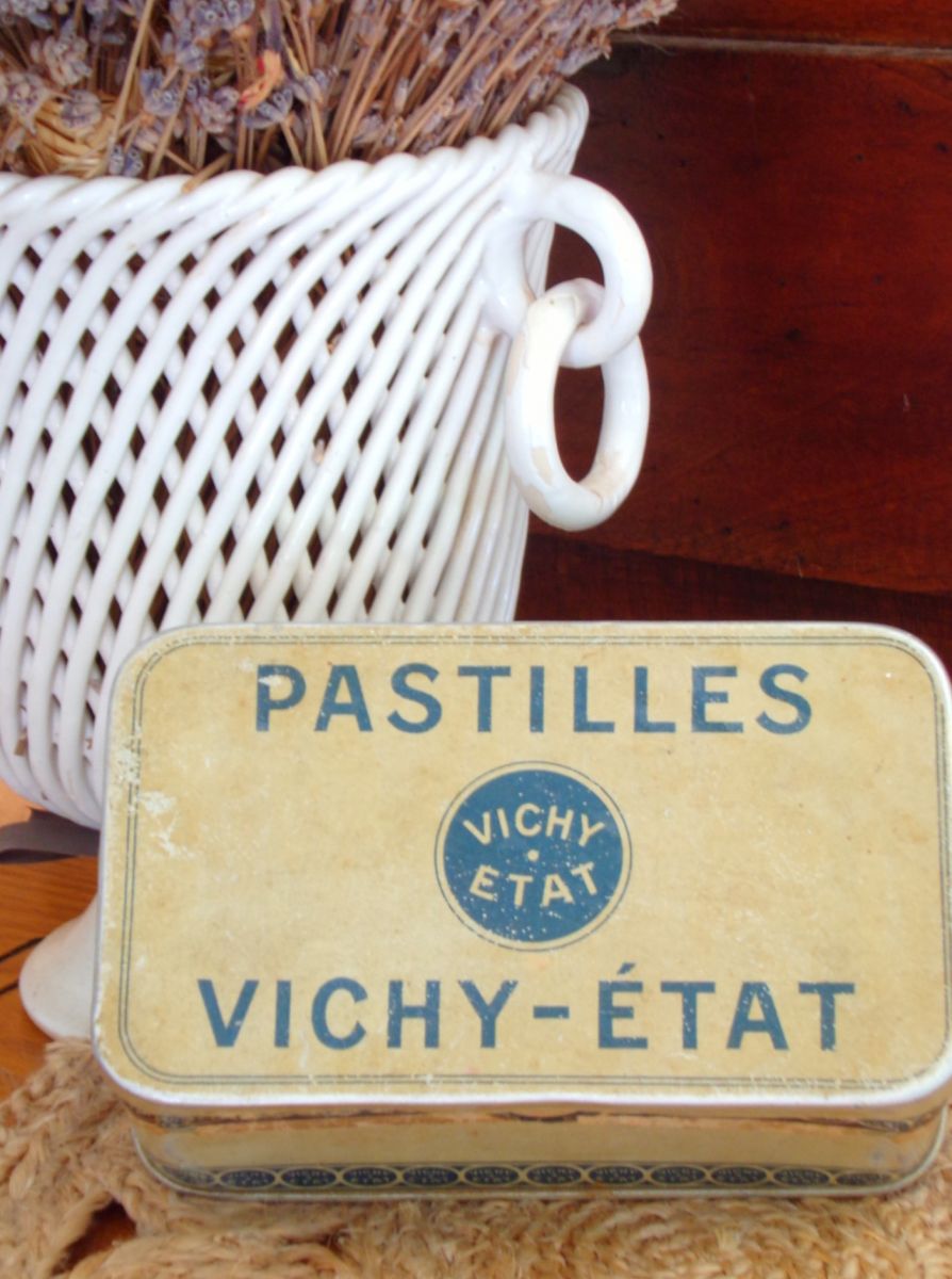 Cette boîte provient directement des années 40 . Elle fait partie des séries d'emballage produites en 1945 par Vichy entreprise. Mal grès une légère déformation dût aux effets du temps elle est en bon état général et utilisable. Elle ravira les boxophile et les amoureux de ces bonbon encore célèbre et toujours aussi bon^^!