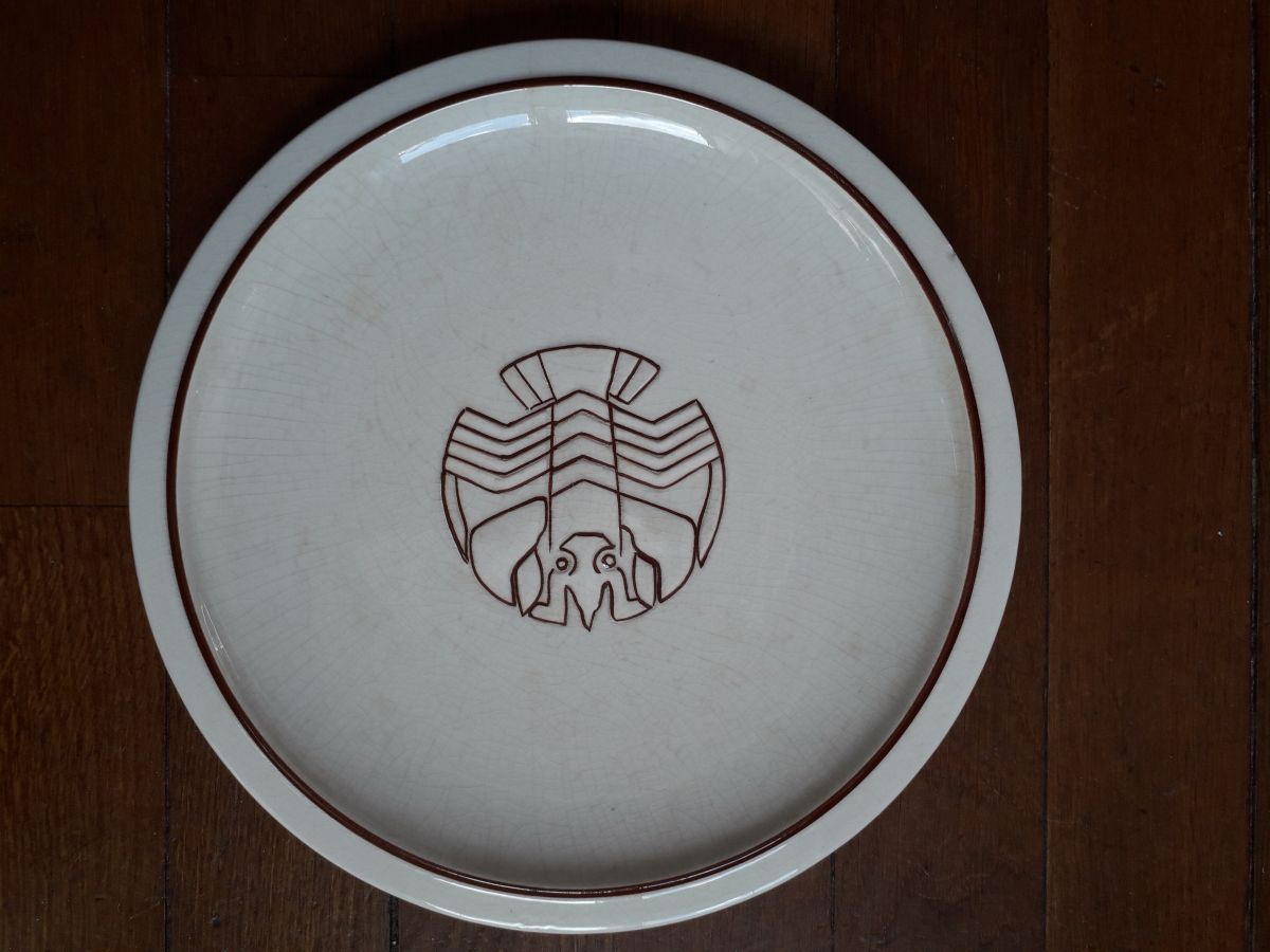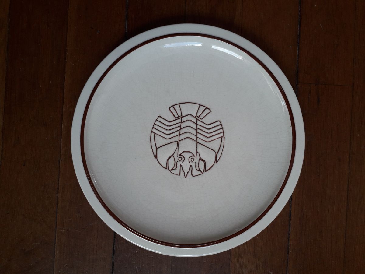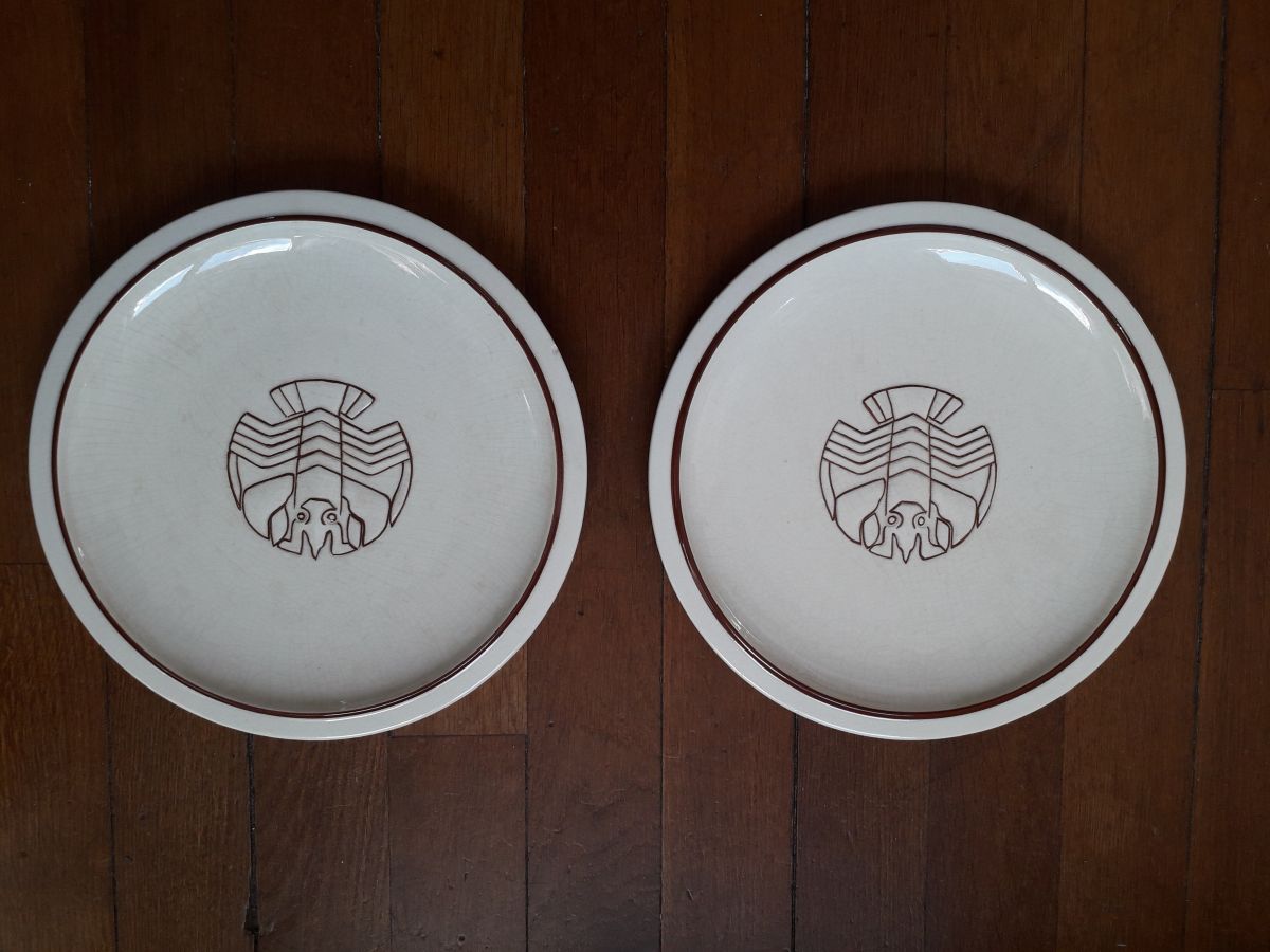 Une paire d'assiettes plates art-déco des années 30 avec un motif central de homard en relief.