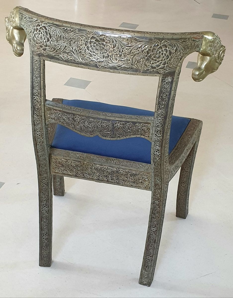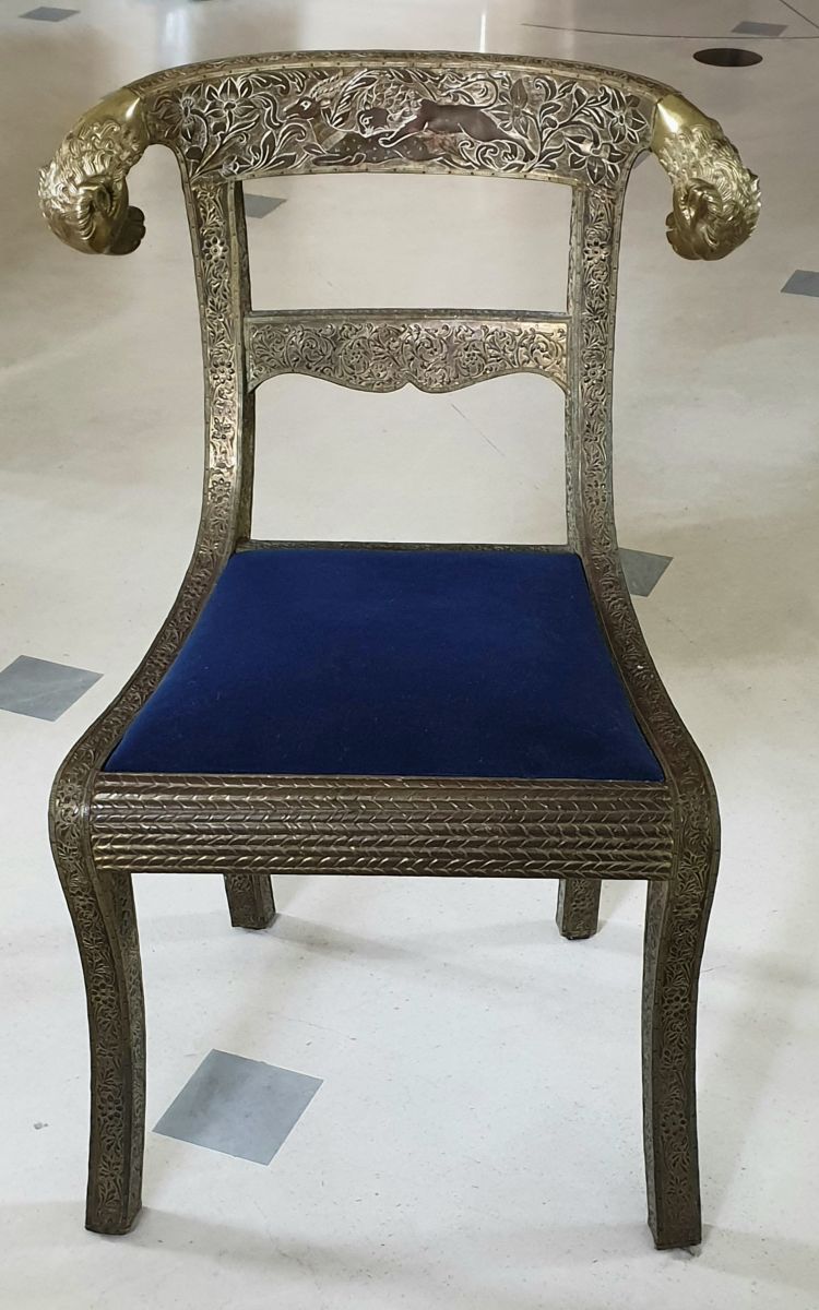 Chaises indiennes avec têtes de béliers en laiton martelé dans le style Anglo Raj. Assise rembourrée en velours bleu en parfait état.