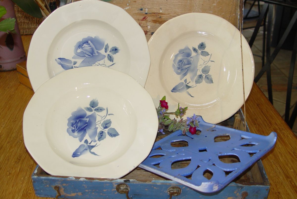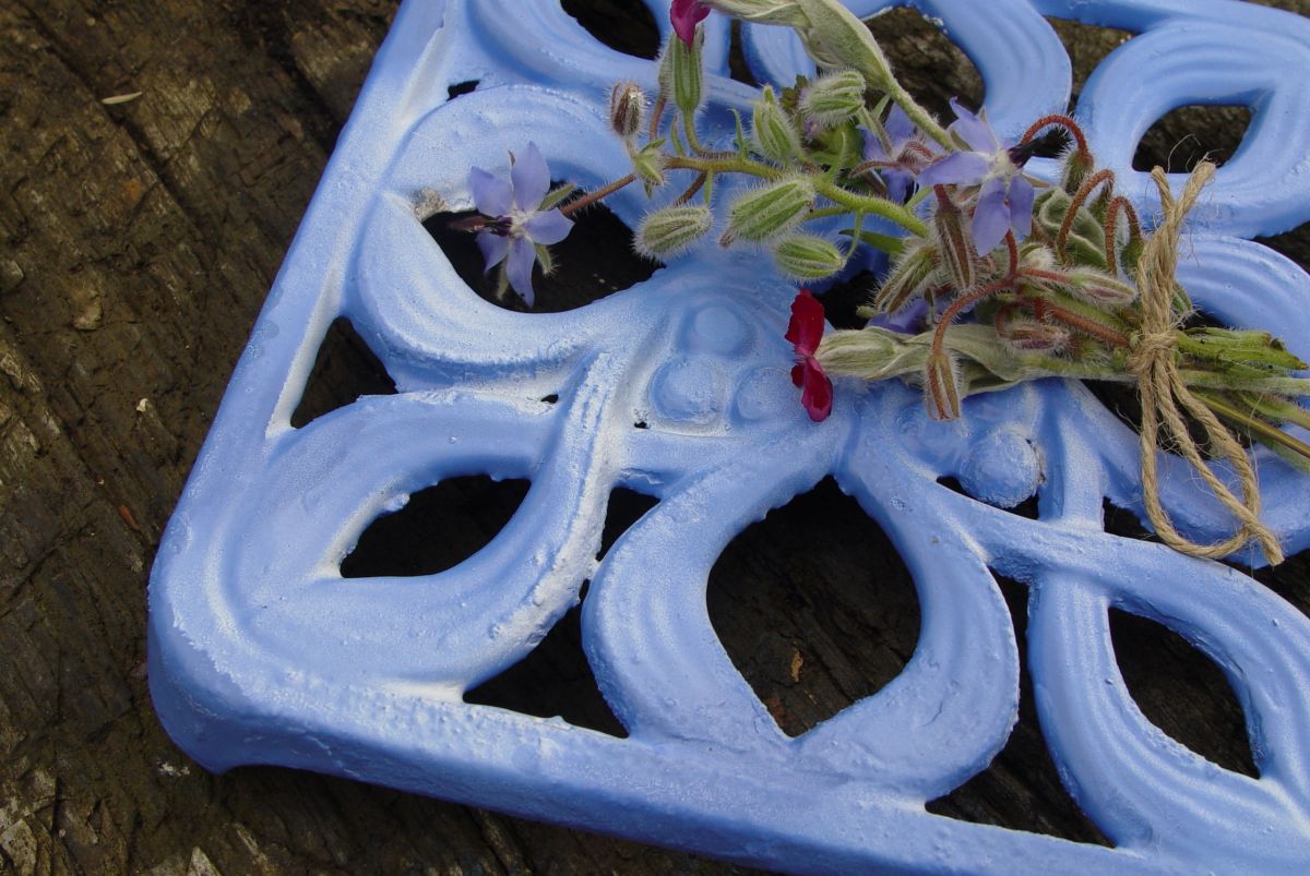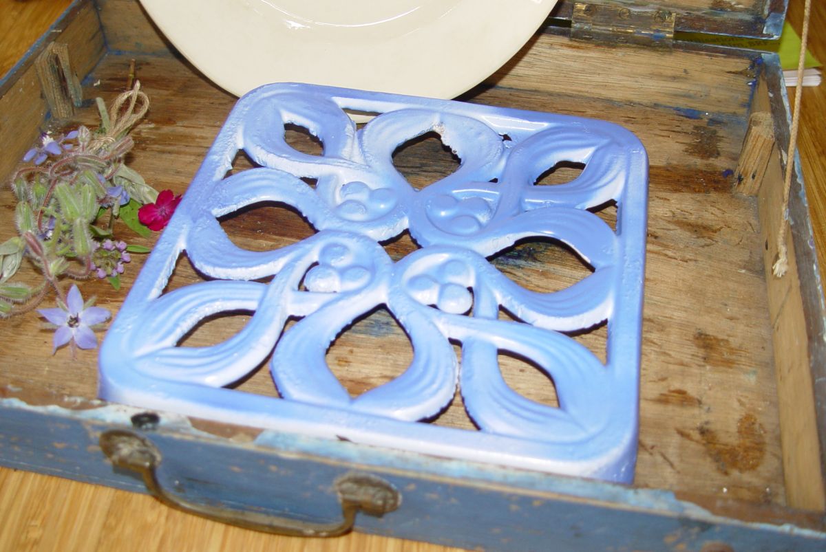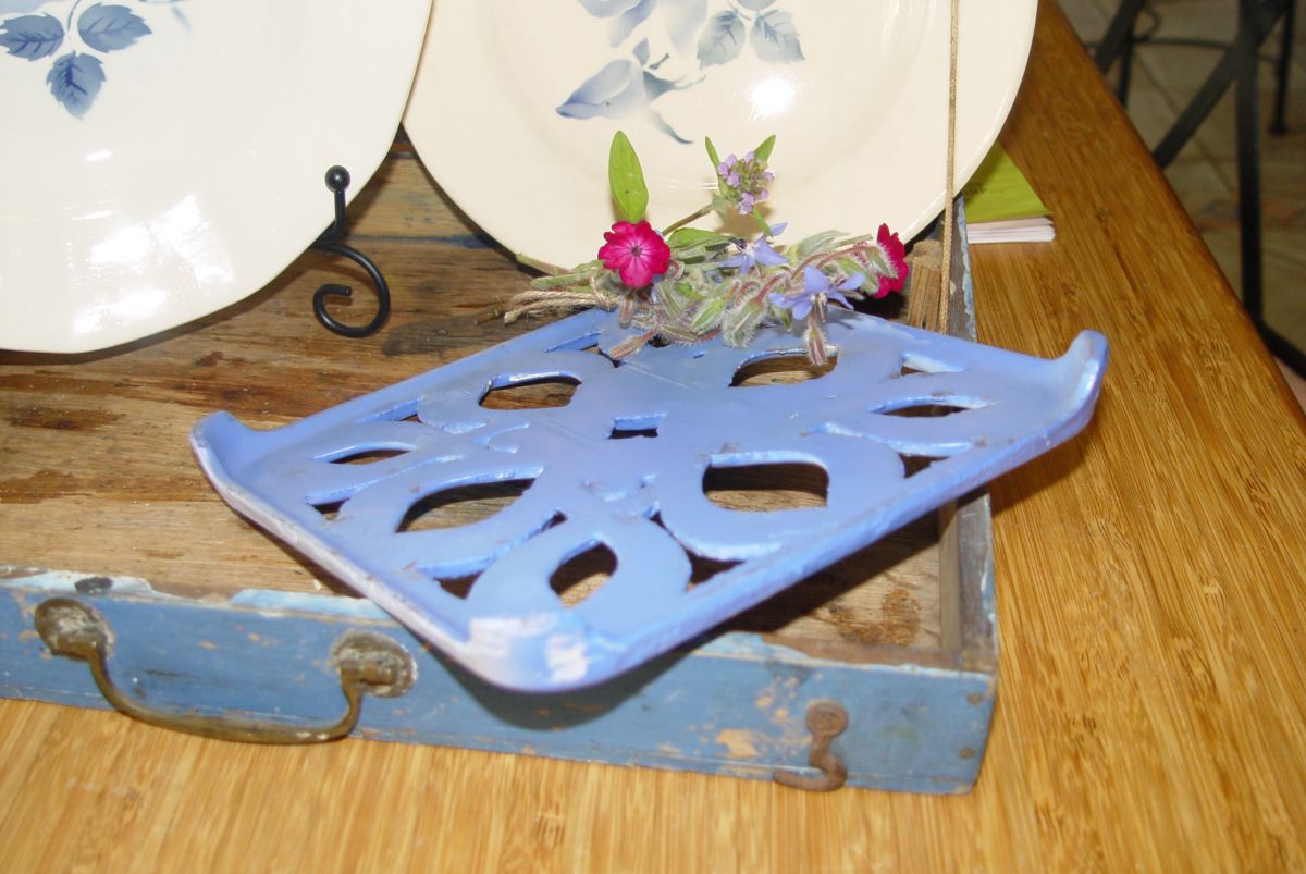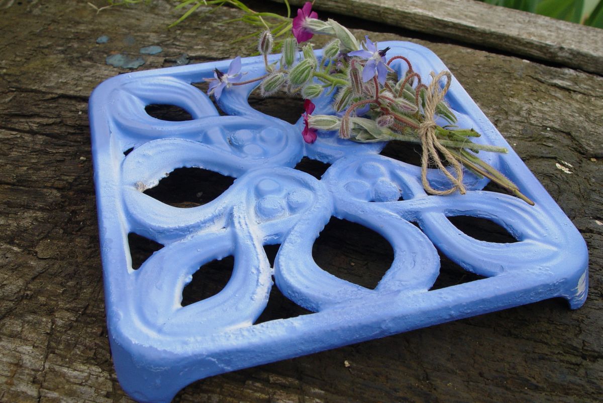 Ancien dessous de plat en fonte vintage relooké bleu bourrache.
