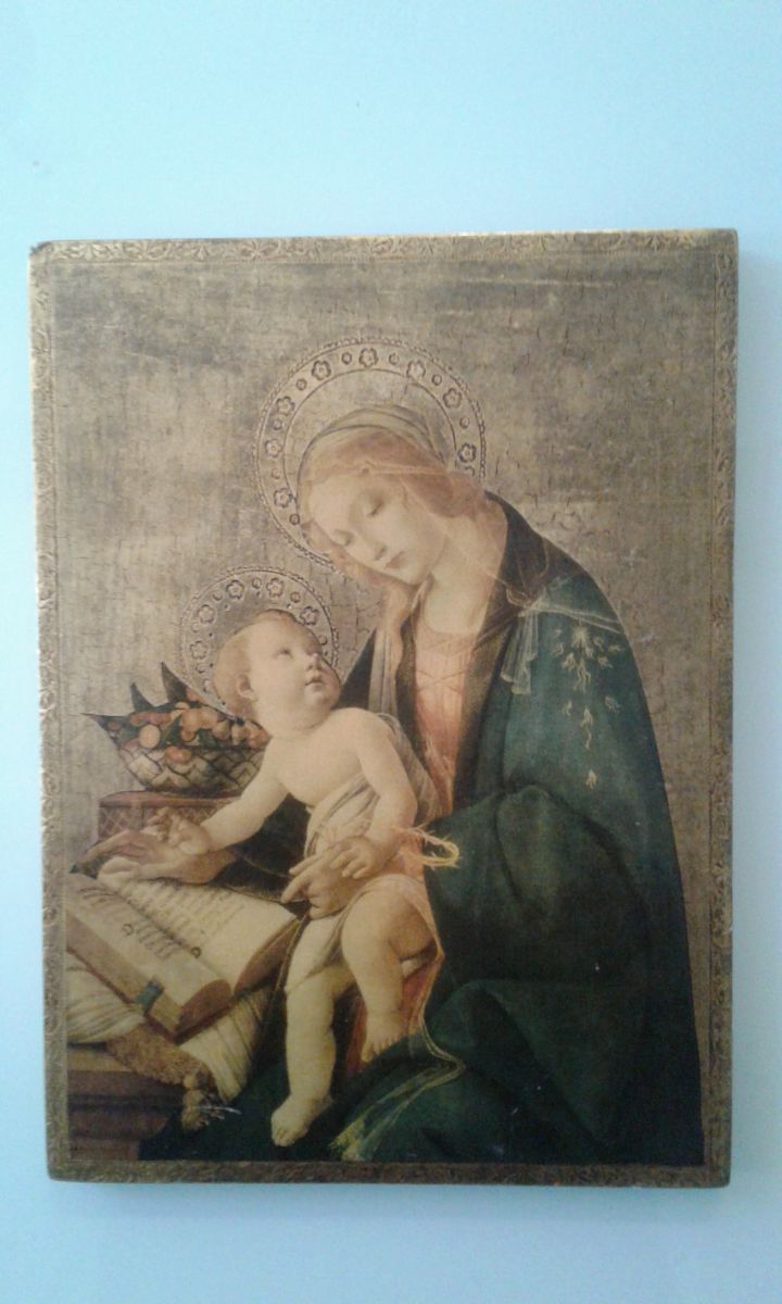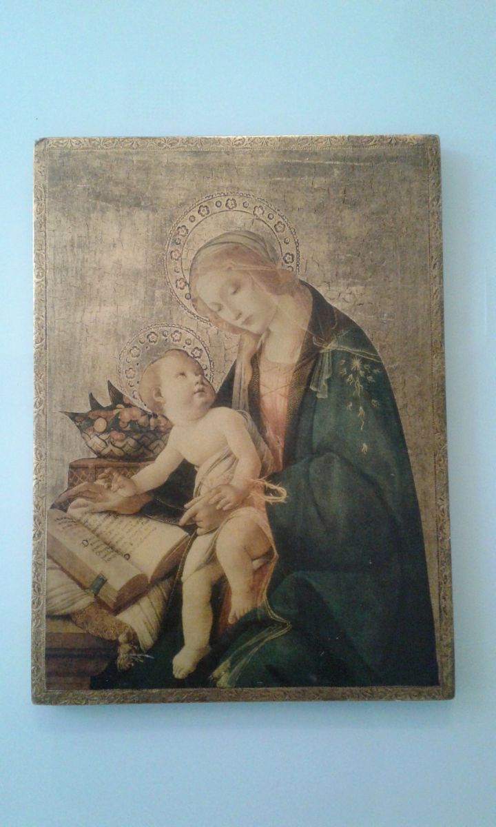 ICONE LA VIERGE Marie et l enfant sur bois avec reflets d'or elle est en bonne état à noté un petits coup sur la pointe du cadre côté gauche ne se voit pas de face voir photos les icônes devienne tendance dans les décos actuels.