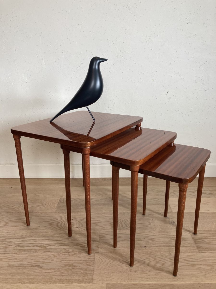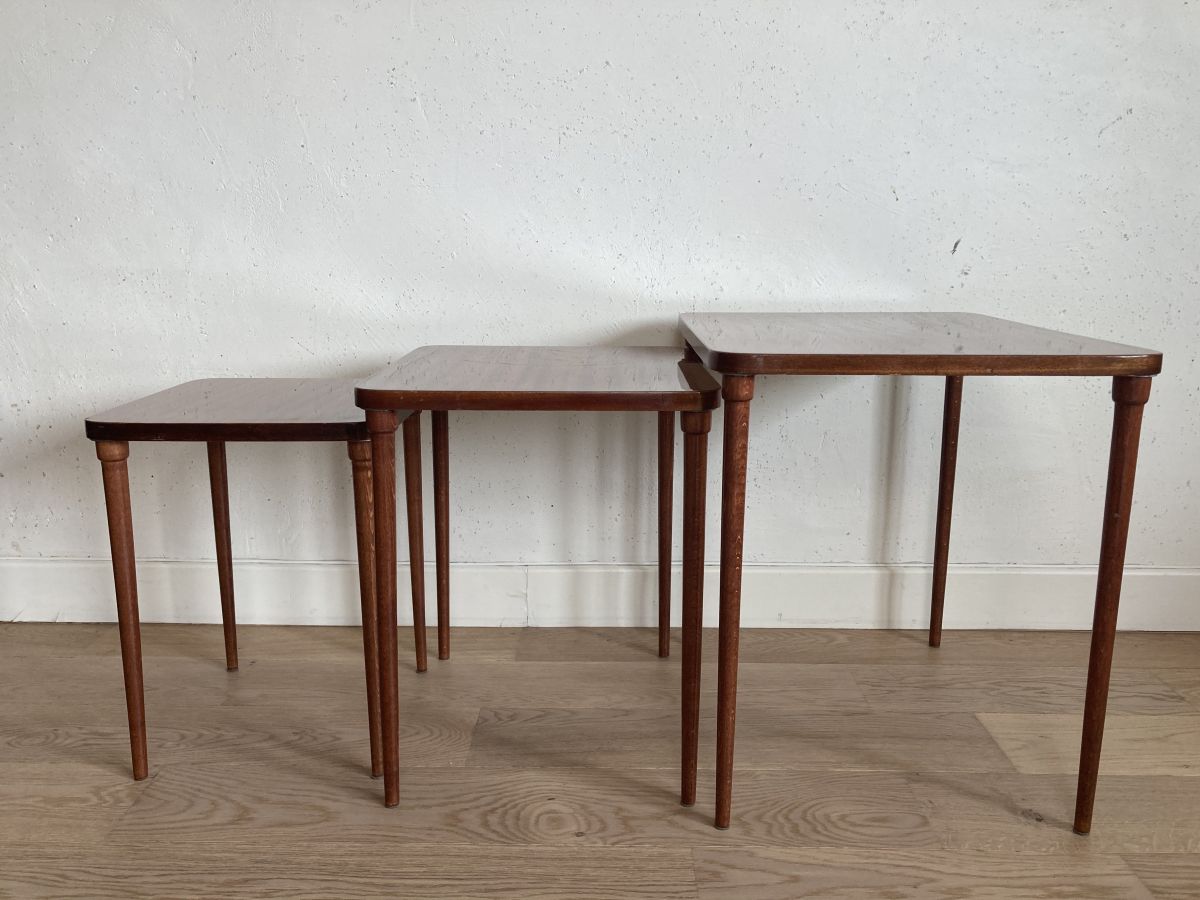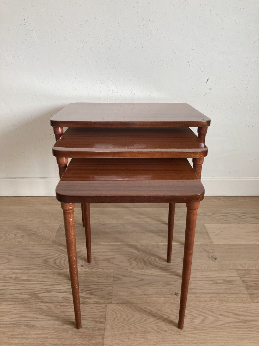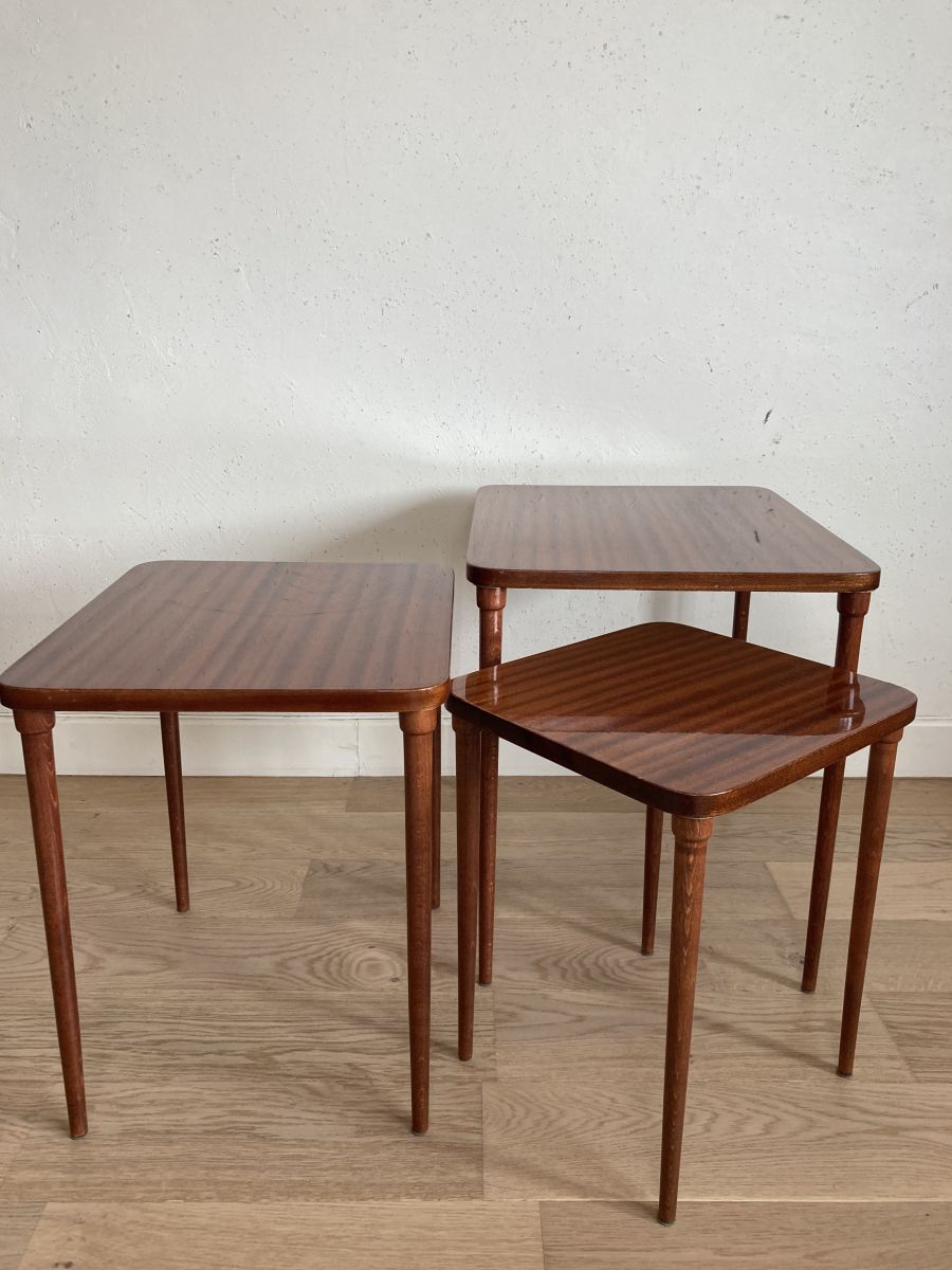 Set de 3 tables basses gigognes, datant des années 60. Très élégantes avec leurs longs pieds aiguilles, ces tables trouveront différents usages : bout de canapé, desserte, chevet... Une fois rangées, elles permettent de gagner de la place dans les petits intérieurs. Bel état de maison. Dimensions : Table 1 : hauteur = 47 cm * largeur = 50 cm * profondeur = 40 cm, Table 2 : hauteur = 43 cm * largeur = 43 cm * profondeur = 41 cm, Table 3 : hauteur = 30 cm * largeur = 32 cm * profondeur = 30 cm.