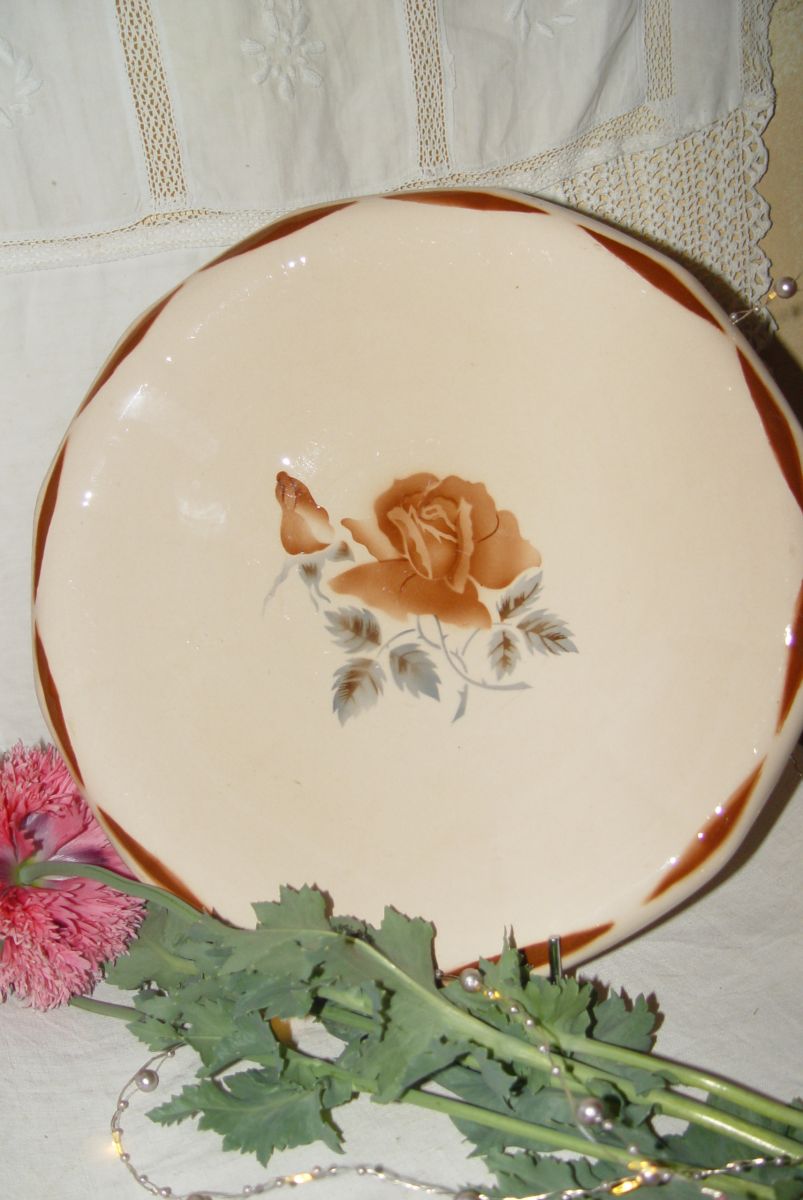Voici une petite coupe au motif de rose de la série 9181 de Digoin - Sarreguemines -dans les tons rose-beige pastel et gris-