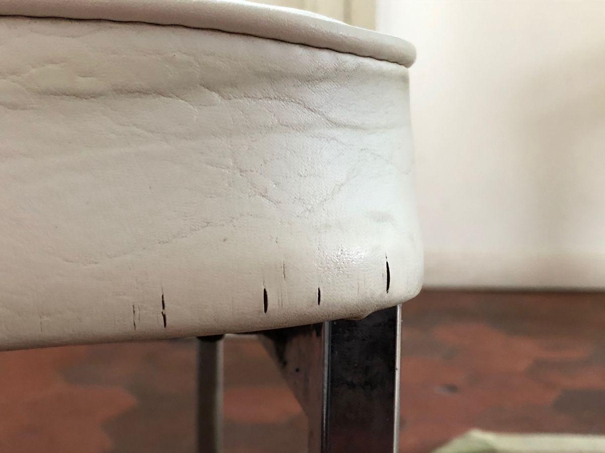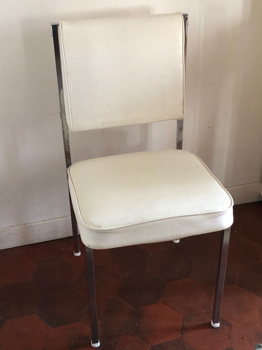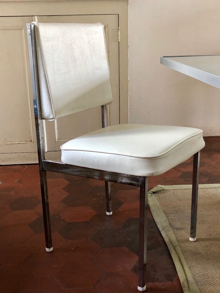 Jolie chaise américaine années 60 en skai et metal chromé. pièce unique provenant de la manufacture Daystrom à Boston. Légères traces de rouille sur les pieds qui lui donne son charme vintage et très petites fissures du skai sur le devant, voir photos
