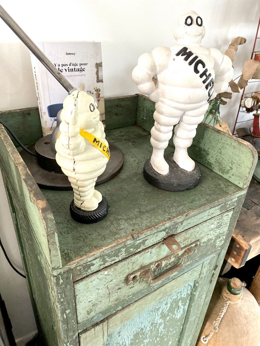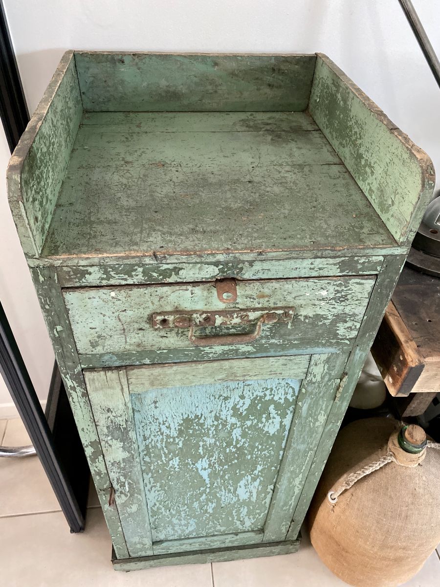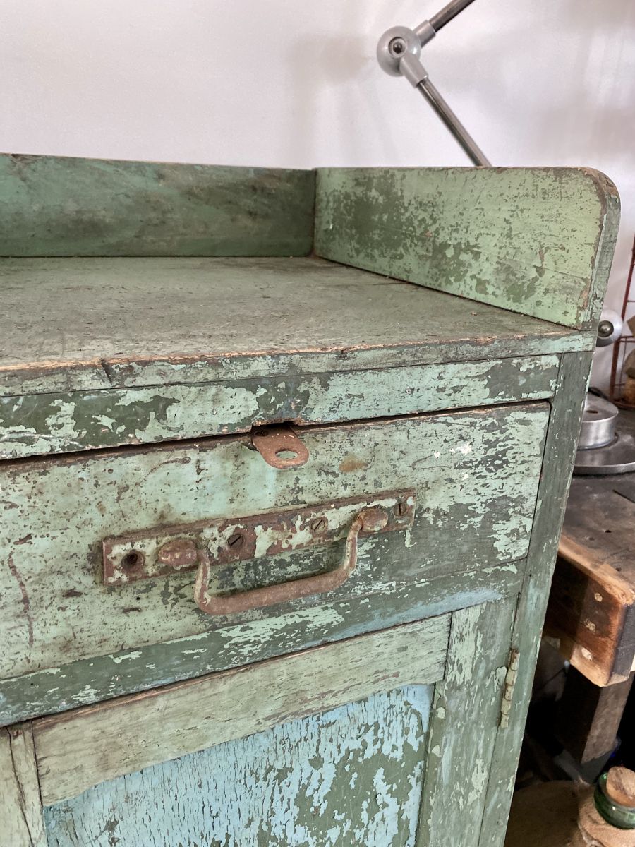 Très beau meuble de métier en bois dans son jus avec une jolie peinture écaillée bleue vert qui fait tout son charme. Il possède 1 tiroir et une partie rangement avec des étagères. Le meuble est bon état général seul le bas du meuble présente des traces d’usures sur l’arrière. Très belle pièce pour une déco industrielle !