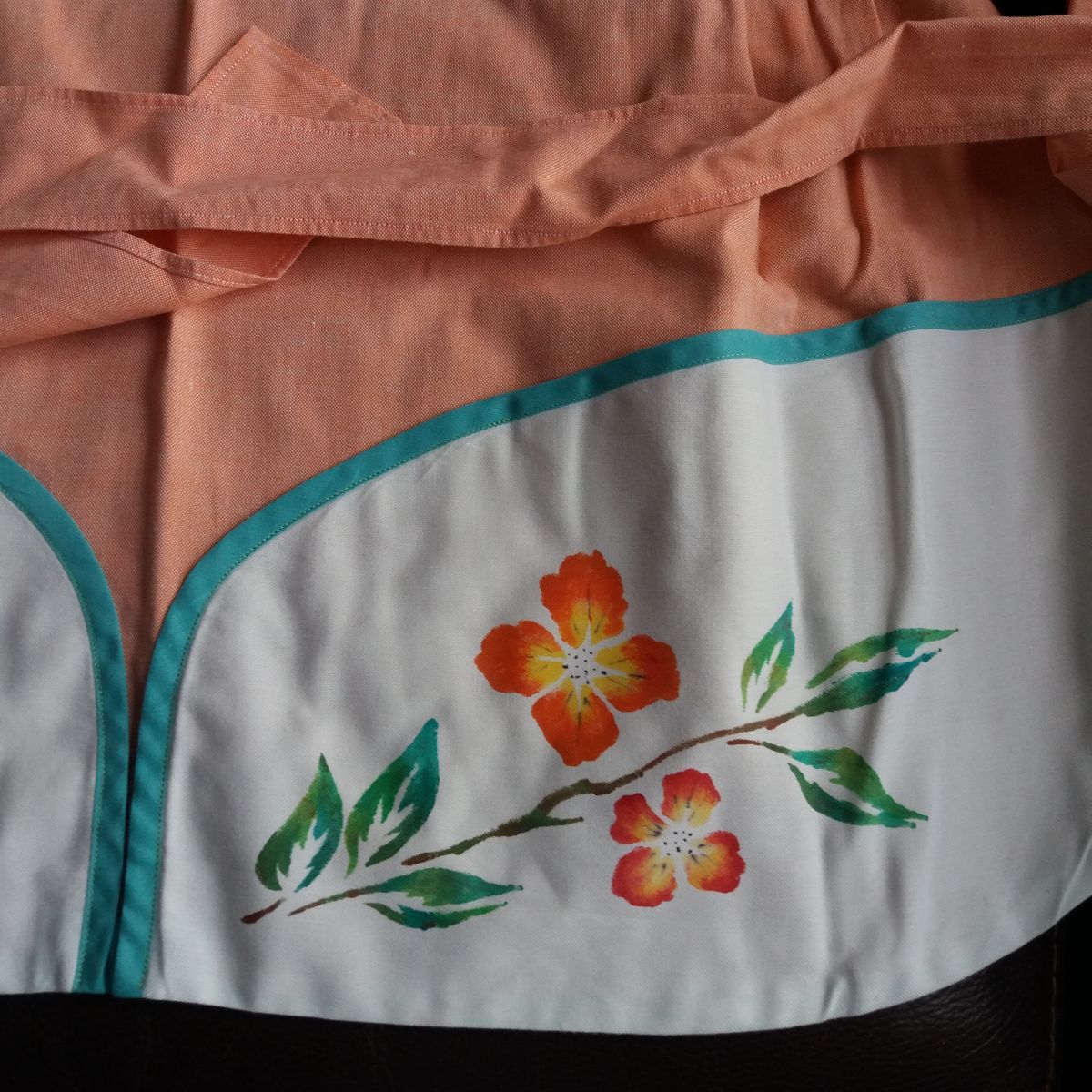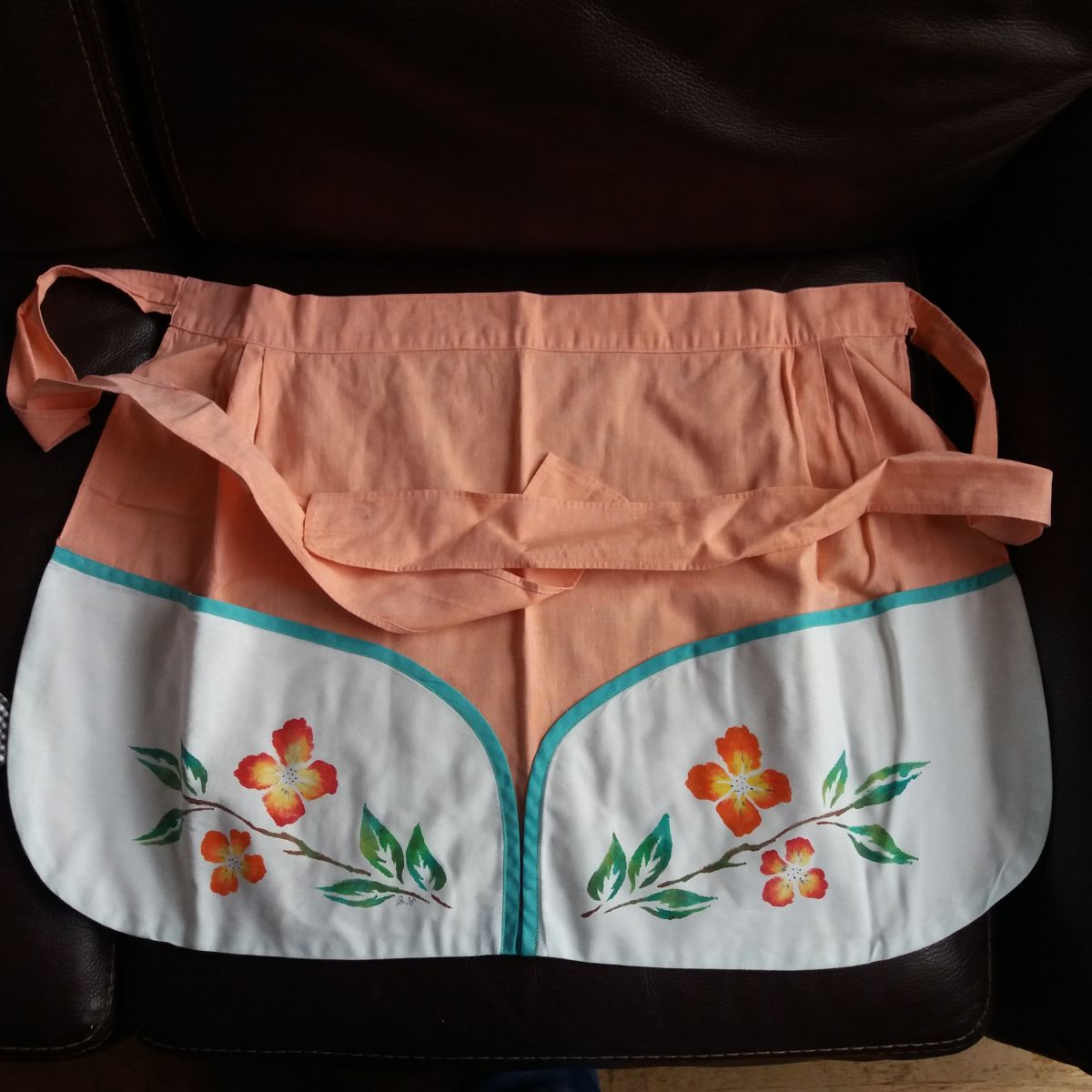 TABLIER ANCIEN NEUF DE COULEUR DOMINANTE ABRICOT AVEC DEUX POCHES BIEN GRANDES .LA PARTIE CENTRALE FAIT 51CM. LES LANIERES FONT 73CM. EXCELLENT ETAT.