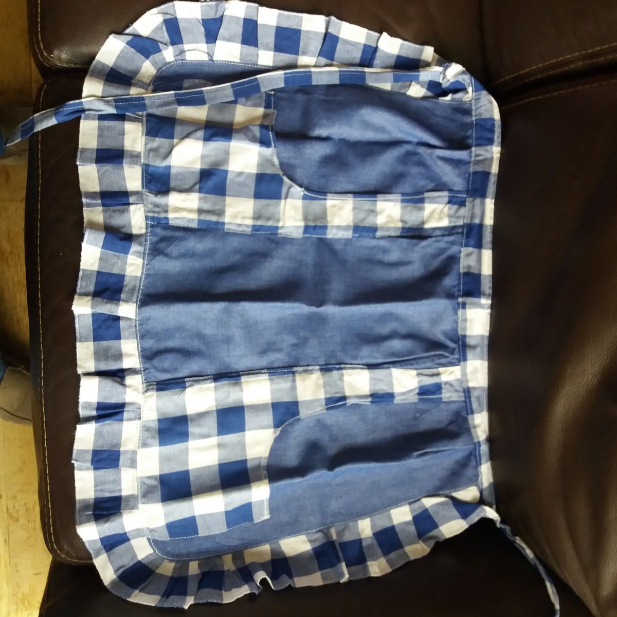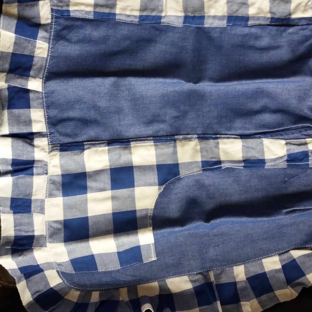 Tablier vintage fait main avec des parties de couleur jeans et des parties avec un motif à carreaux. Excellent état. La partie centrale fait 59cm les lanières font 53 cm. Pas de taches, très bon état.
