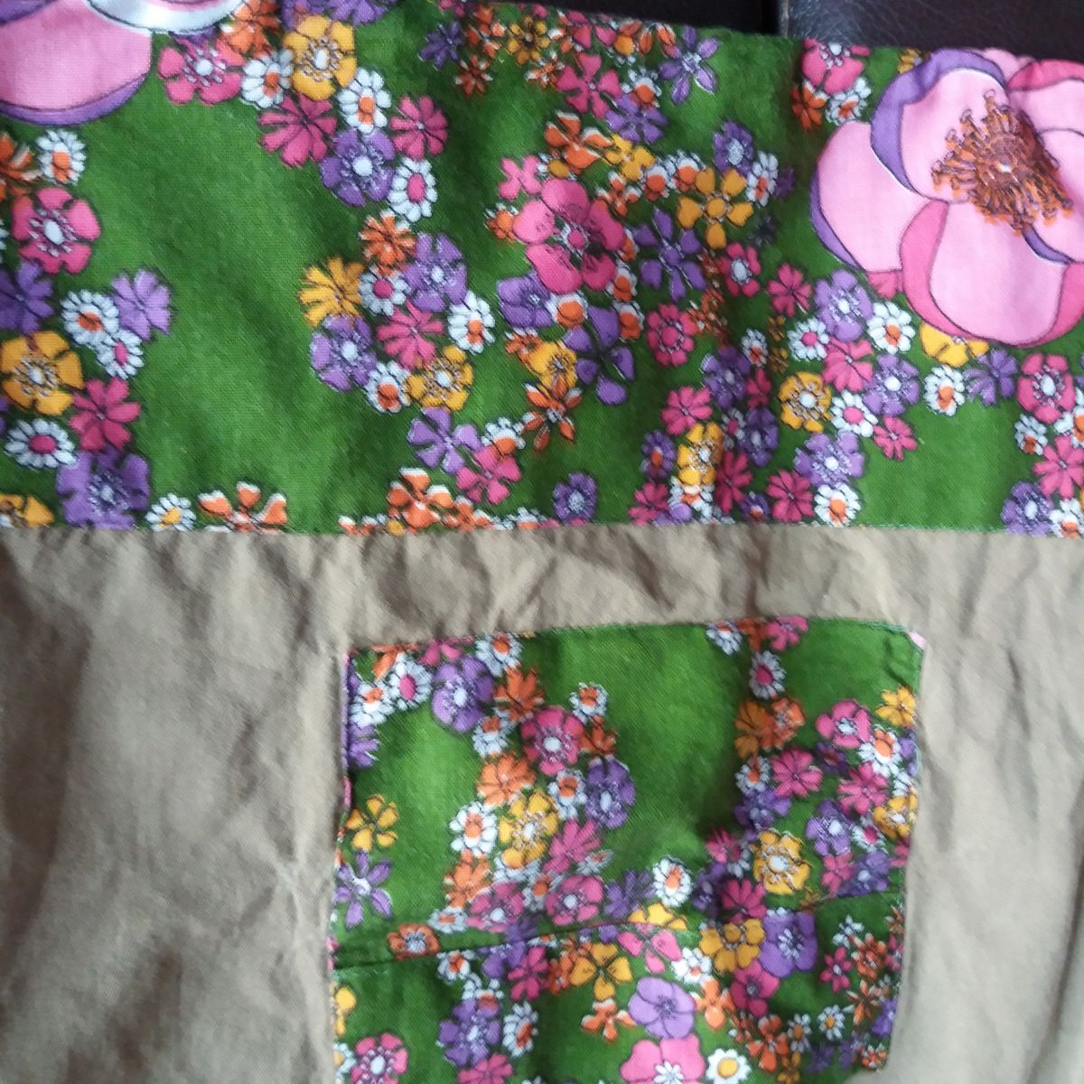 Tablier vintage kaki foncé et motif fleuribien typique. Dimension centrale 54 cm,lanière 67cm chacune.Il est handmade, authentique d'époque avec quelques petites imperfections.