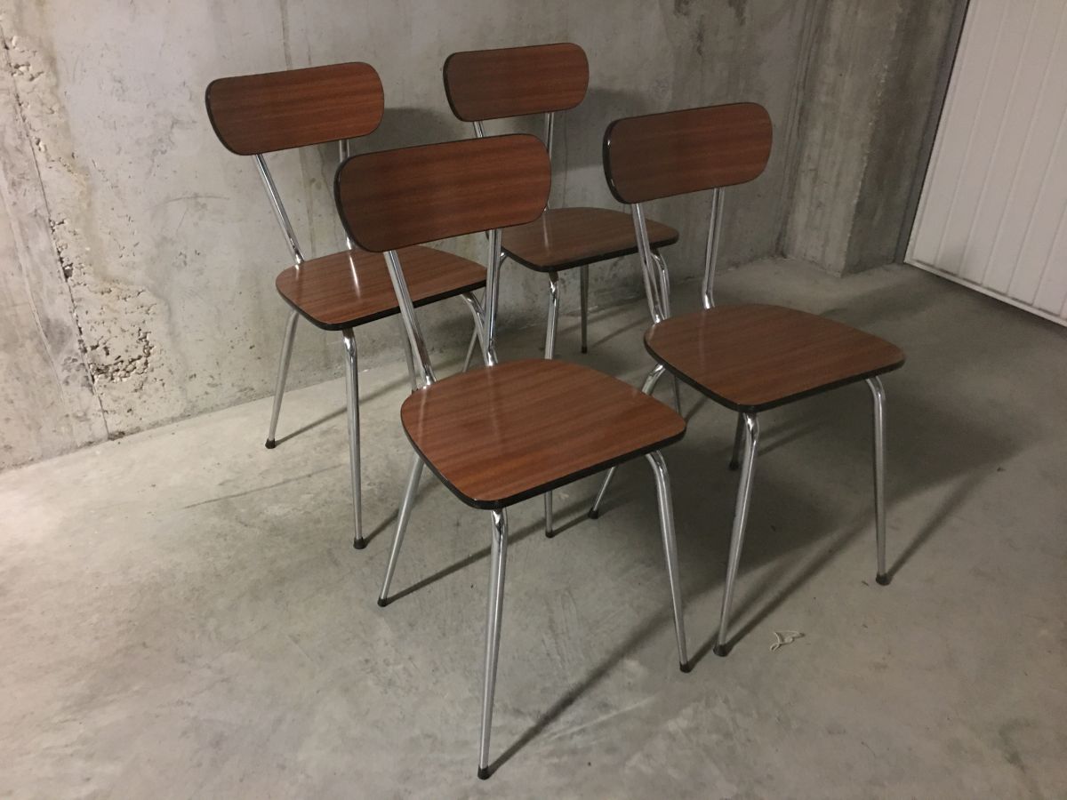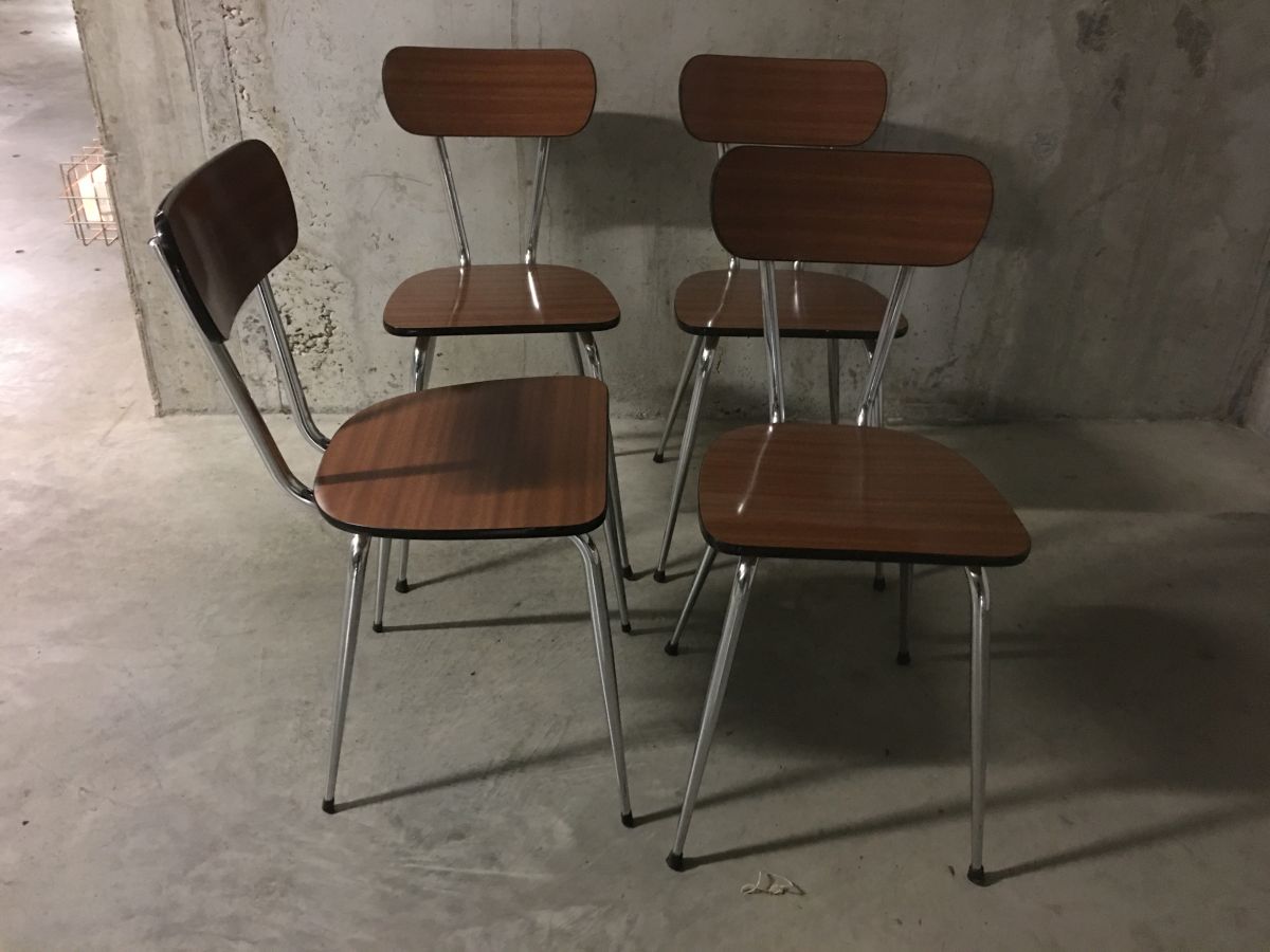 Lot de 4 chaises en formica marron des années 60, hauteur totale 79cm, hauteur assise 48cm, assise 37x37cm, bon état.