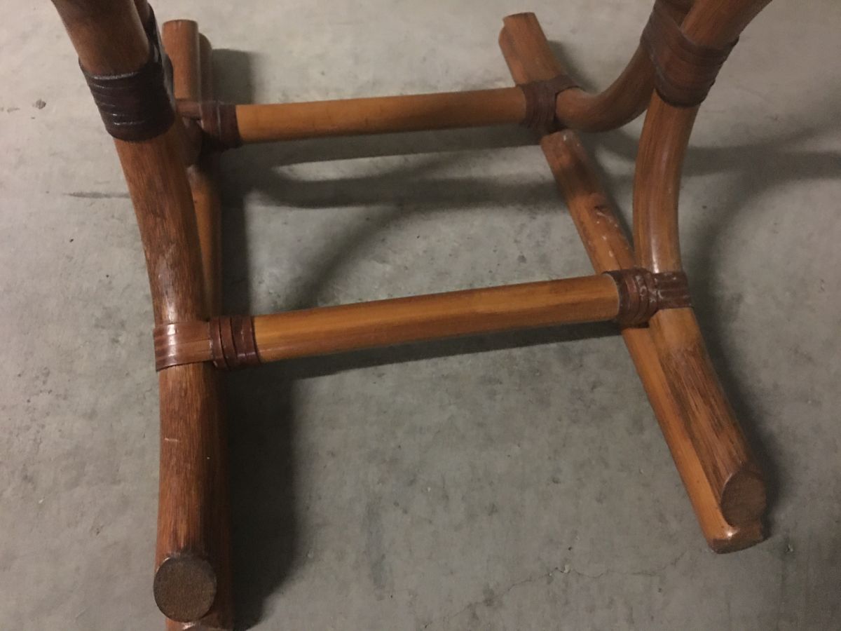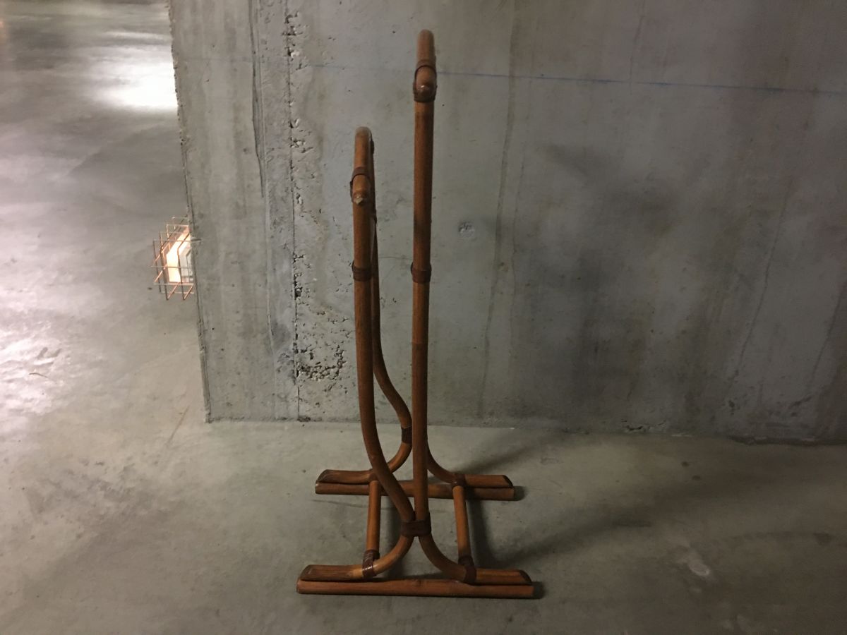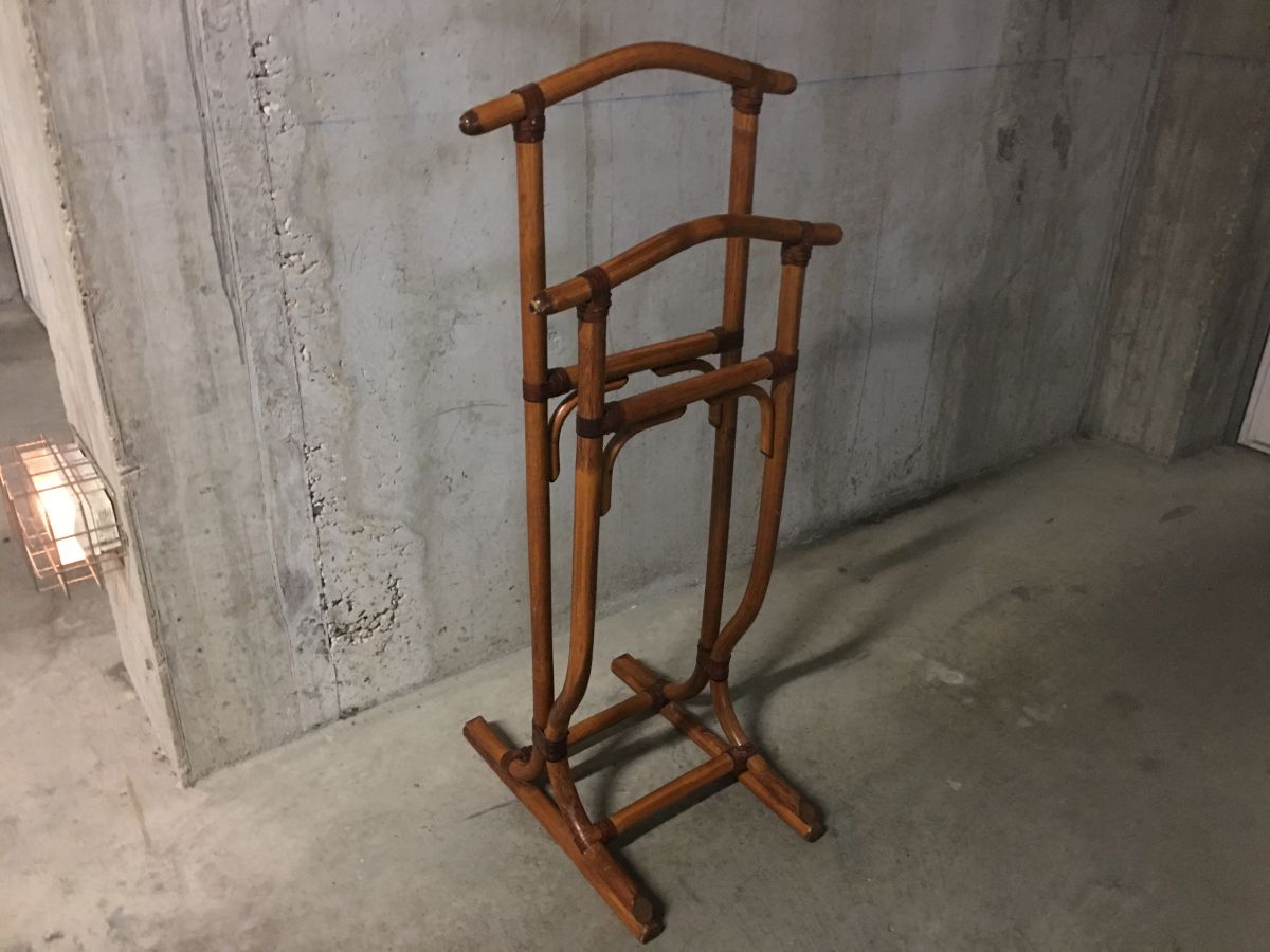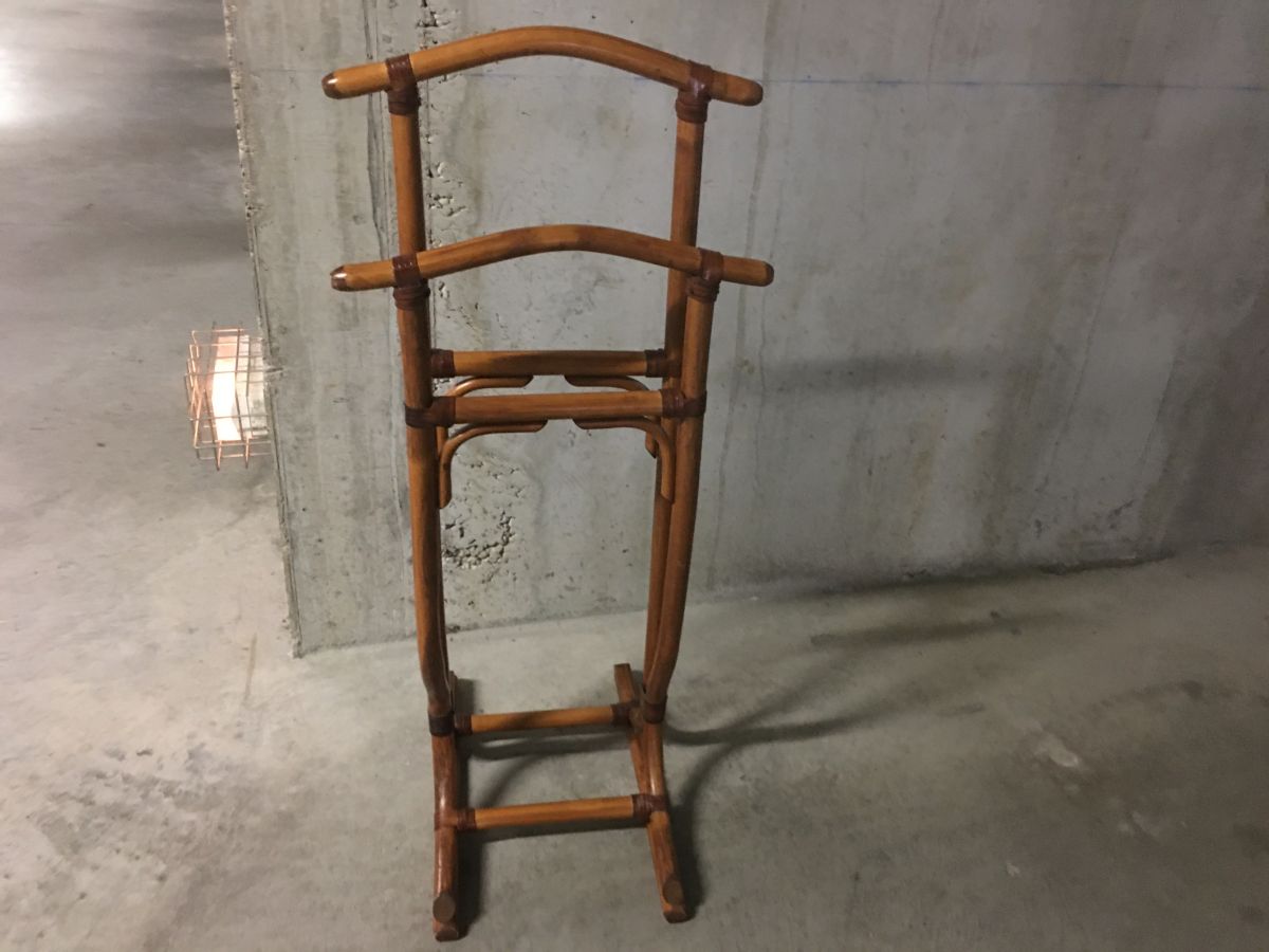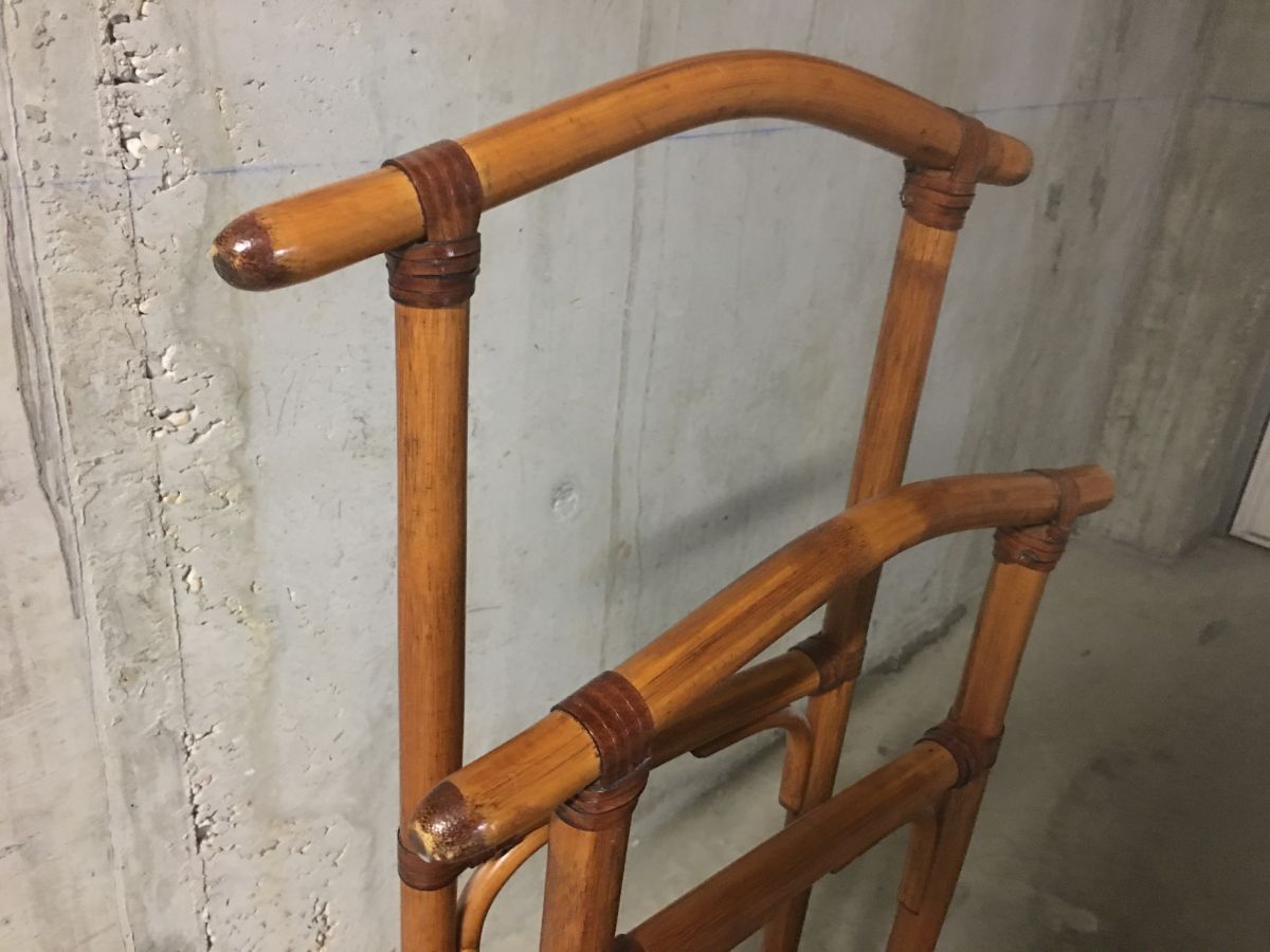 Valet de nuit en rotin des années 70, superbe patine, lanières en cuir, deux cintres, dimensions (cm) : L.46xH.113xP.52, très bon état.