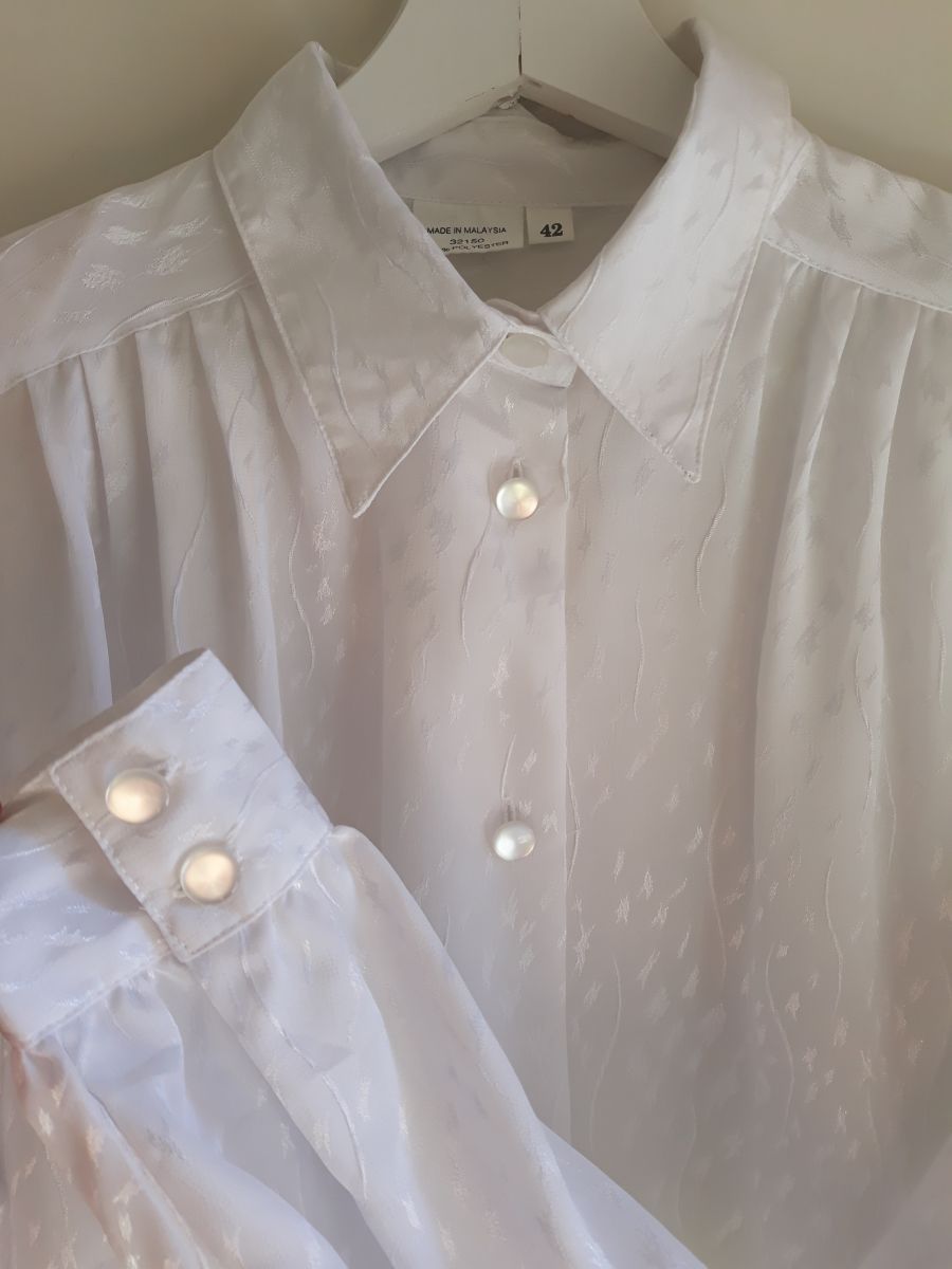 Joli chemisier blanc à motifs floraux irisés, boutons sur le devant et aux poignées irisés également.