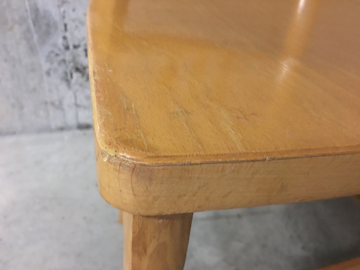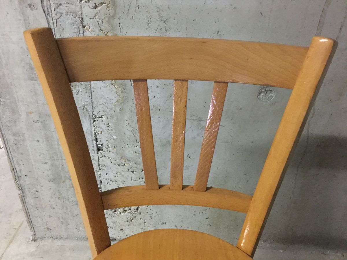 Chaise bistrot des années 60 en bois massif blond, quelques traces d’usage sur l’assise, hauteur 81cm, hauteur assise 46cm, assise 37x37cm, bon état. 3 chaises disponibles.