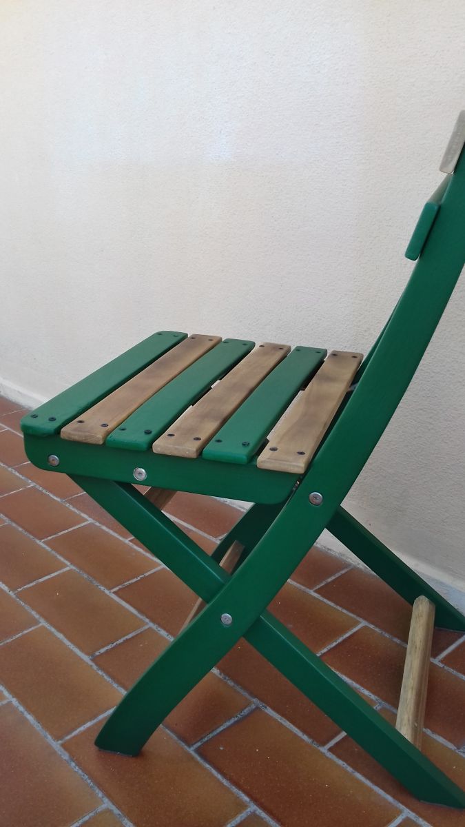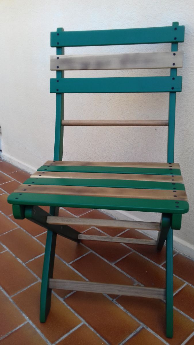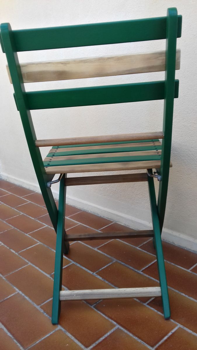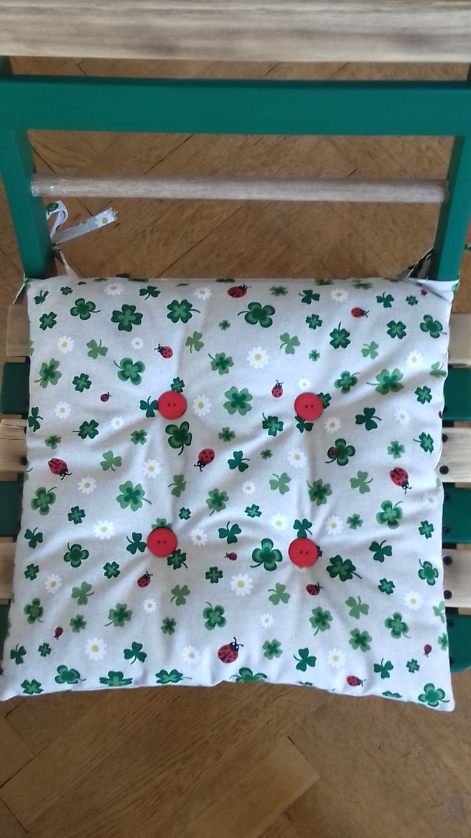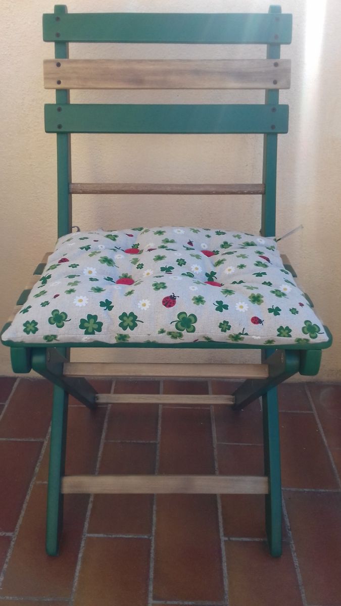 Chaise Printanière – Idéal pour un balcon de ville - Vert Athamanta et Bois Naturel Mat – Tissu coussin imprimé Trèfles Coccinelles et Marguerites - Vendues par 2 - 90 EUR l'une - Livraison à convenir