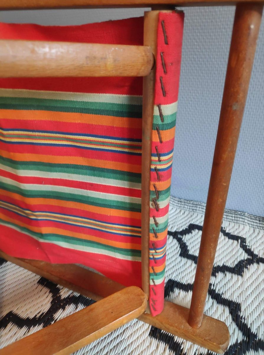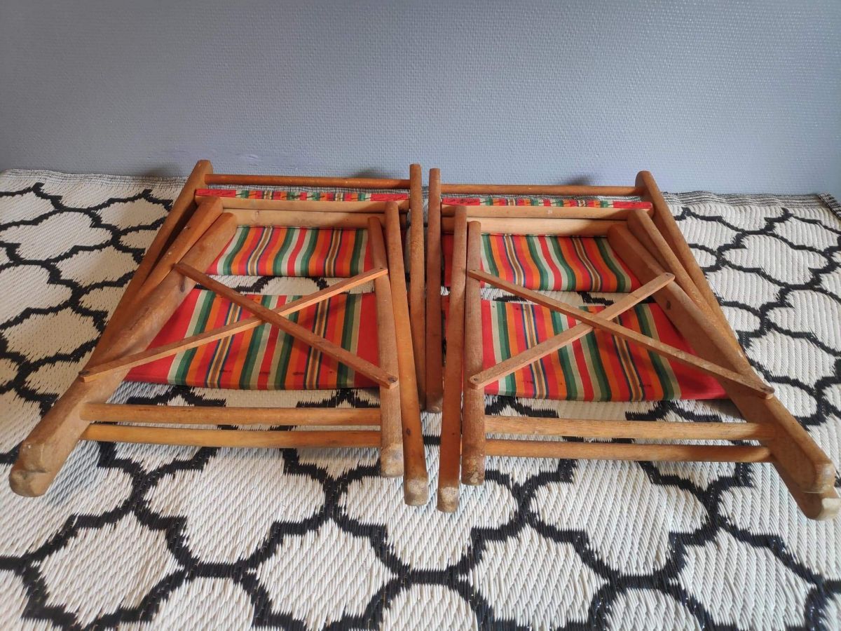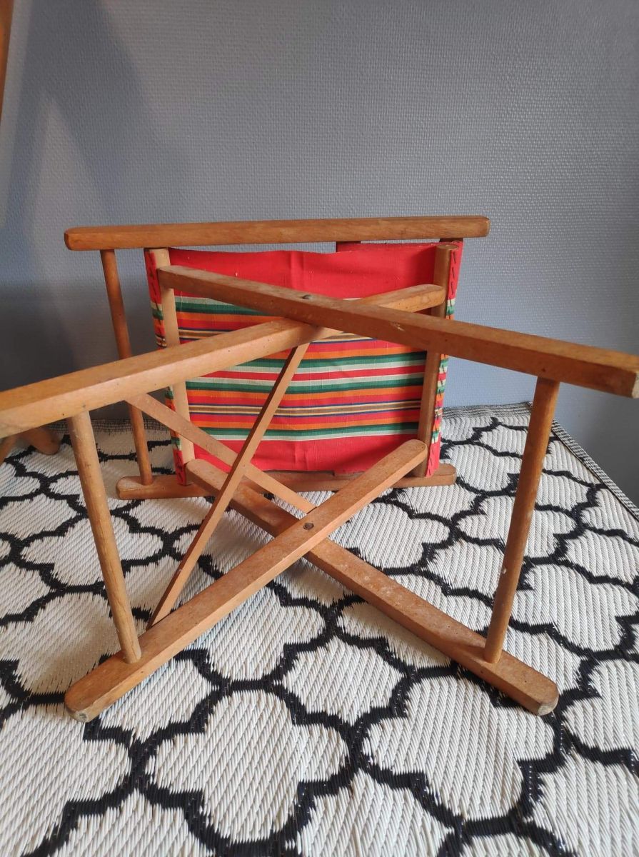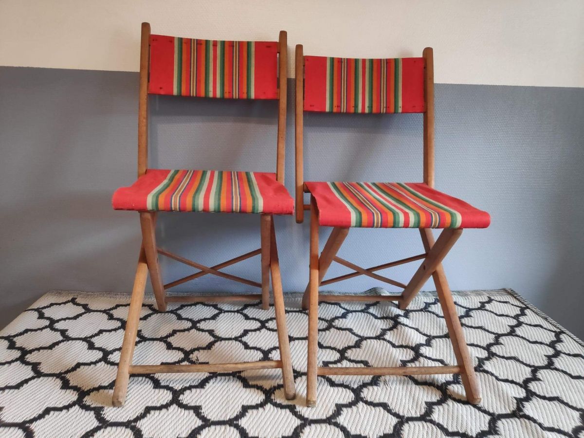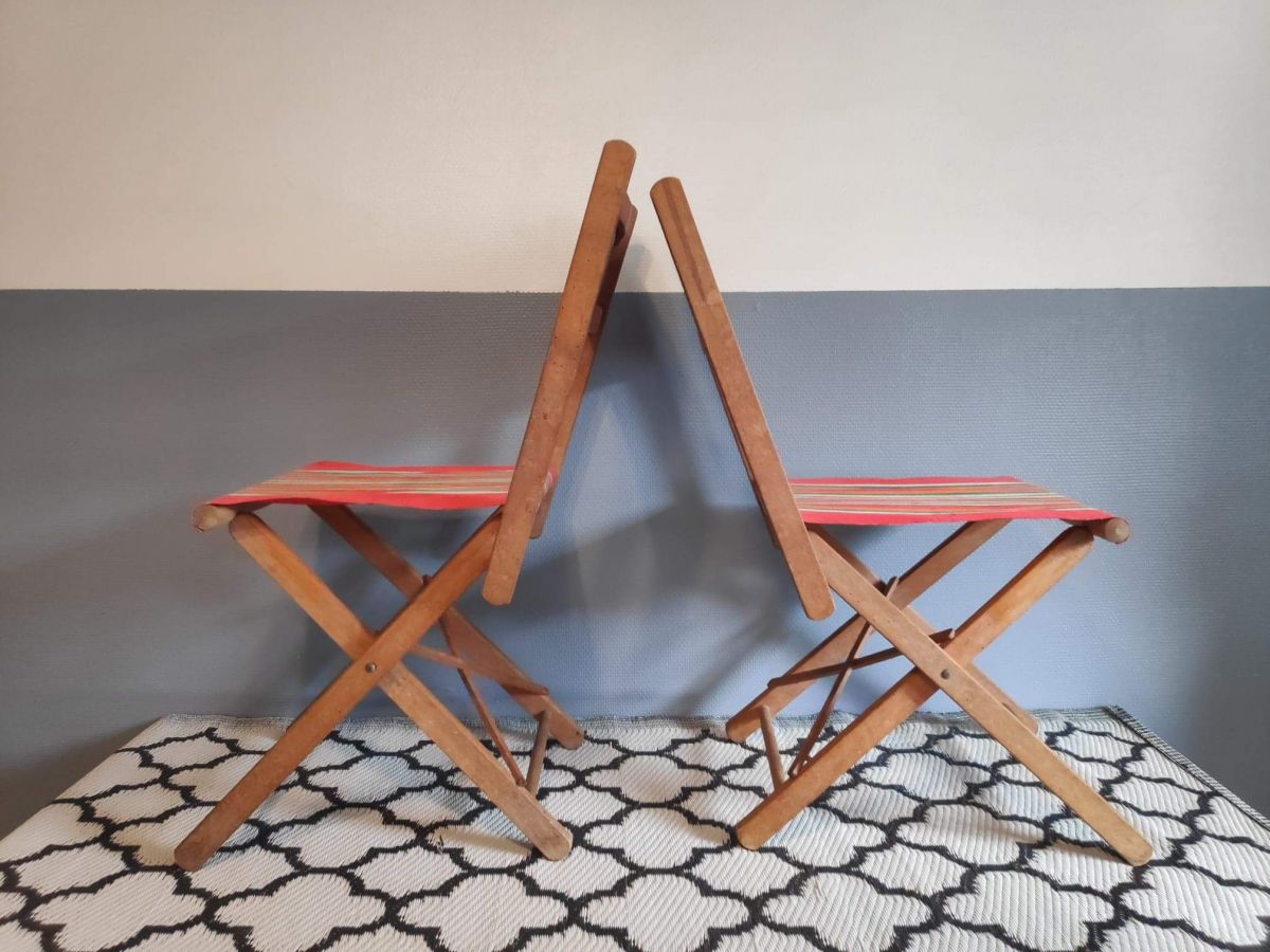 petites chaises pliantes vintage en bois et toile rayée en tissu basque très bon état