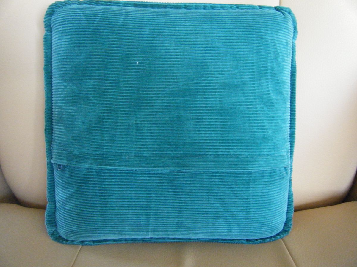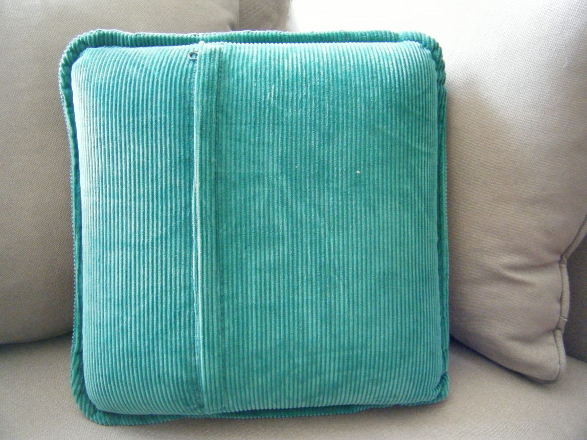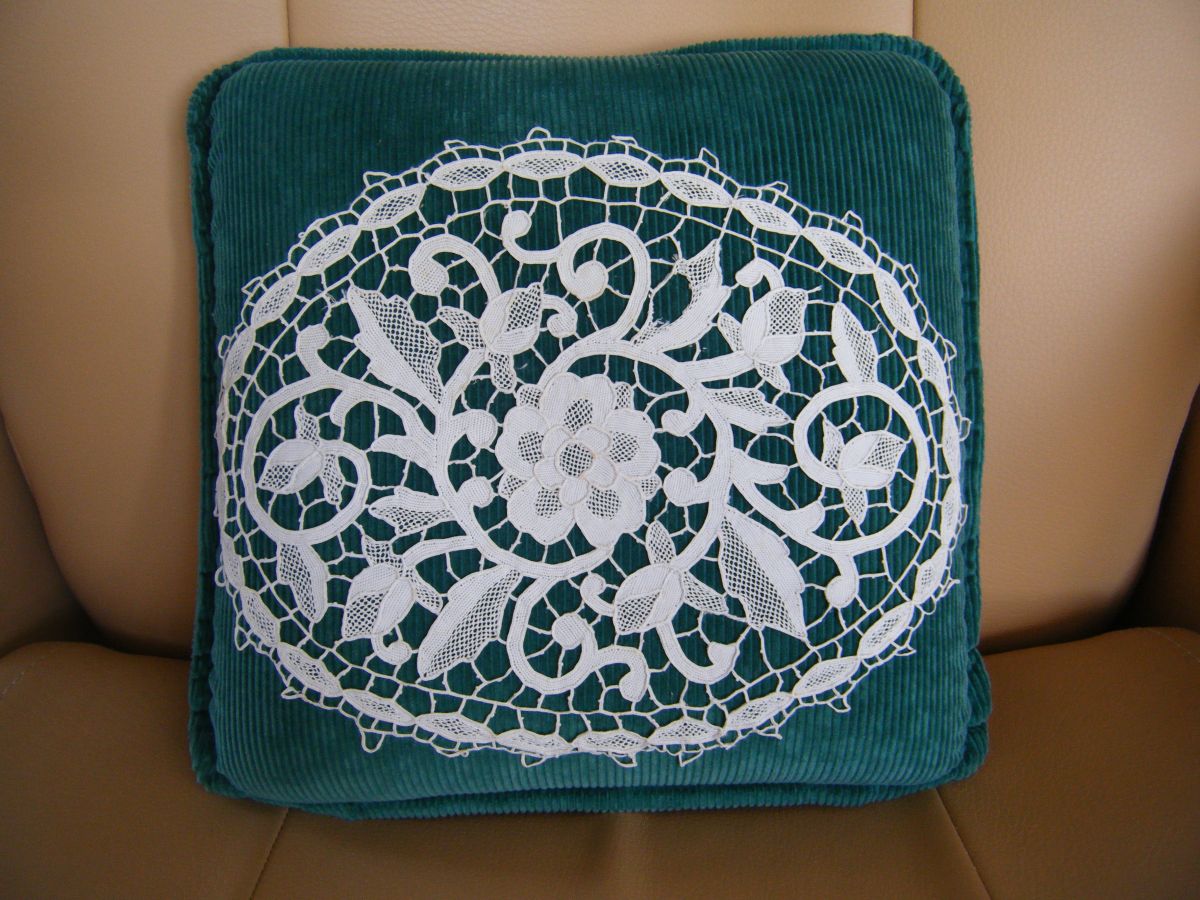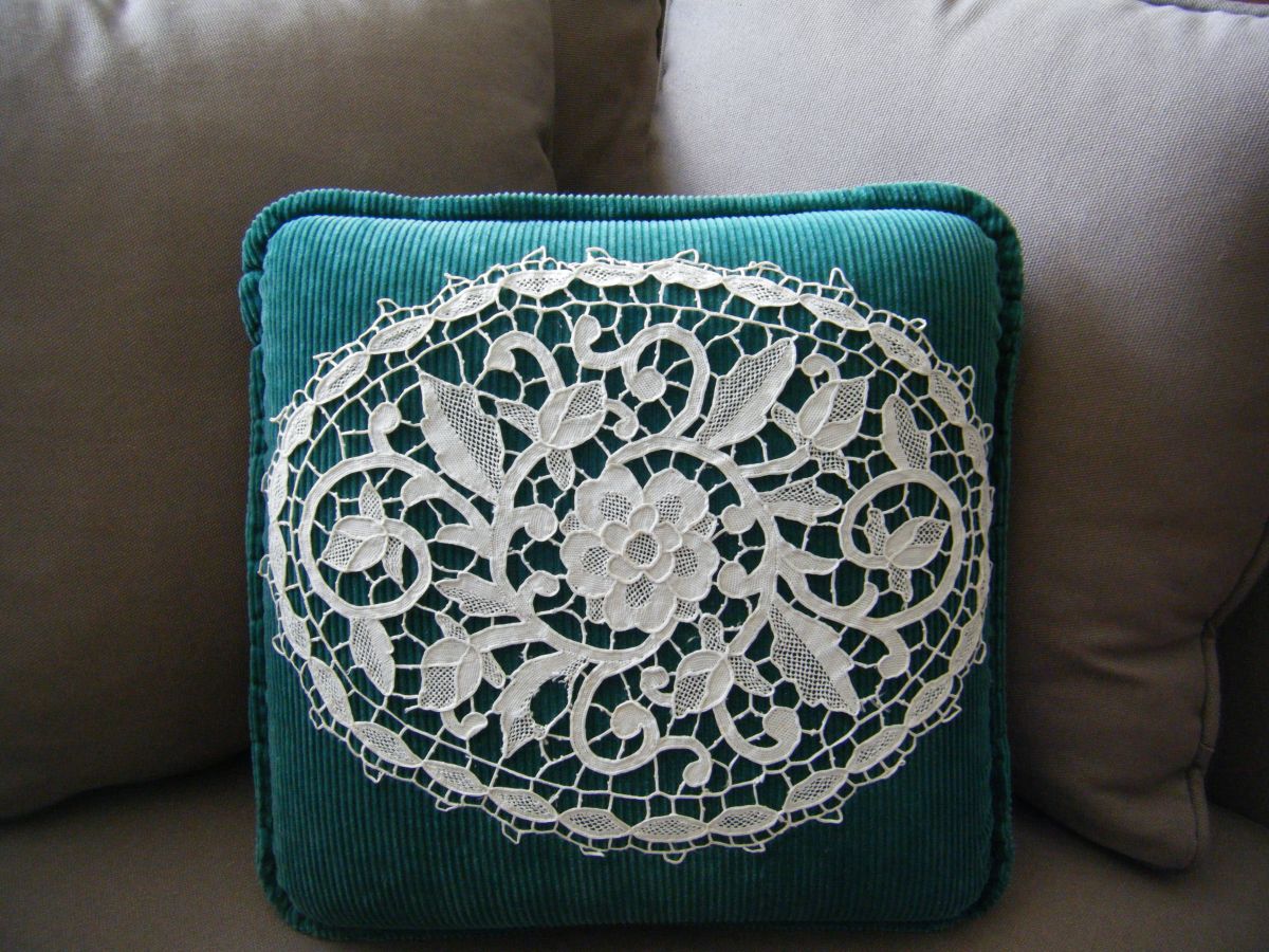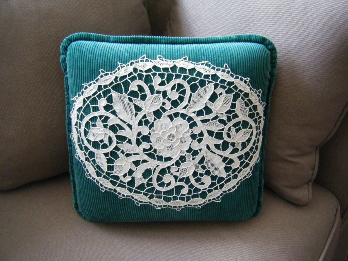 Petit coussin en velours vert côtelé avec napperon en dentelle