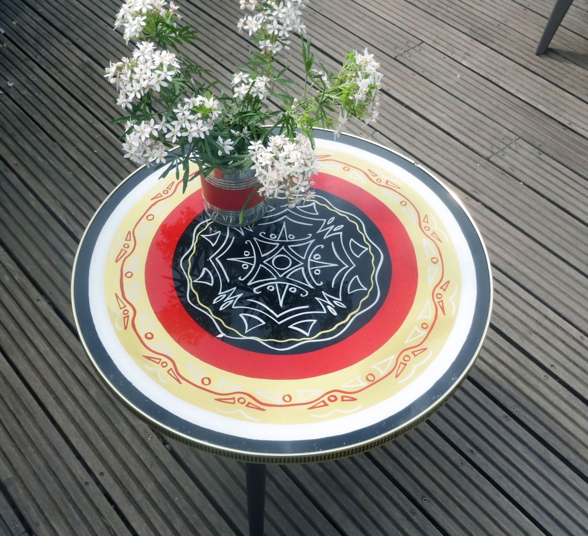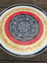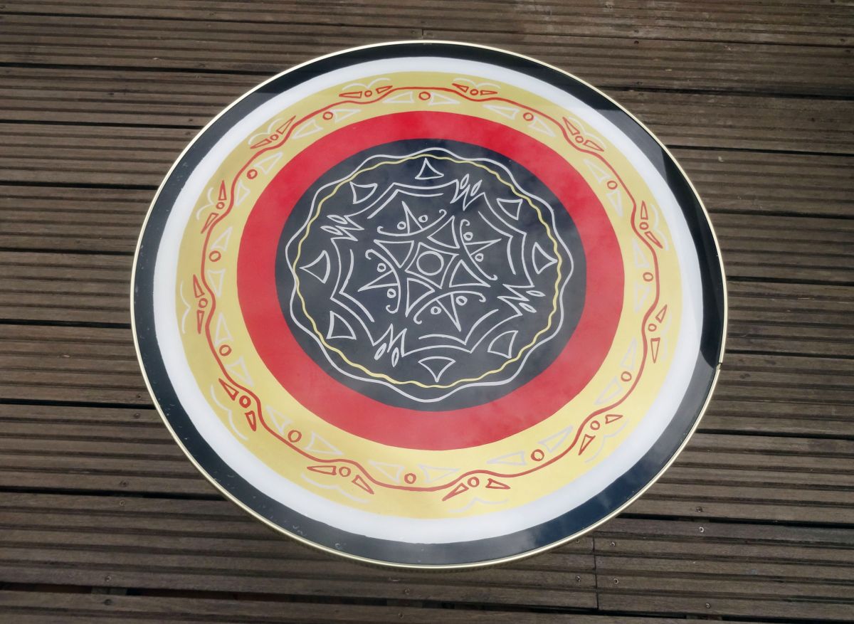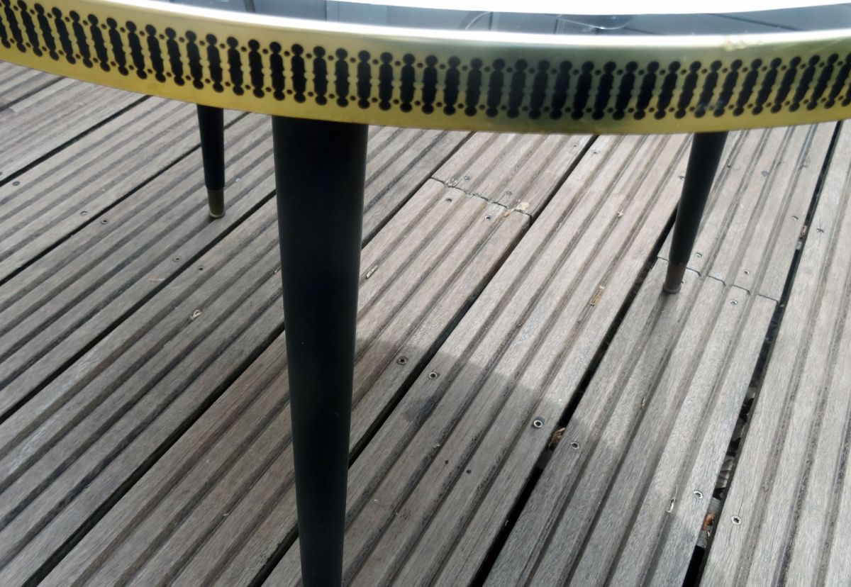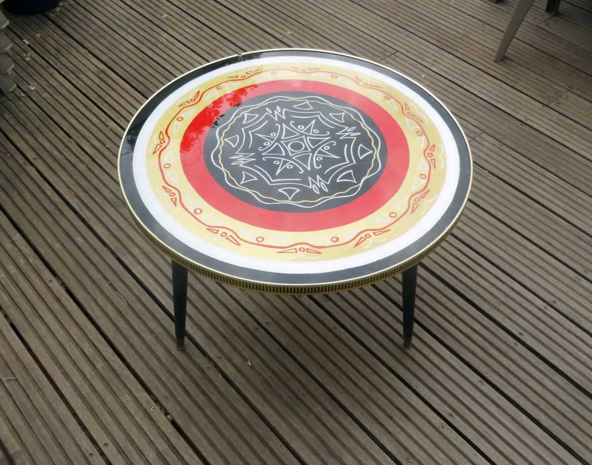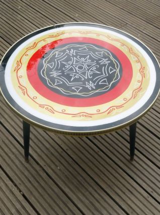 Jolie petite table basse ronde des années 50 ou 60 décorée d’un dessin abstrait de style tiki ou tatouage tribal dans des tons rouge, noir, doré et blanc. Le plateau de la table est en bois aggloméré peint (ou couvert d’un dessin sur papier?) protégé par une plaque de plexiglas (?) fixée par une ‘’ceinture’’ en plastique imprimé. Les pieds sont en bois peint noir avec une partie métallique (en cuivre?) à leur base. La table est solide et bien conçue. Il y a des traces d’humidité au dessous du plateau (voir photos) mais elles sont superficielles et n’ont pas fait gonfler ni déformé le bois. La table sera envoyée démontée (pieds dévissés) pour simplifier le transport.