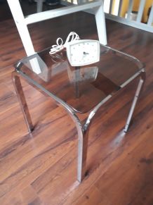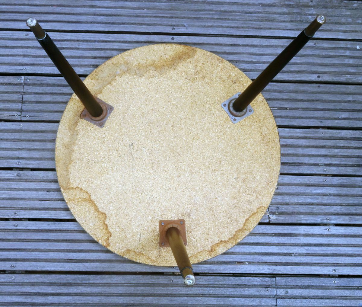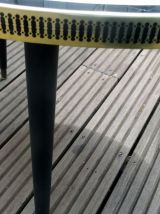 Dimensions: diamètre environ 58 cm, hauteur environ 43 cm. Très bon état d’usage, quelques traces au dessous du plateau (voir photos), il manque le joint en plastique de jonction de la "ceinture" sur environ 1cm.
