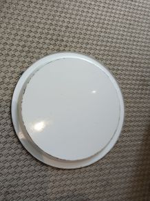 Dimensions: diamètre maxi environ 19cm, hauteur maxi environ 6,5cm. Bon état d'usage, pas de fêlure, un petit coup et quelques minuscules manques de teinte mauve au dessous (invisibles quand le cendrier est posé). Les "traces" sur les photos sont dues à des reflets!