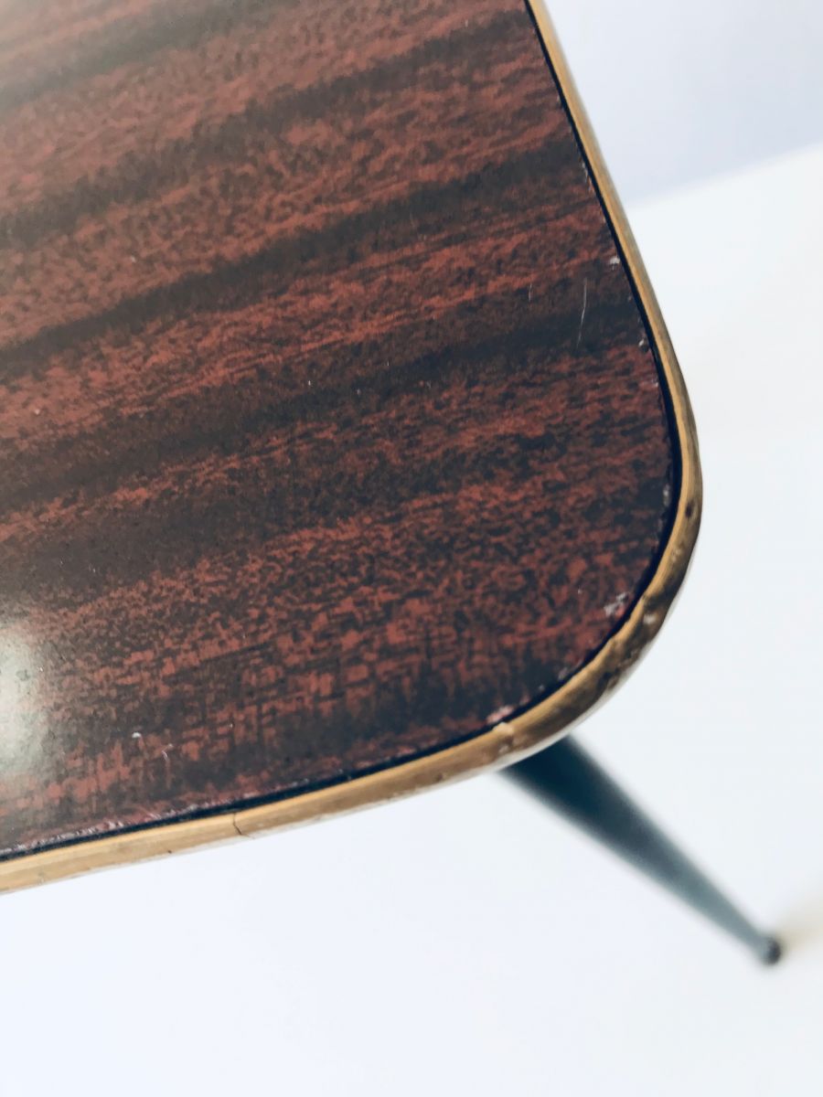 Jolie petite table d’appoint rectangulaire vintage. Cette table ou mini sellette est très décorative avec ces pieds compas en métal noir et laiton. Le plateau est en bois avec un joli placage d’origine et une finition laiton sur sur contour. Quelques traces d’usures présentes, sans incidence !