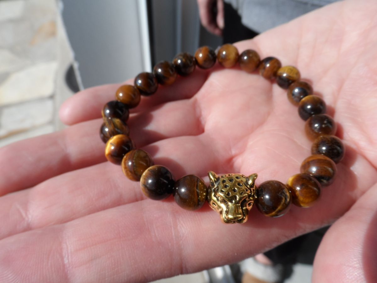 Bracelet ( Femme / Homme ) avec pierre oeil de tigre + breloque " tête de panthère "