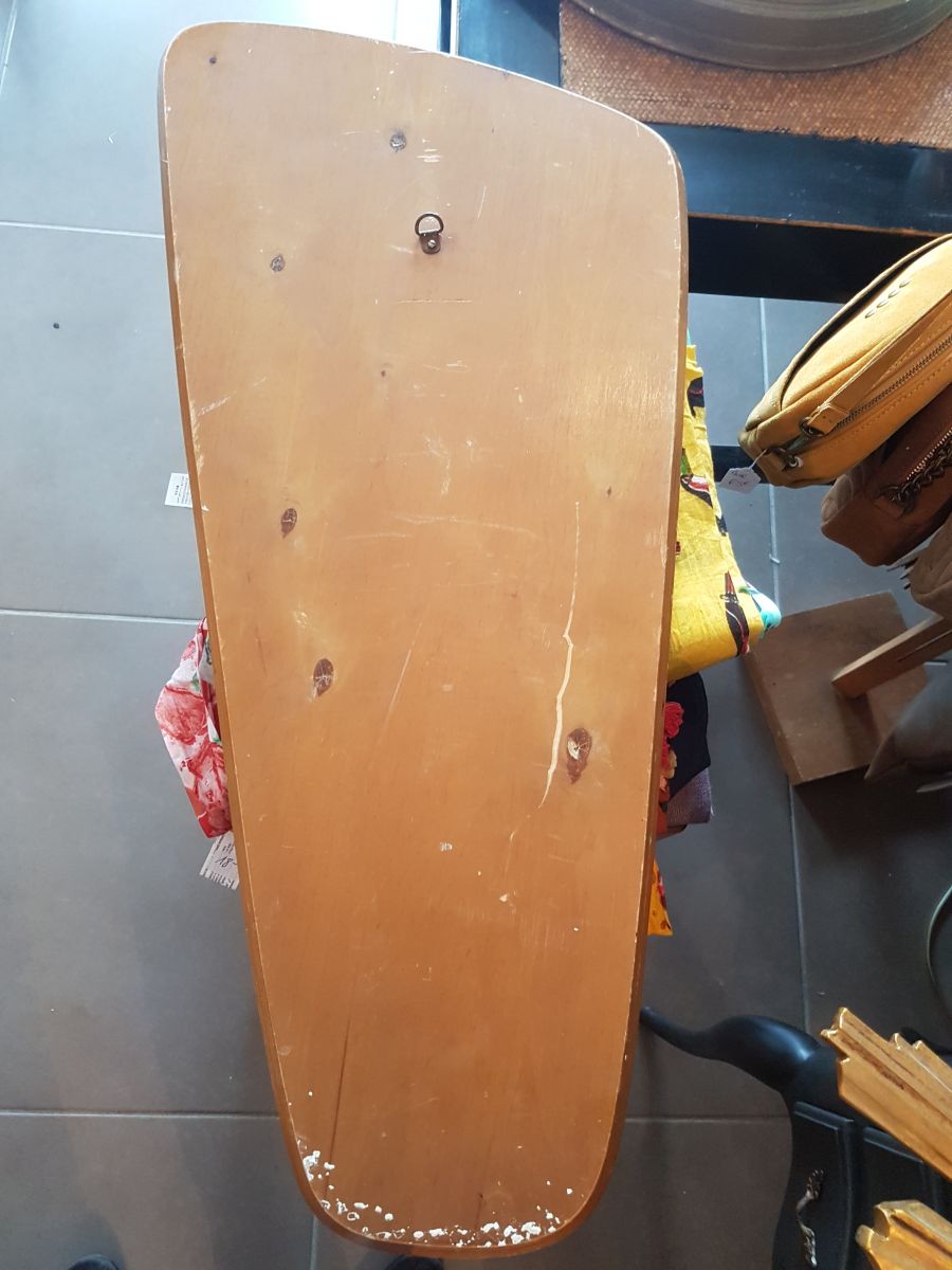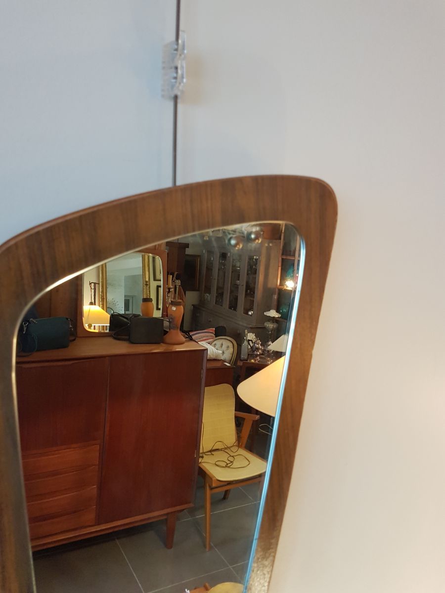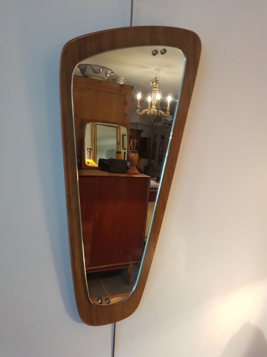 Miroir de forme libre ,monté sur un bois façon teck et retenu par 2 points en laiton en haut et en bas. En bon état.