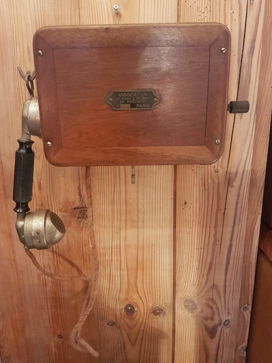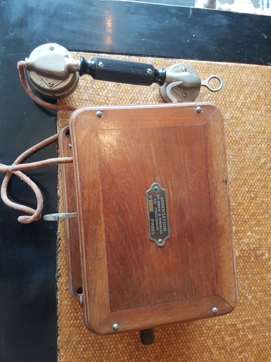 Téléphone mural de style industriel en acajou ,très déco avec la manivelle à droite et le récepteur à gauche.