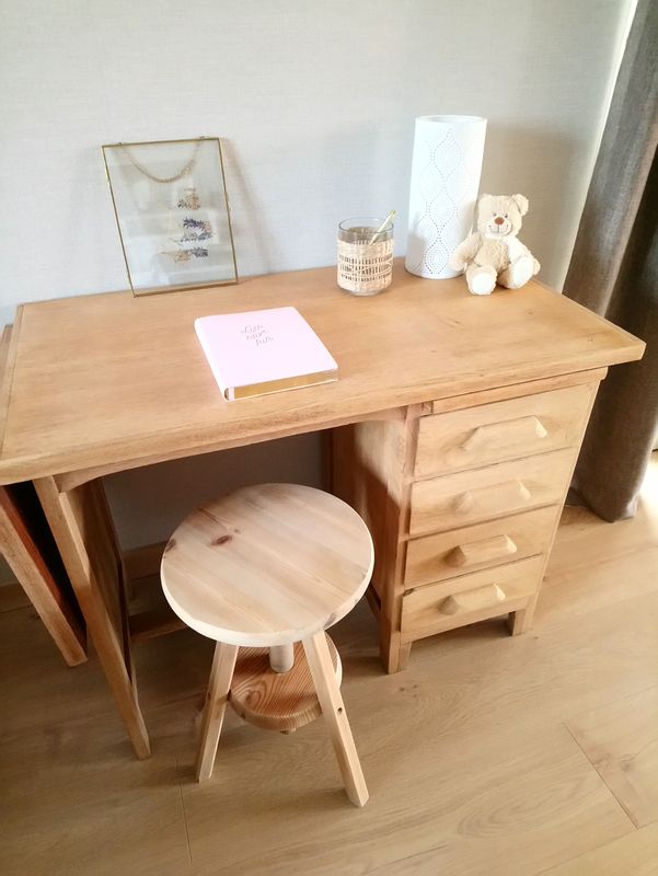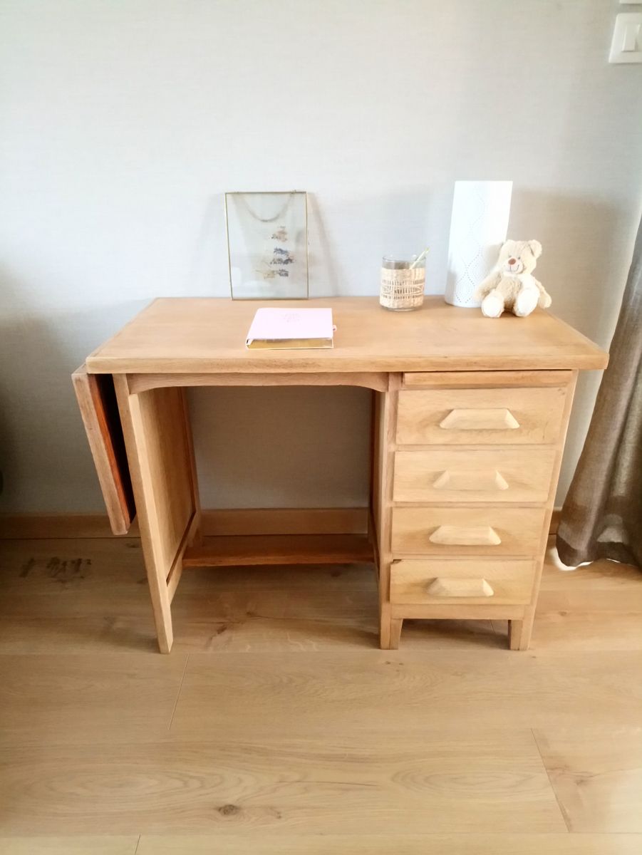 Charmant petit bureau vintage idéal pour un enfant de primaire. Il est typique des années 50,60 composé de 4 tiroirs et d'une tirette, et de sa rallonge latérale. Entièrement poncé au naturel, les plateaux sont vitrifiés antitache! Intérieur des tiroirs tapissé d'un joli papier décor "Papillons".