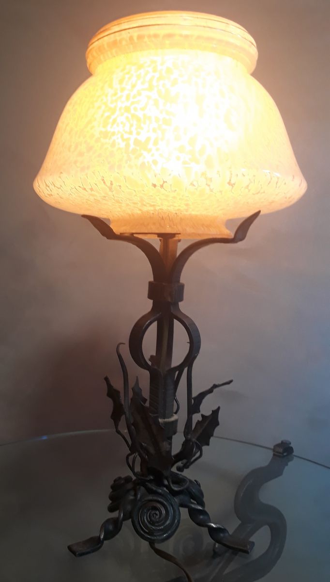 lampe fer forgé martelé avec spiral et torsades 1920 art deco , verre vichy rose