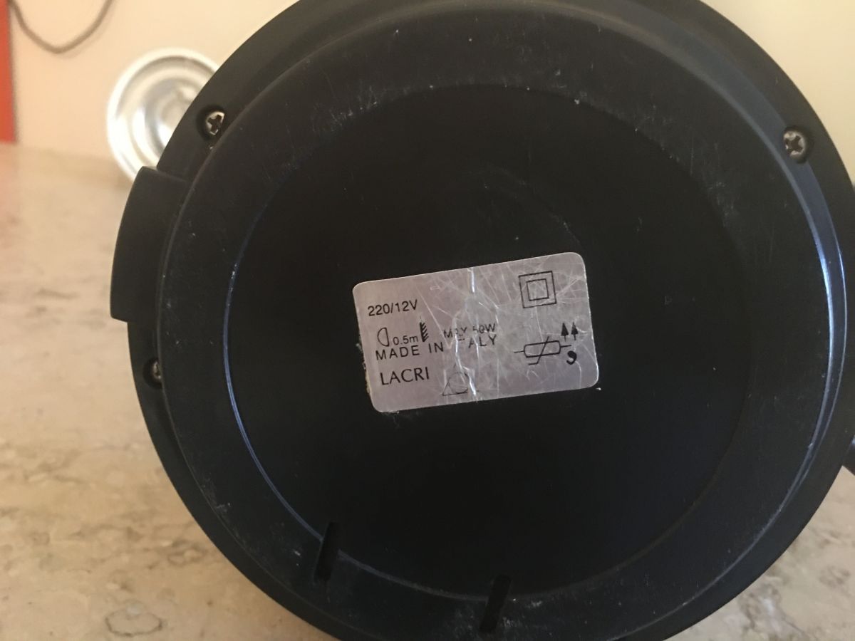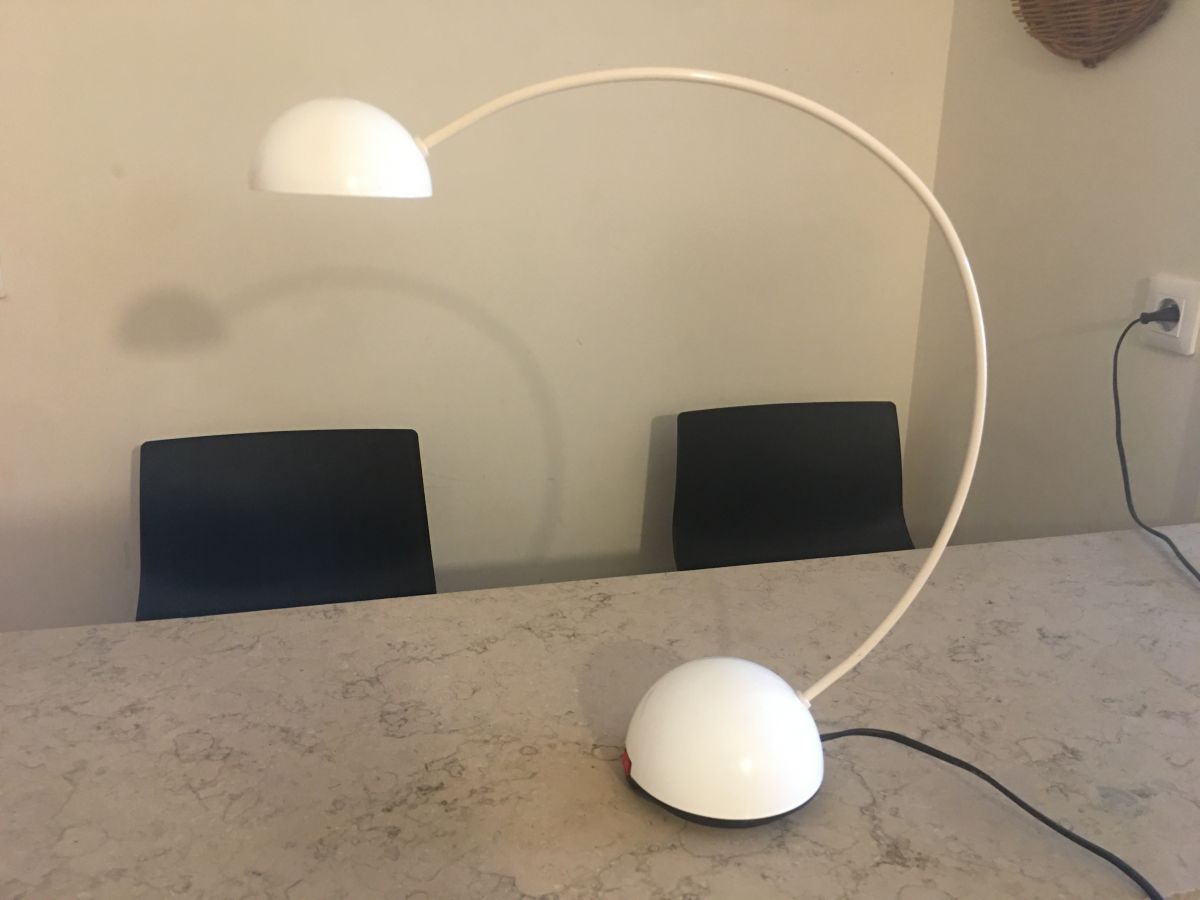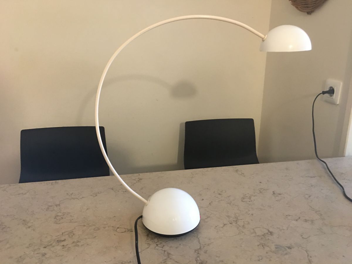 Lampe de bureau à poser des années 80 de la marque italienne Lacri, de couleur blanche, une fissure sur la base (voir photos) mais qui n’est pas préjudiciable pour l’esthétique ni pour la solidité et le parfait fonctionnement, en parfait état de marche, 2 positions pour 2 intensités lumineuses différentes, ampoule halogène brochée, abat-jour et socle demi-sphère, hauteur 42cm, profondeur 40cm, largeur base 12cm.