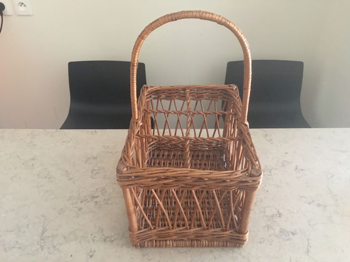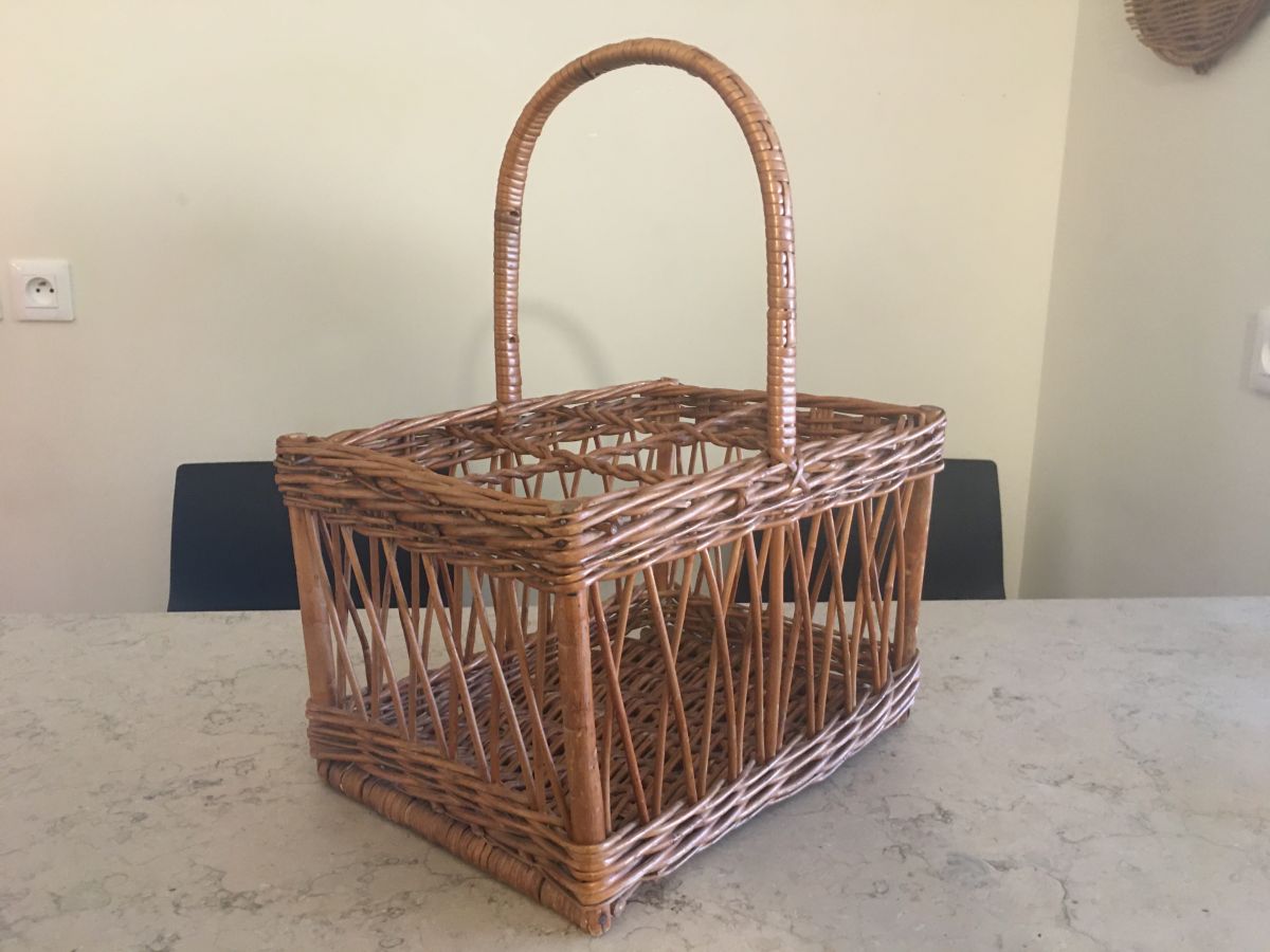 Porte-bouteilles en rotin des années 60, 6 emplacements, une infime trace blanche dans l’un des coins (voir photos), dimensions (cm) : L.32xH.40xP.23, bon état.