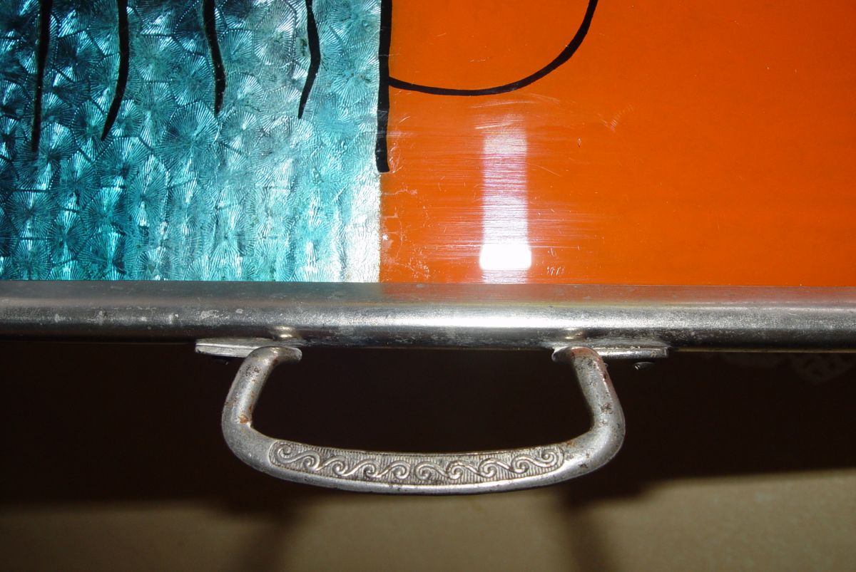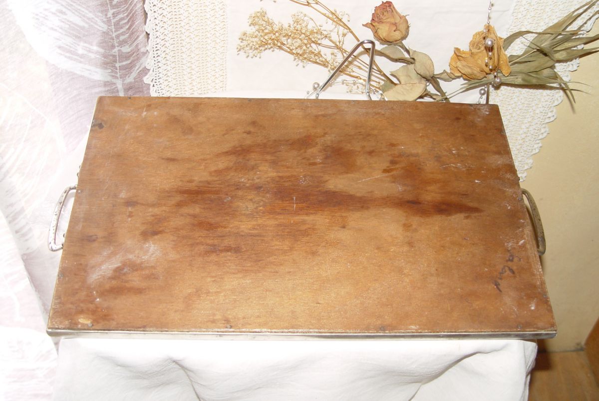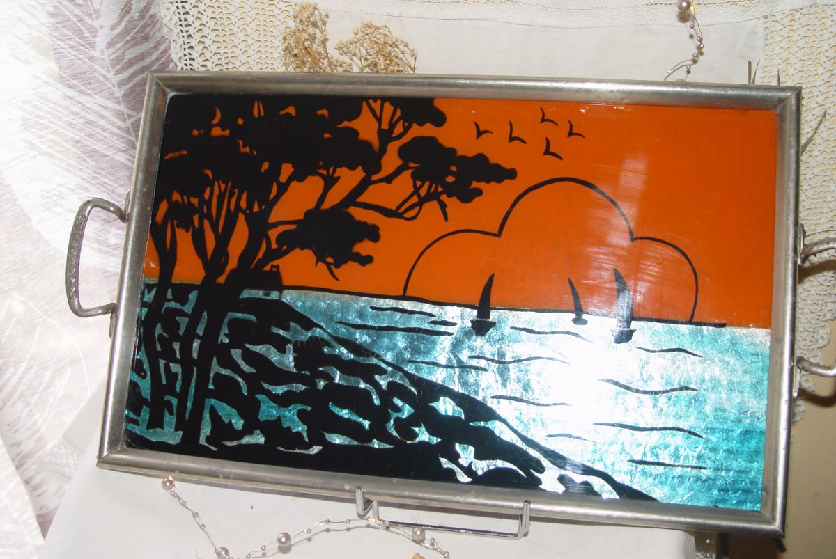 Voici un plateau Art Déco à l'encadrement de métal argenté au fond de verre sur bois peint.