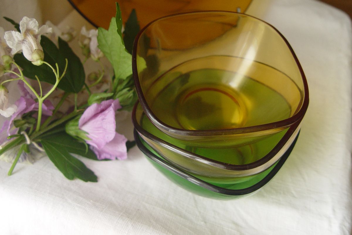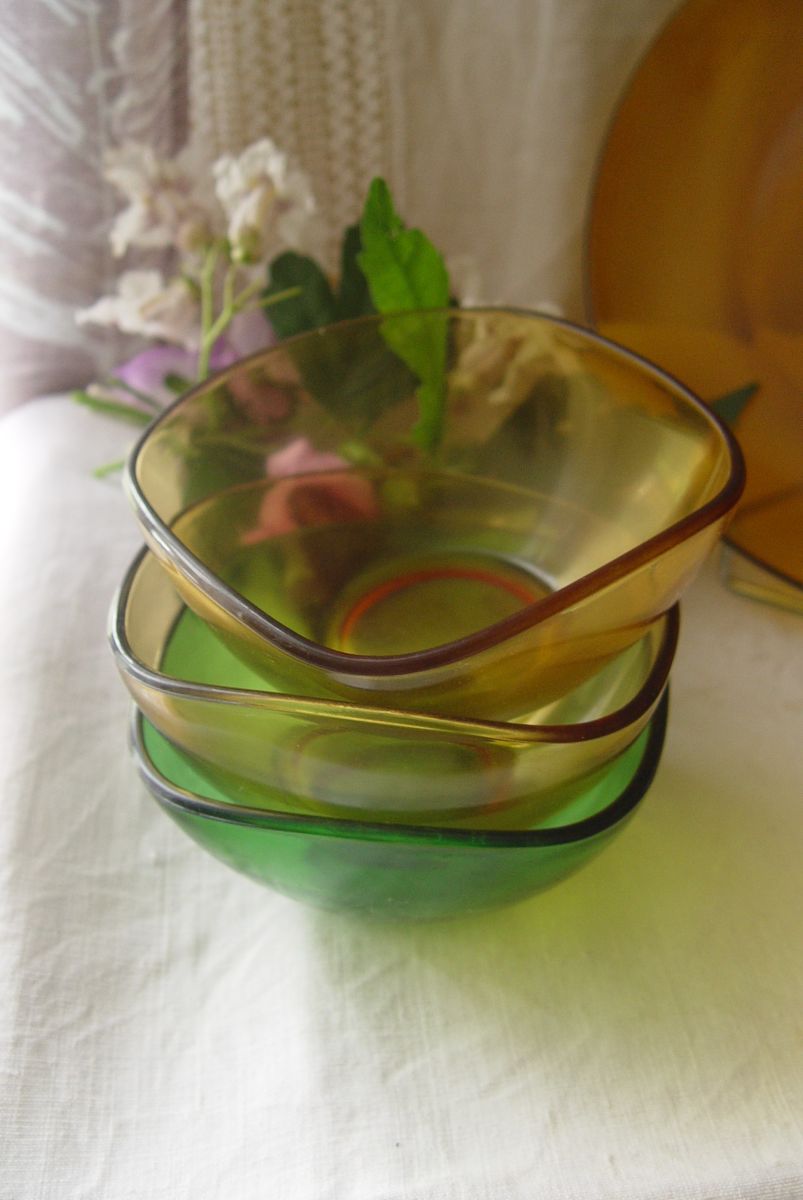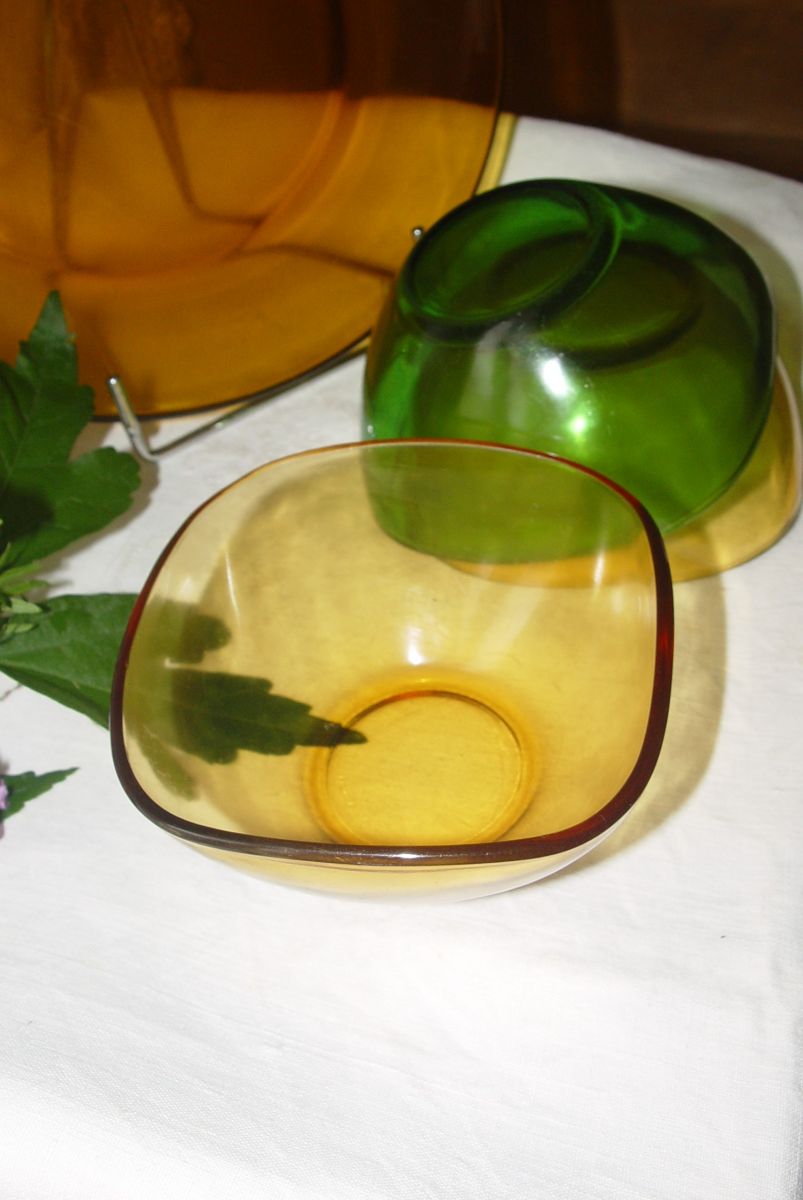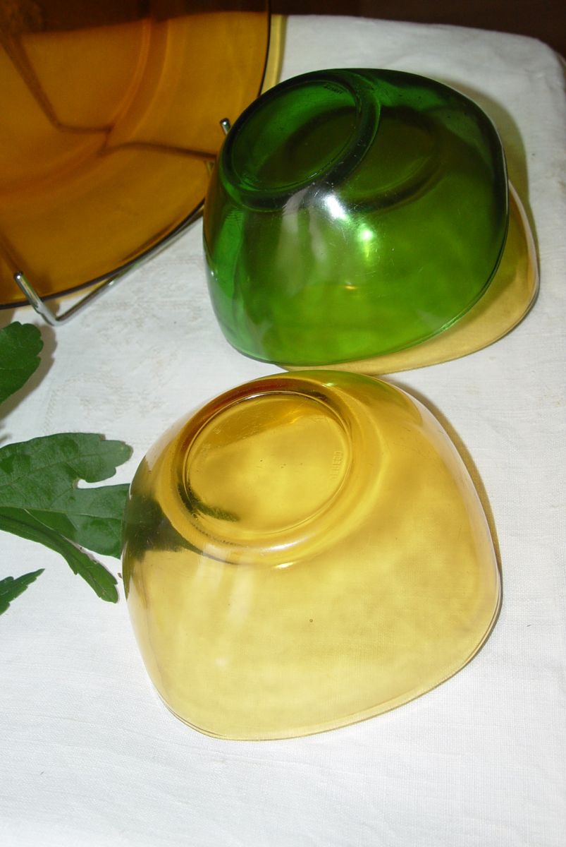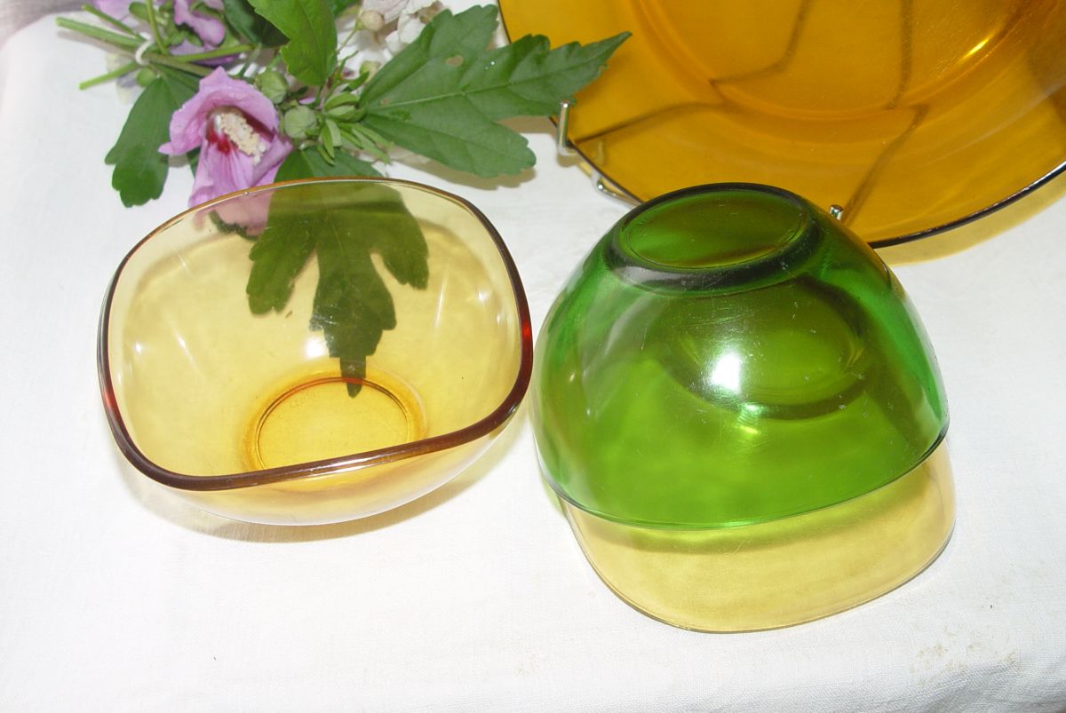 Voici 3 coupelles Duralex : 2 jaunes et une verte) Cette vaisselle était La Reine des buffets (en formica ou " Mado" bien-sûr...! )dans les années 60, réputée inrayable et (presque) incassable !