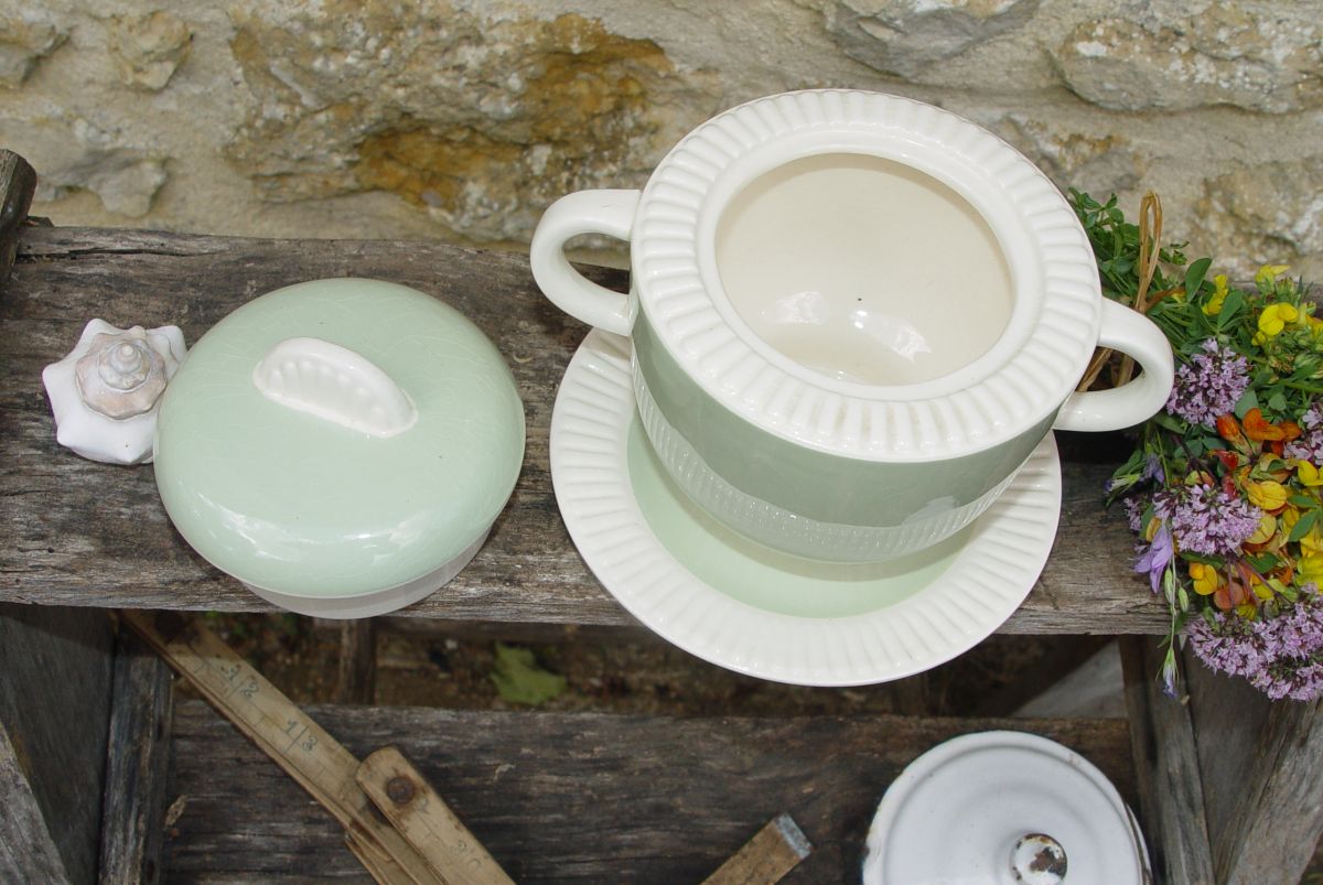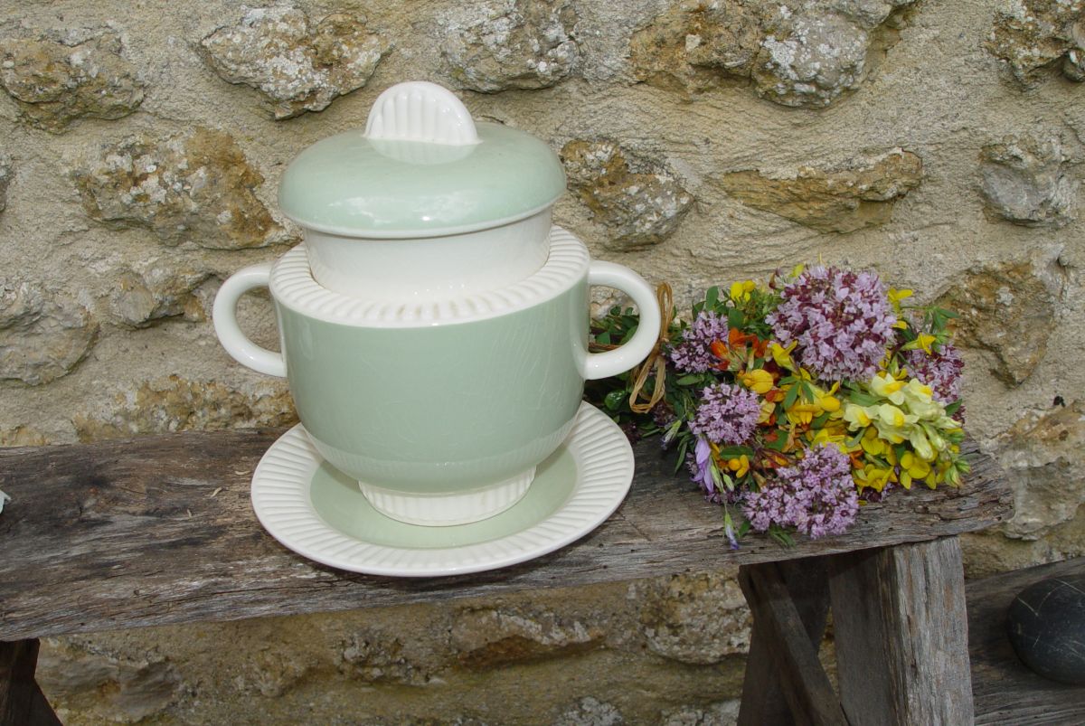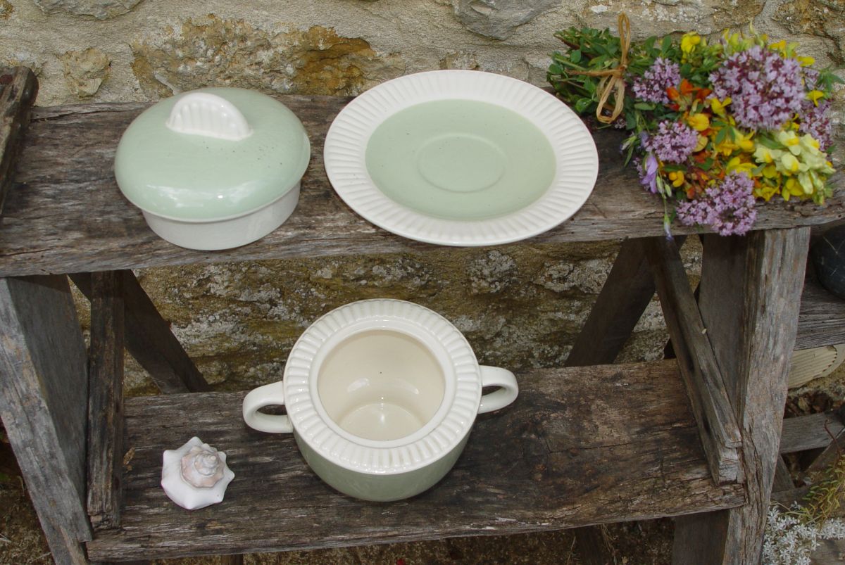 Voici un objet rare et adorable : un pot vide-poches Art déco dans les tons crème et vert menthe. Il est composé de trois éléments :